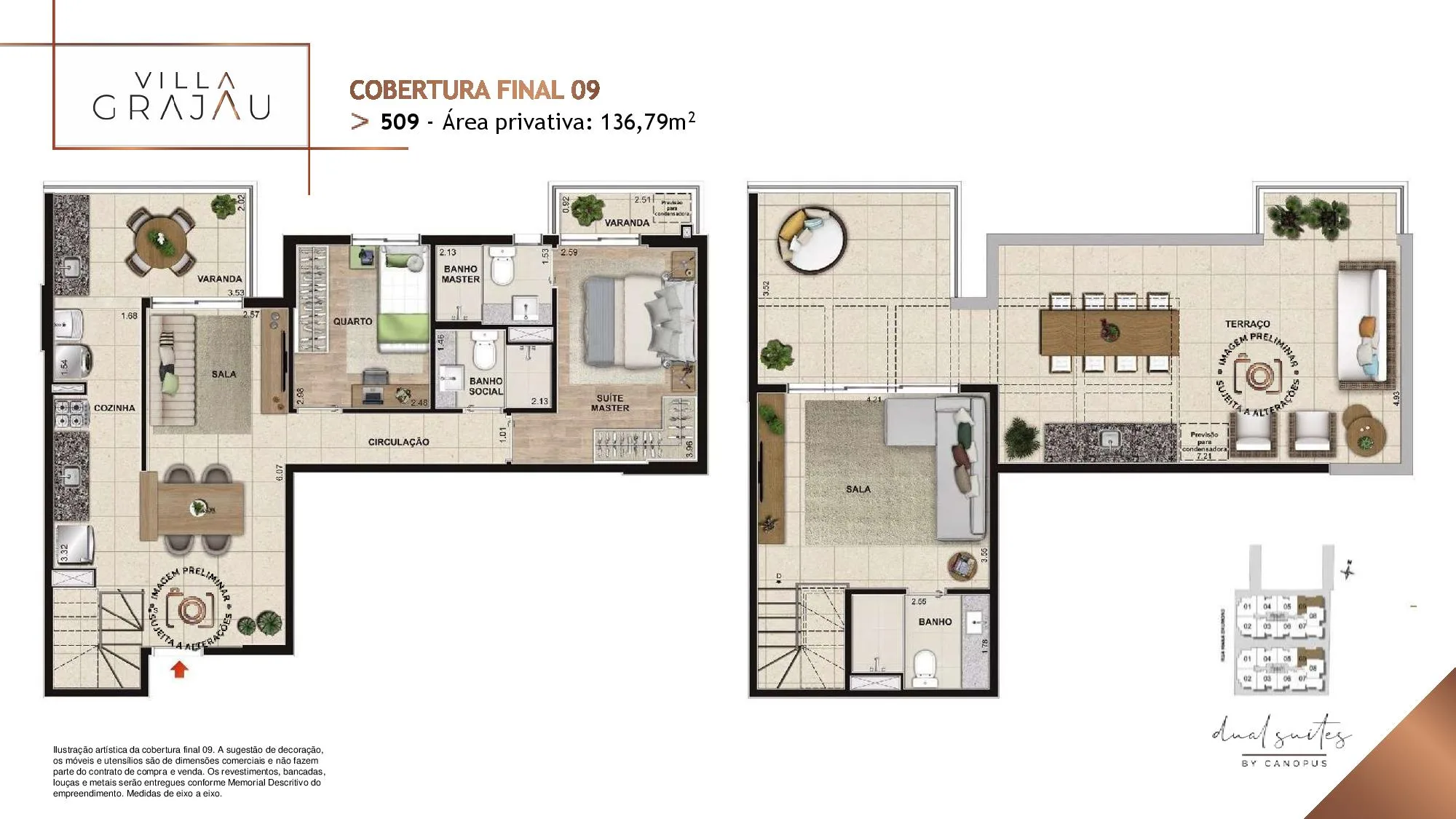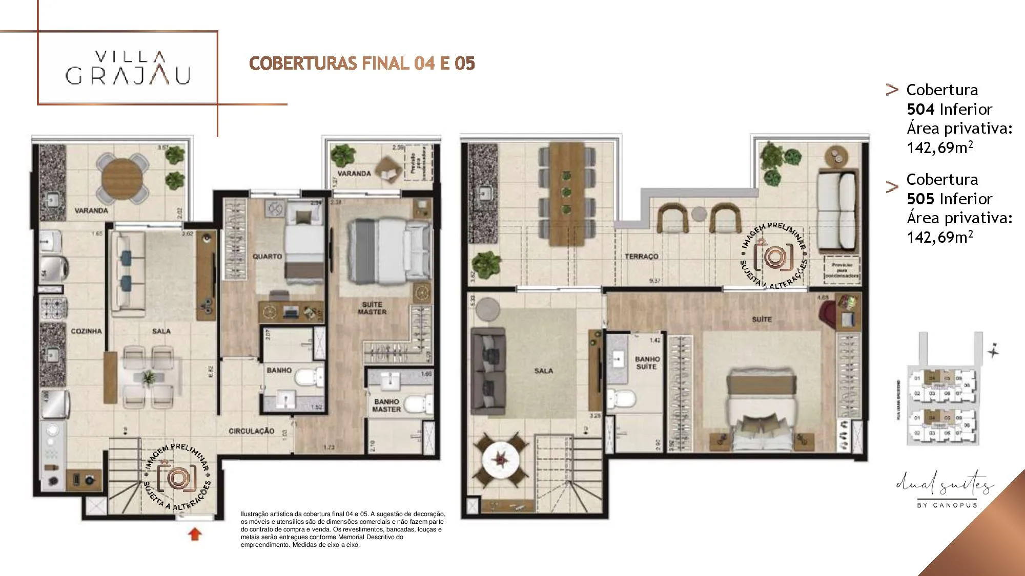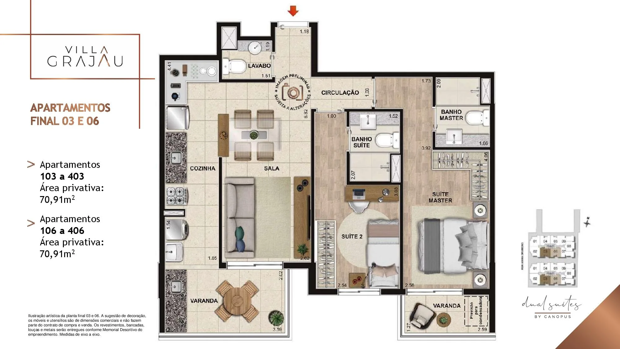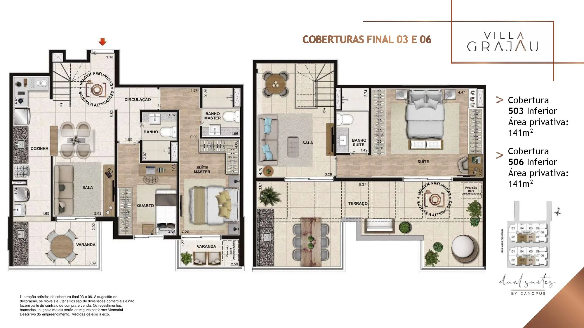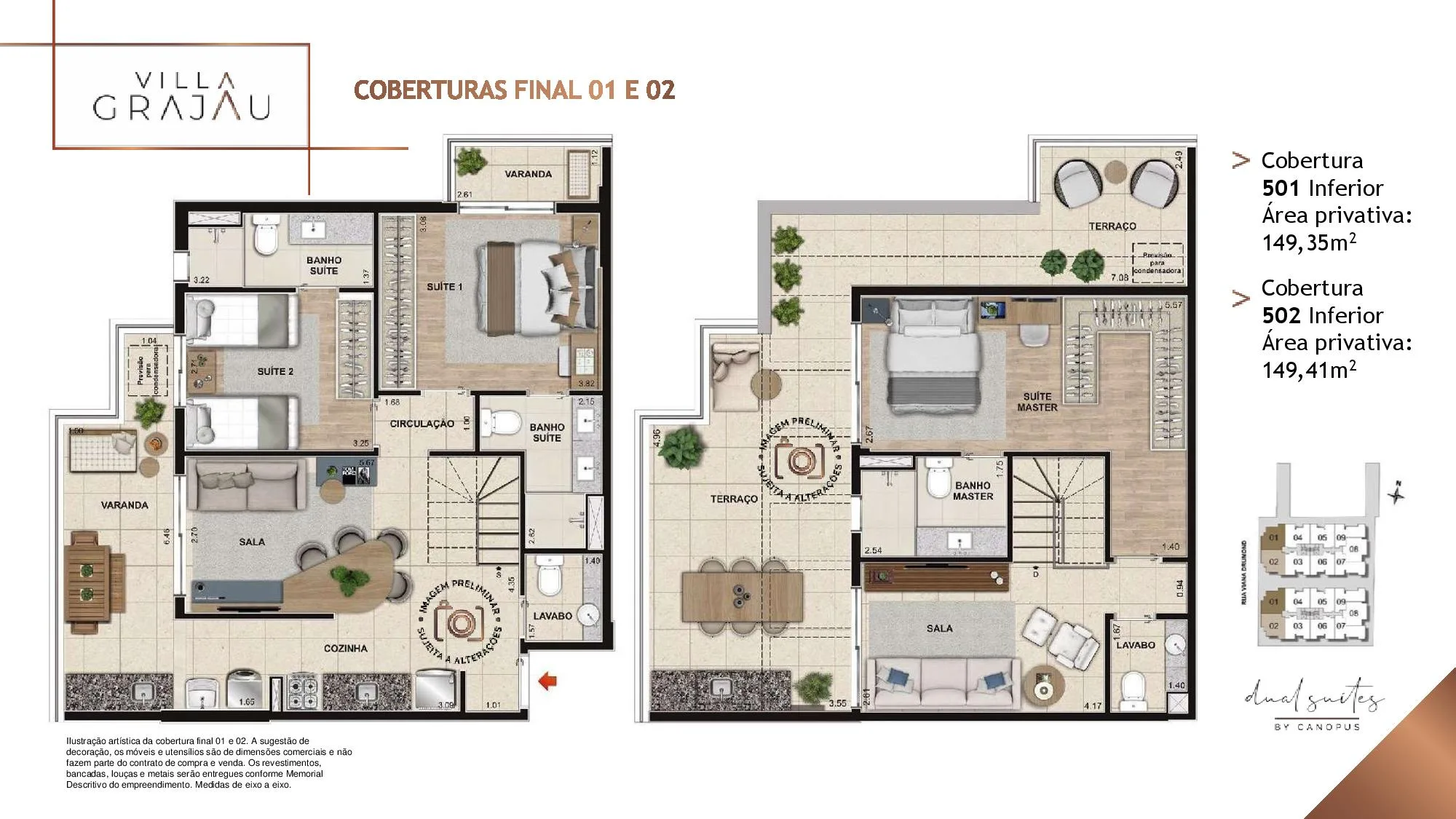 No Villa Grajaú as metragens dos Apartamento tipo partindo de 67 m² chegando a 74 m². Já as Coberturas Duplex são com Metragens de 135 m² chegando a 149 m². Todos os Apartamentos e Coberturas possuem 2 suítes, lavabo e vaga na garagem e 3 Quartos, 2 Suítes para a metragem de 149 m². O Villa Grajau Canopus conta com poucas Coberturas à venda.