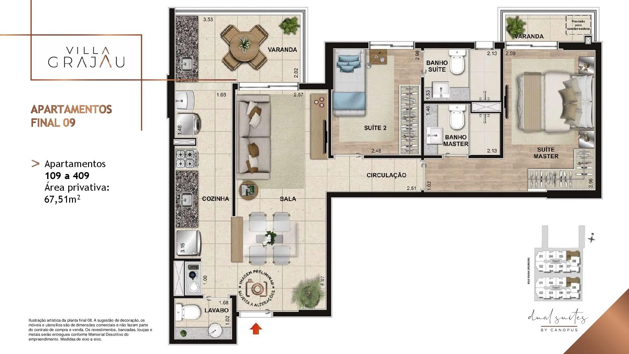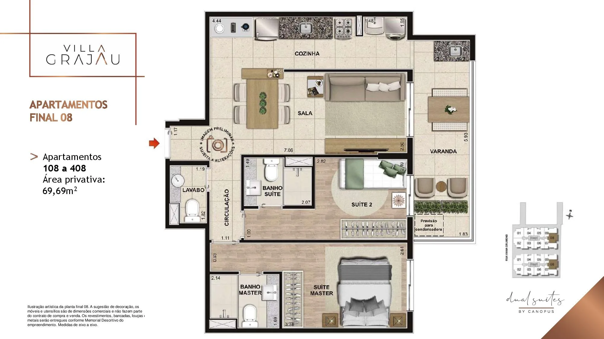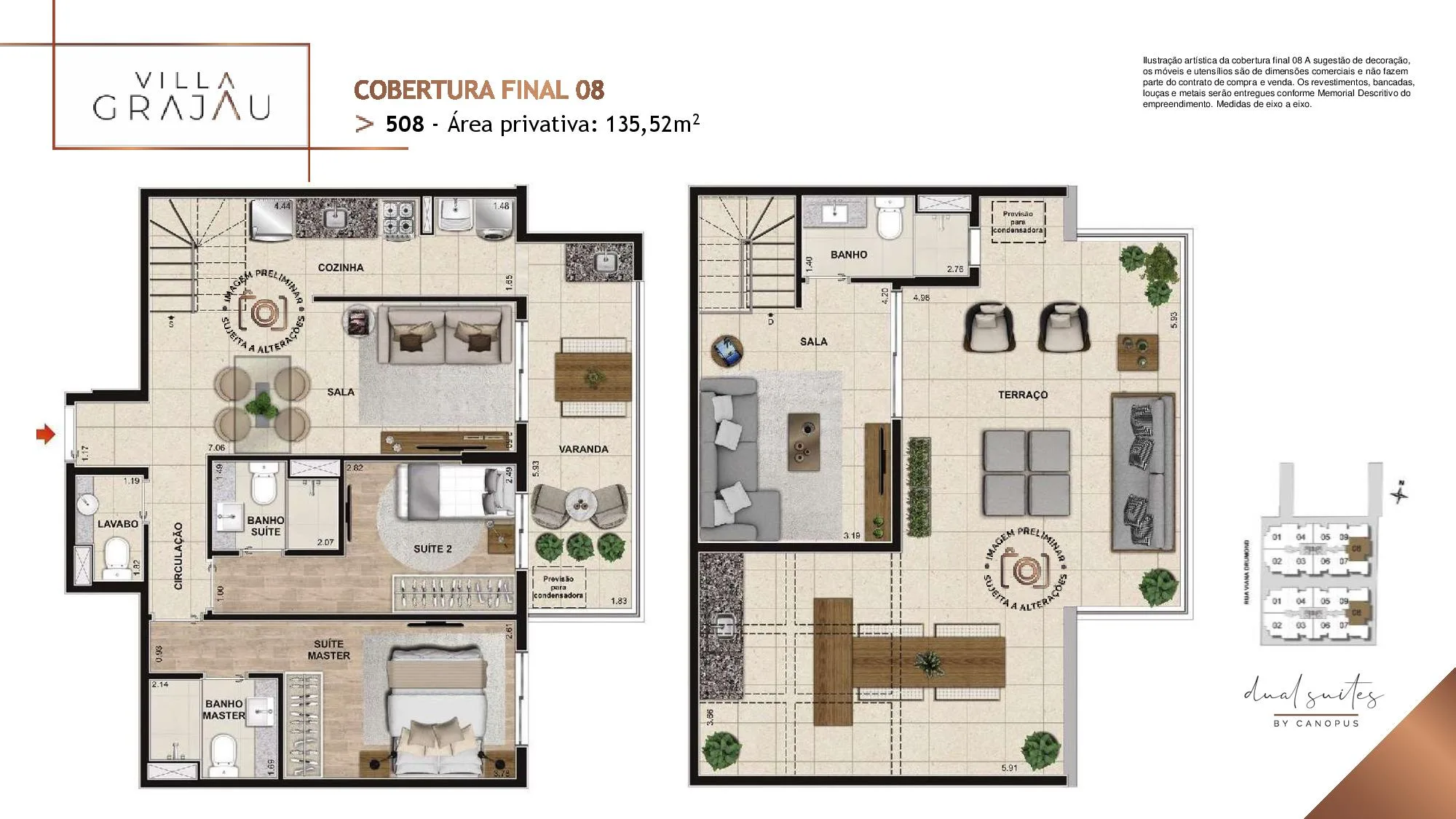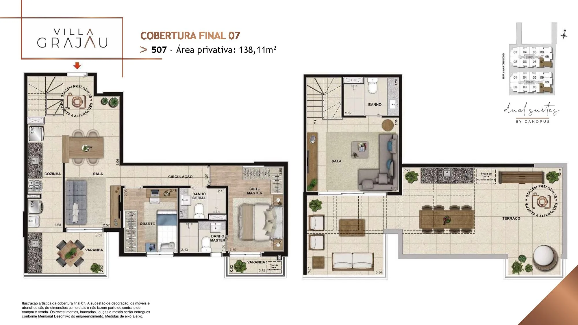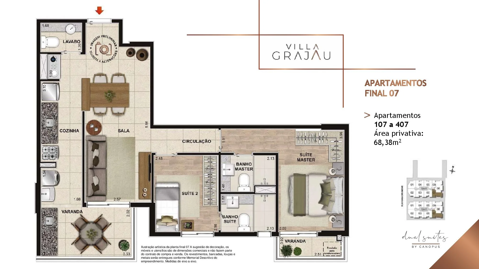 No Villa Grajaú as metragens dos Apartamento tipo partindo de 67 m² chegando a 74 m². Já as Coberturas Duplex são com Metragens de 135 m² chegando a 149 m². Todos os Apartamentos e Coberturas possuem 2 suítes, lavabo e vaga na garagem e 3 Quartos, 2 Suítes para a metragem de 149 m². O Villa Grajau Canopus conta com poucas Coberturas à venda.
