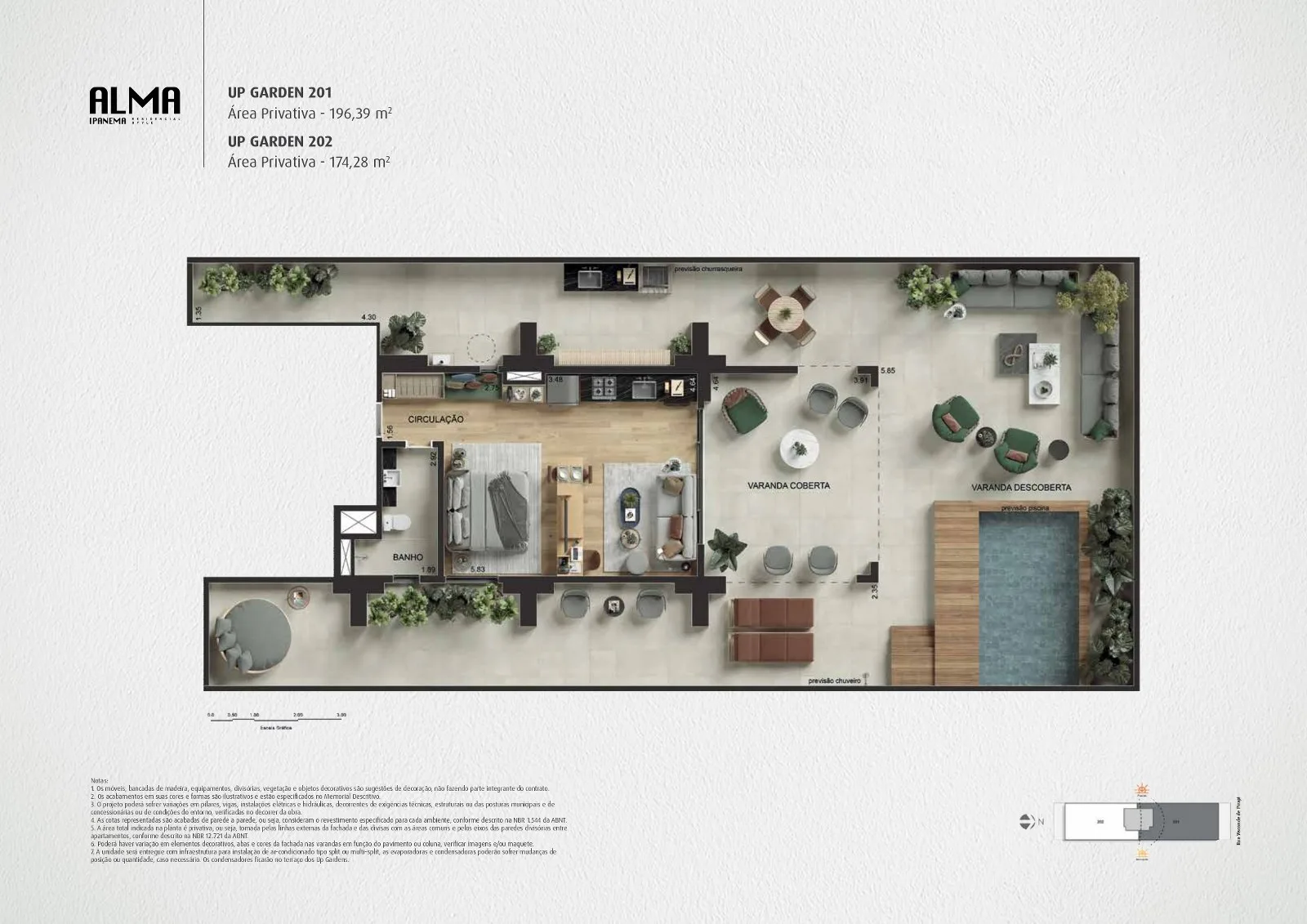 Os incríveis apartamentos up garden do Alma Ipanema são formulados para oferecer todo o conforto e comodidade essencial ao dia a dia. Suas metragens são amplas e variam de 174 m² a 196 m², em plantas com espaço interno otimizado e bem aproveitado. Os ambientes contam com um elegante design e acabamentos de alta qualidade. As unidades possuem 1 quarto, e excelente área de circulação entre a cozinha com área de serviço em anexo. A parte externa é composta por uma espaçosa varanda coberta que se conecta com um amplo terraço descoberto, com piscina e área gourmet com churrasqueira. Além disso, todos os imóveis são entregues com vagas reservadas no estacionamento do condomínio.