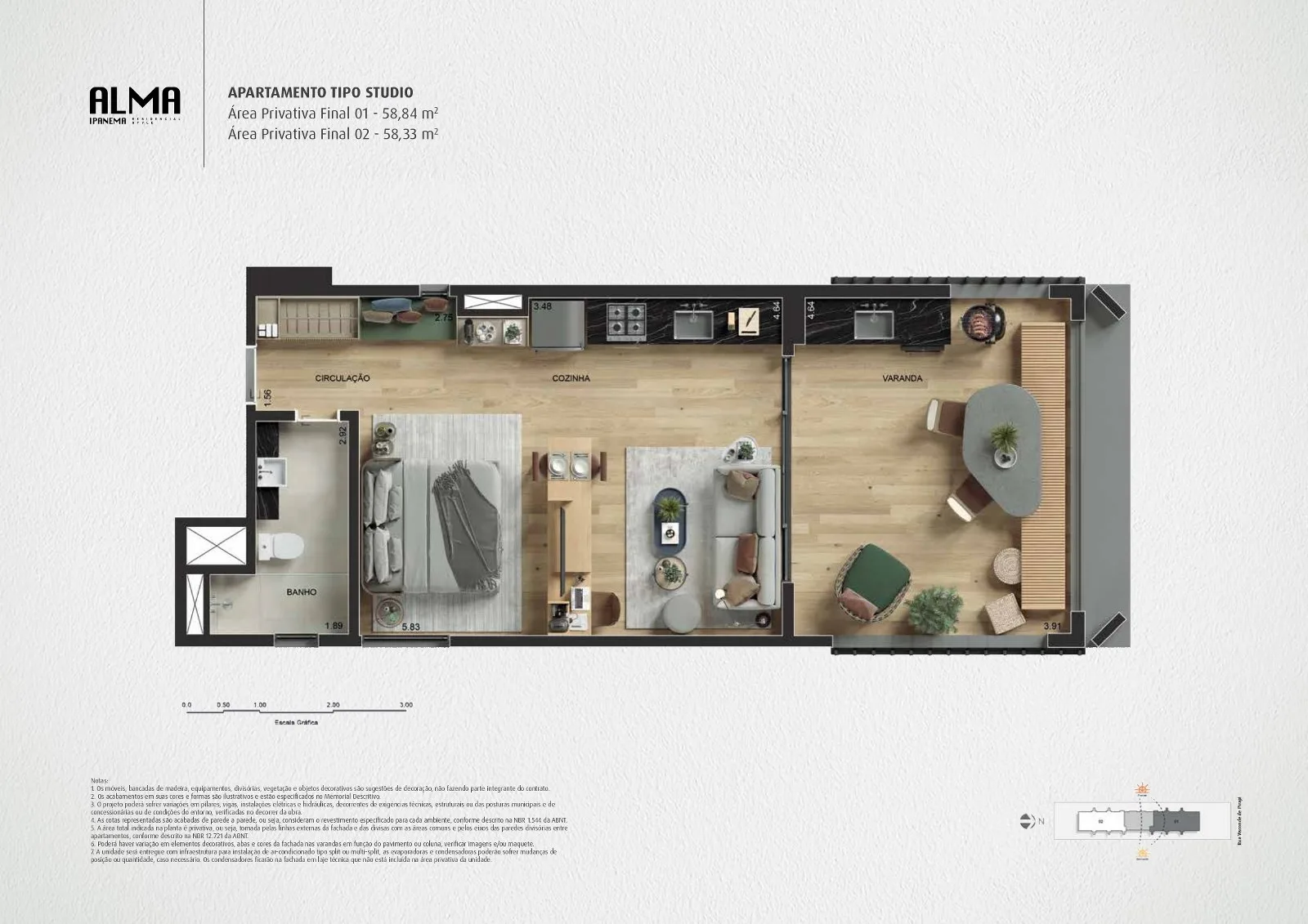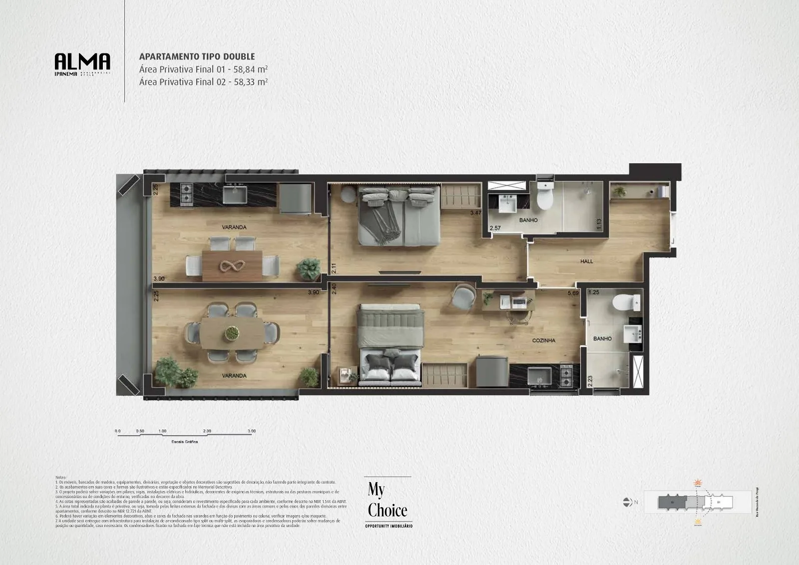 Os sofisticados apartamentos tipo que compõem o residencial Alma Ipanema apresentam plantas com cômodos otimizados e bem distribuídos no espaço interno do imóvel. As unidades residenciais possuem área total interna de 58 m², agradando a diversos perfis de moradores que buscam por um lar refinado e rico em detalhes. Os proprietários poderão solicitar modificações que desejarem para seu imóvel após a compra, pois a construtora que lidera o projeto costuma oferecer a personalização de plantas em seus empreendimentos, o que inclui a possibilidade de divisão para que as unidades disponham de double suítes. O condomínio, cuja infraestrutura é focada no conforto e bem-estar, disponibiliza garagem com vagas para todos os imóveis, sistema de segurança moderno e espaços de lazer que agradam a todas as faixas etárias.