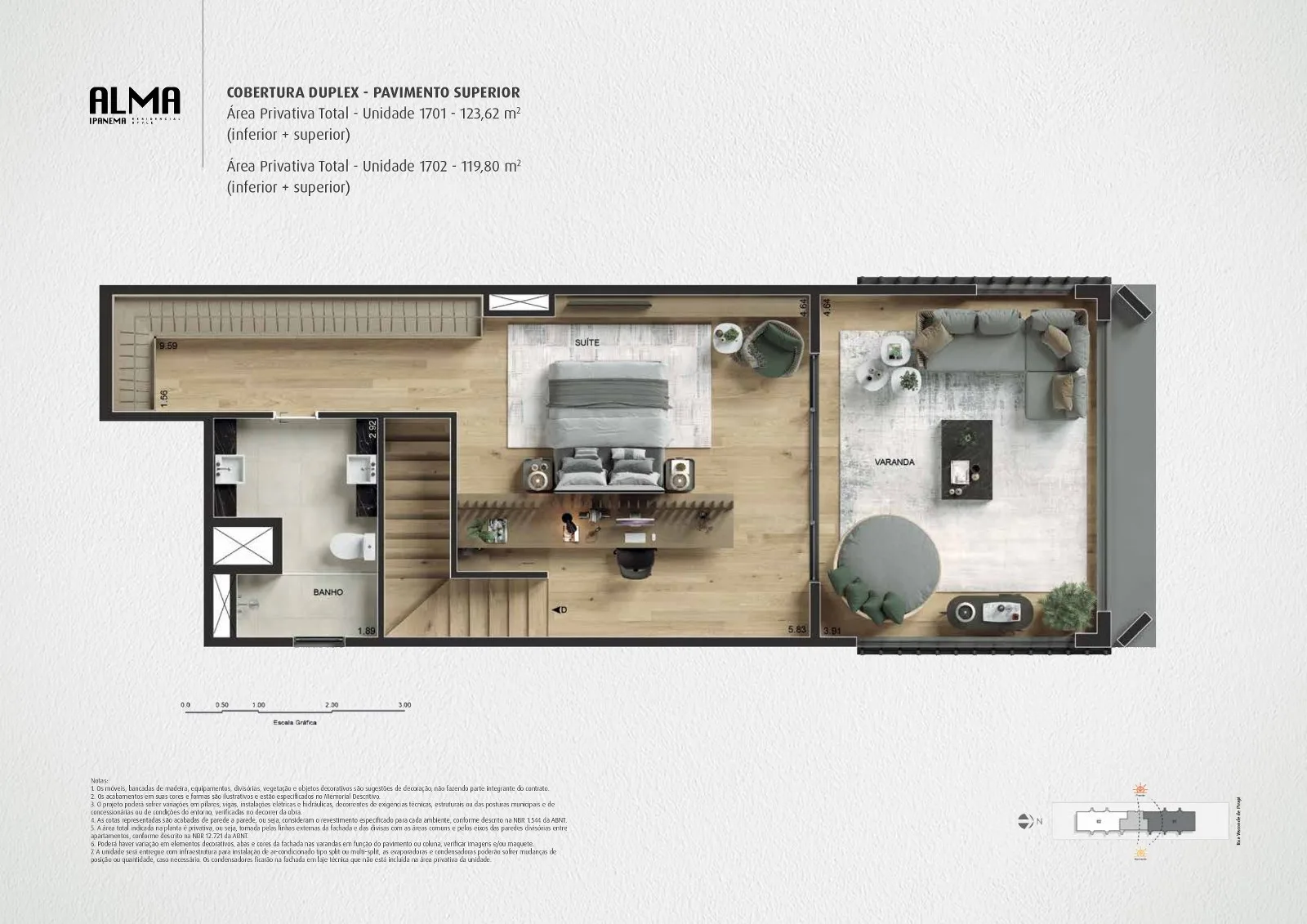 As coberturas duplex do residencial Alma Ipanema apresentam plantas em layout moderno, cuja distribuição de cômodos em seu interior é pensada para oferecer liberdade e boa privacidade entre os ambientes. Os imóveis serão apresentados em metragem de 119 m², que atende às expectativas e necessidades daqueles que buscam por um imóvel cheio de espaço juntamente com a exclusividade e sofisticação de residir em uma cobertura. As unidades residenciais possuem uma ampla suíte em seu pavimento superior e vistas deslumbrantes para as belezas da região. Os proprietários terão direito a uma infraestrutura condominial completa que inclui projeto de segurança reforçado, estacionamento com vagas para todos os imóveis, espaços de lazer para todas as faixas etárias e alguns serviços exclusivos para facilitar o dia a dia de todos.