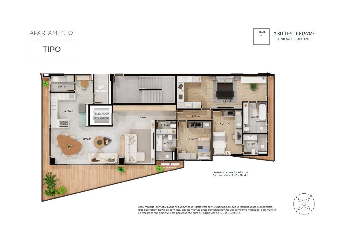 O empreendimento oferece apartamentos de 190 m² e 191 m², com 3 suítes, além de penthouses de 356 m² com 4 suítes. Todas as unidades possuem vagas de garagem e plantas amplas.