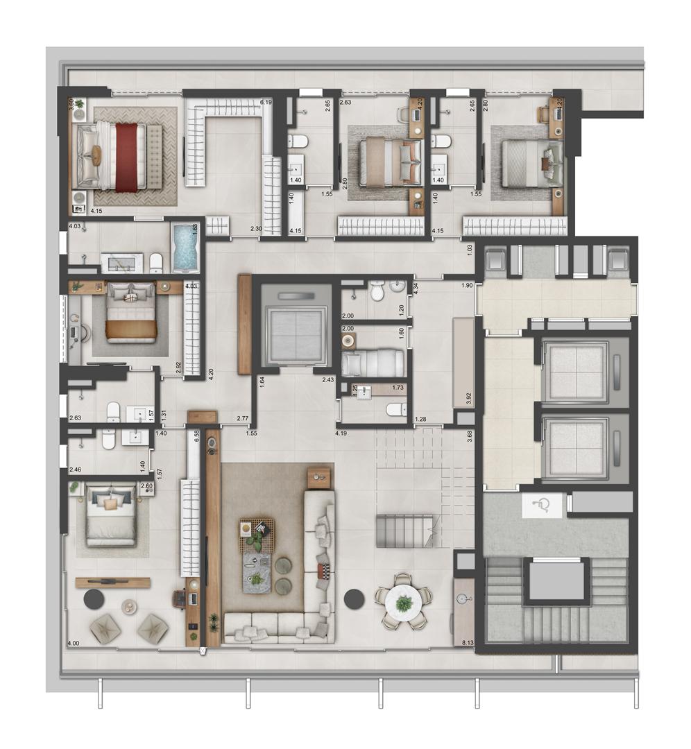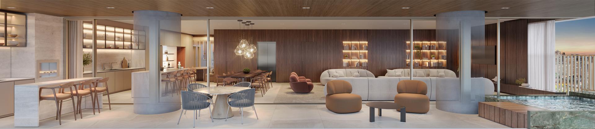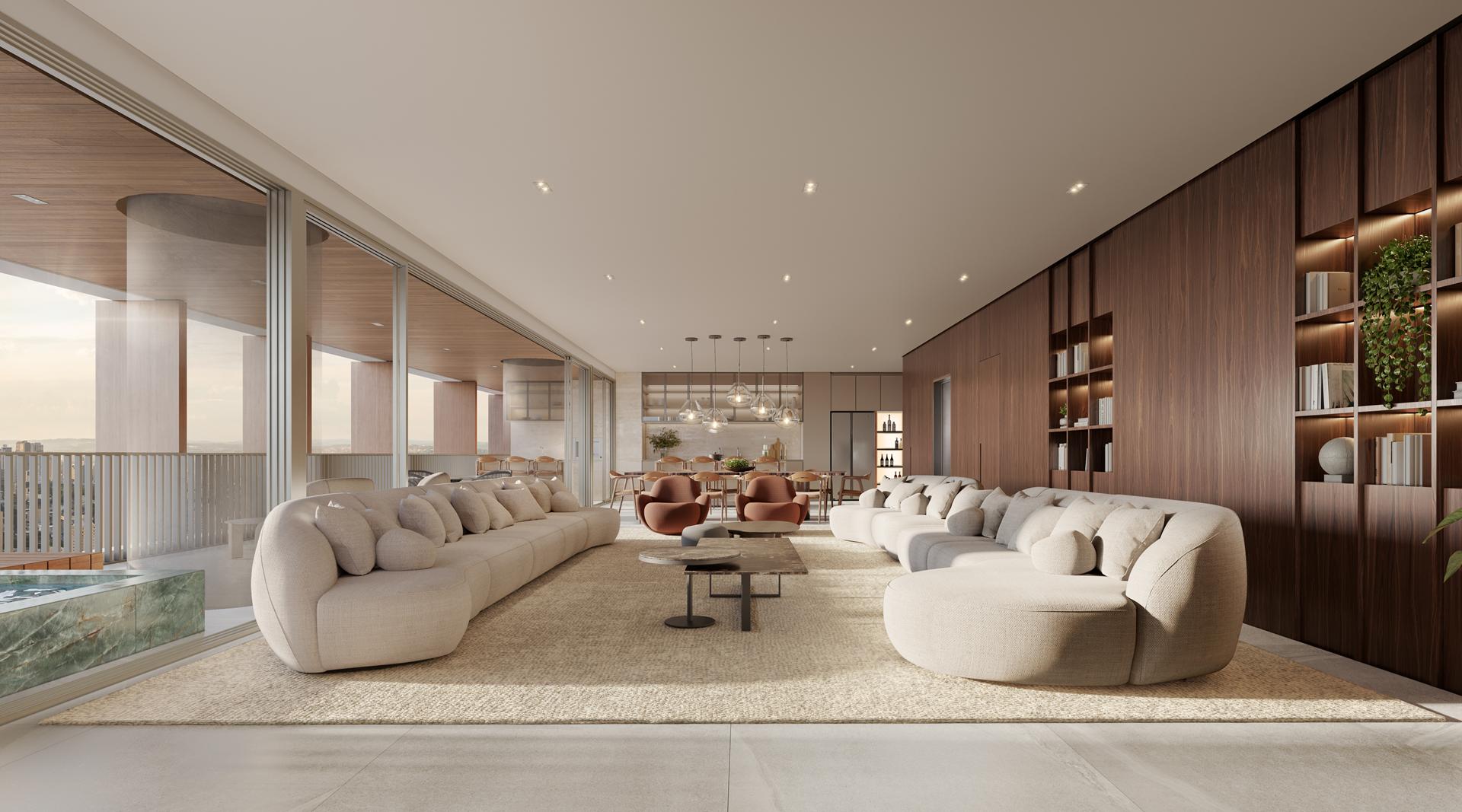 As coberturas duplex do Autêntico Residencial apresentam metragens entre 530 m² e 649 m², reunindo amplas áreas sociais, suítes espaçosas e vagas de garagem. Os destaques incluem integração de ambientes, generosas aberturas, possibilidade de áreas abertas e alto padrão de acabamento. São unidades pensadas para quem busca amplitude e privacidade em níveis superiores.
