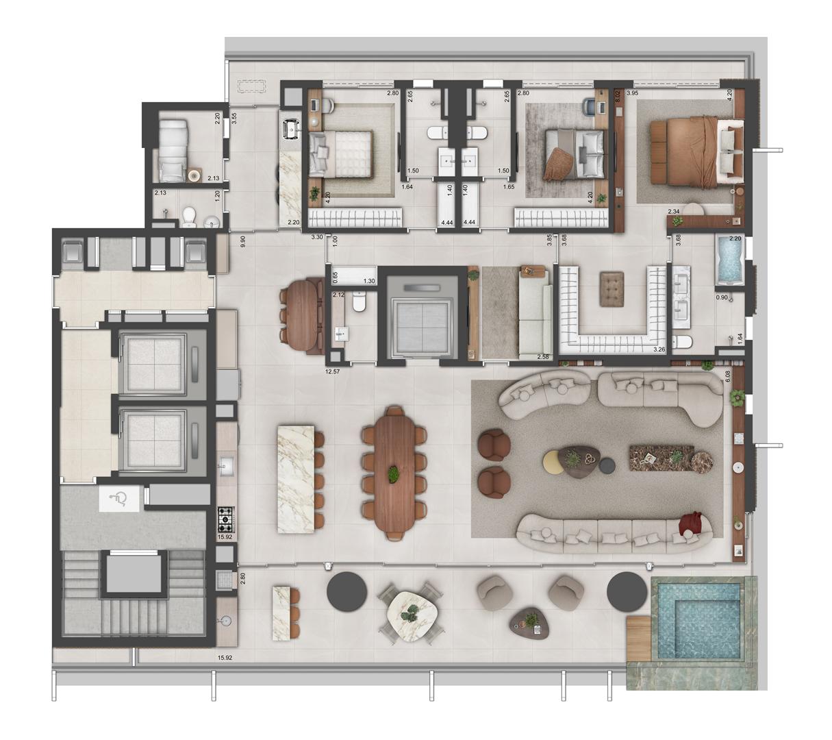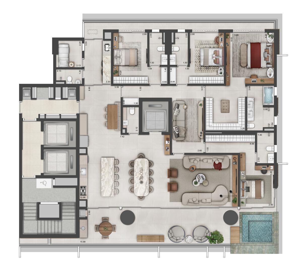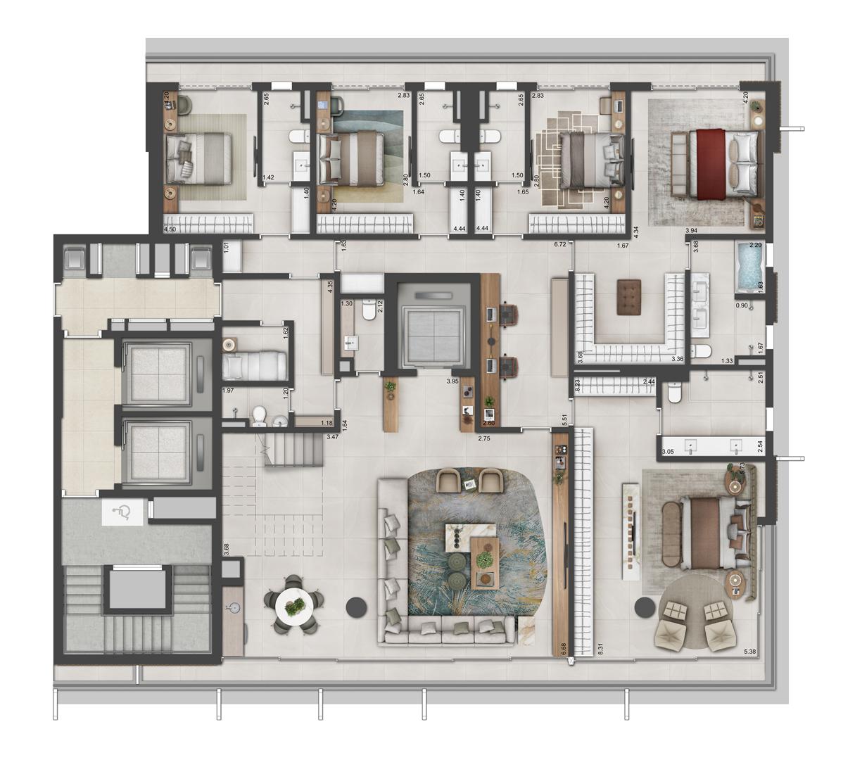 As coberturas duplex do Autêntico Residencial apresentam metragens entre 530 m² e 649 m², reunindo amplas áreas sociais, suítes espaçosas e vagas de garagem. Os destaques incluem integração de ambientes, generosas aberturas, possibilidade de áreas abertas e alto padrão de acabamento. São unidades pensadas para quem busca amplitude e privacidade em níveis superiores.