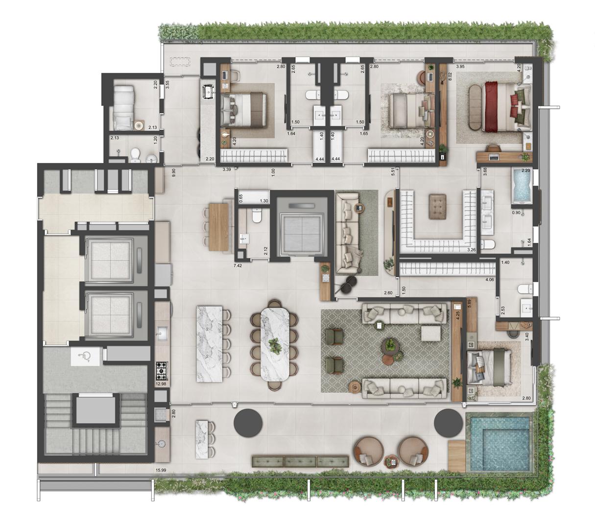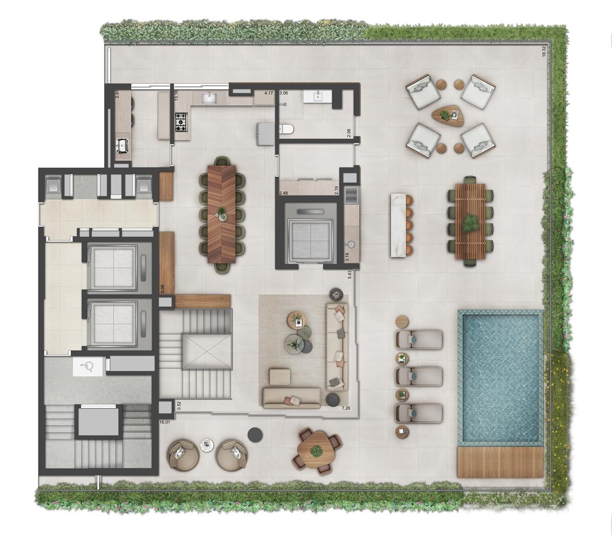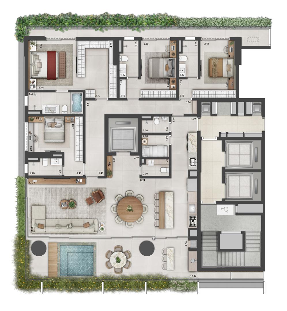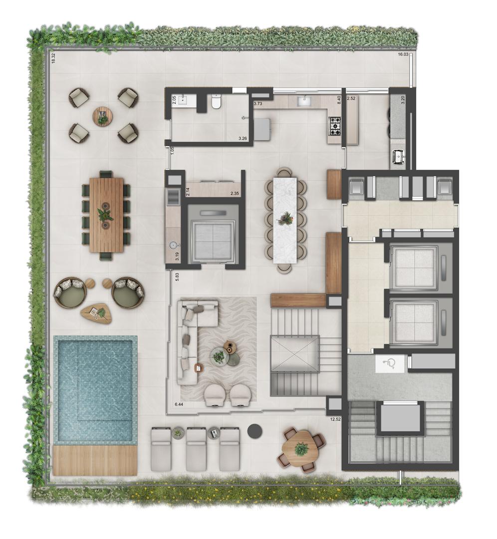 Os apartamentos garden do Autêntico Residencial variam de 274 m² a 330 m², reunindo áreas externas exclusivas e plantas amplas. Com múltiplas suítes, vagas de garagem e ambientes integrados, oferecem a sensação de casa com a segurança de condomínio. Os acabamentos seguem o padrão elevado do projeto, complementados por janelas amplas e excelente distribuição interna.
