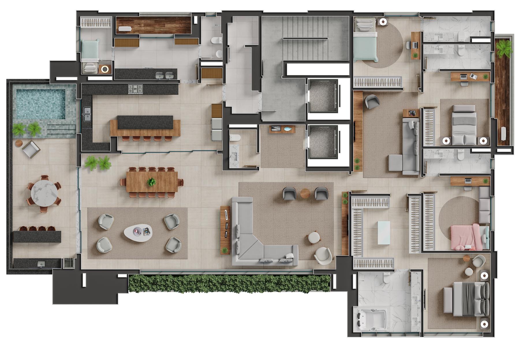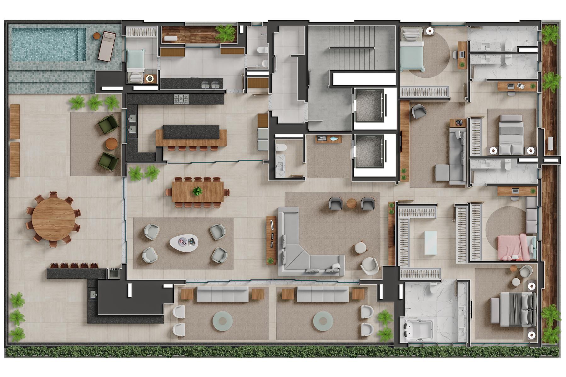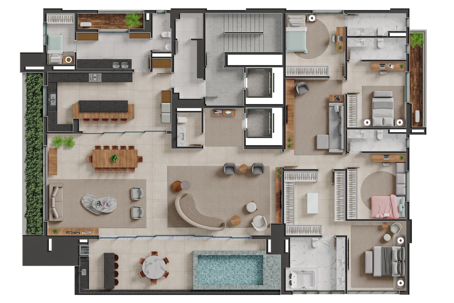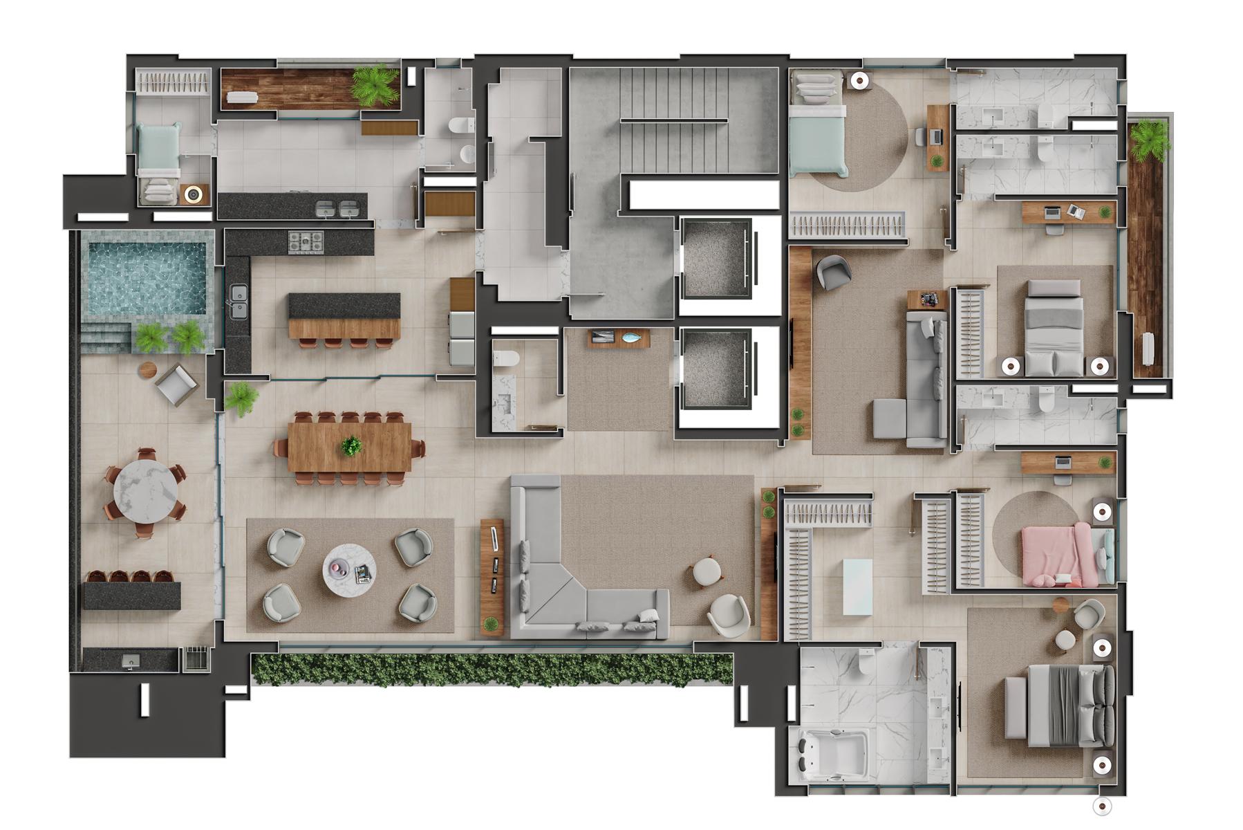 Os apartamentos garden do Bauhaus possuem metragem de 550 m² e contam com 4 suítes. Essa tipologia oferece áreas externas privativas integradas aos ambientes sociais, proporcionando maior amplitude e contato com áreas verdes. As unidades apresentam varanda gourmet, piscina privativa, acabamentos de alto padrão e distribuição inteligente dos espaços, mantendo a identidade arquitetônica moderna do empreendimento.