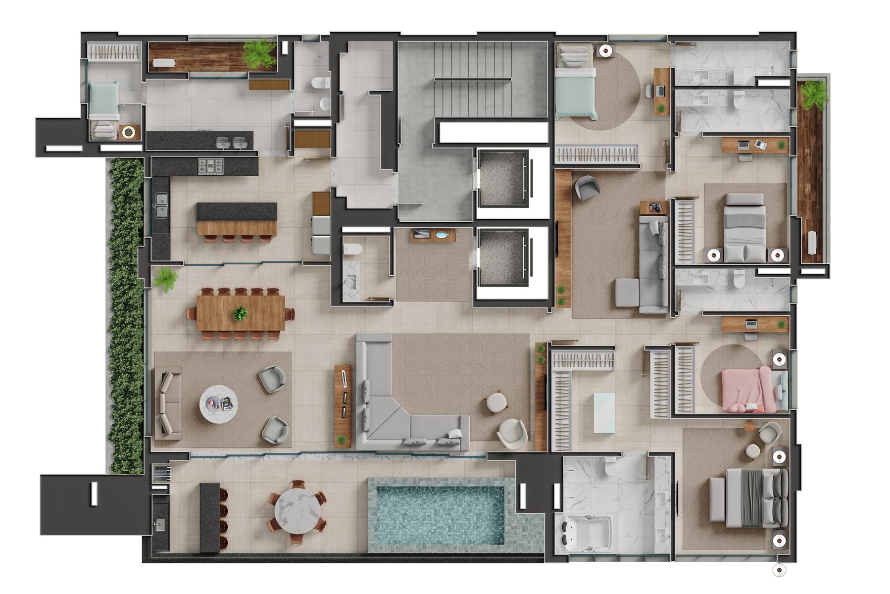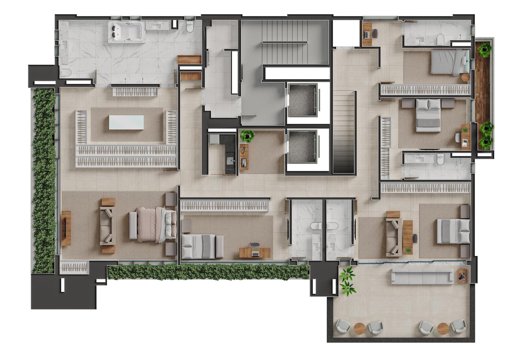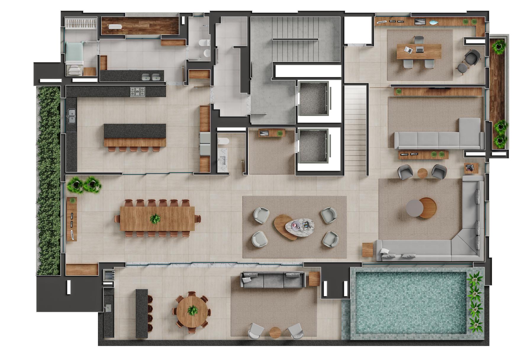 Os apartamentos garden do Bauhaus possuem metragem de 550 m² e contam com 4 suítes. Essa tipologia oferece áreas externas privativas integradas aos ambientes sociais, proporcionando maior amplitude e contato com áreas verdes. As unidades apresentam varanda gourmet, piscina privativa, acabamentos de alto padrão e distribuição inteligente dos espaços, mantendo a identidade arquitetônica moderna do empreendimento.