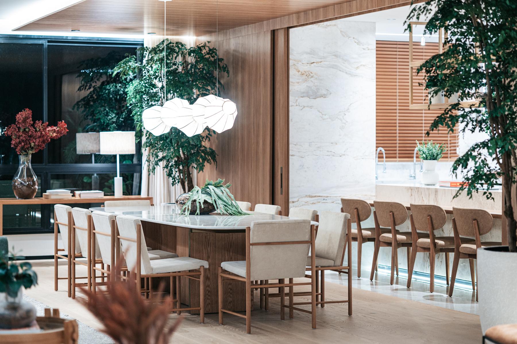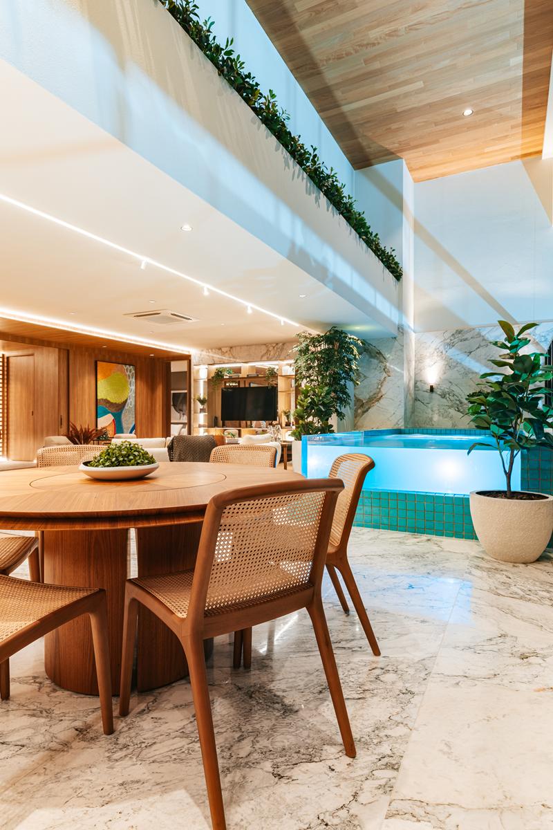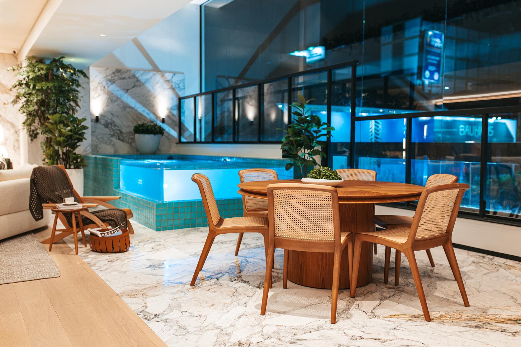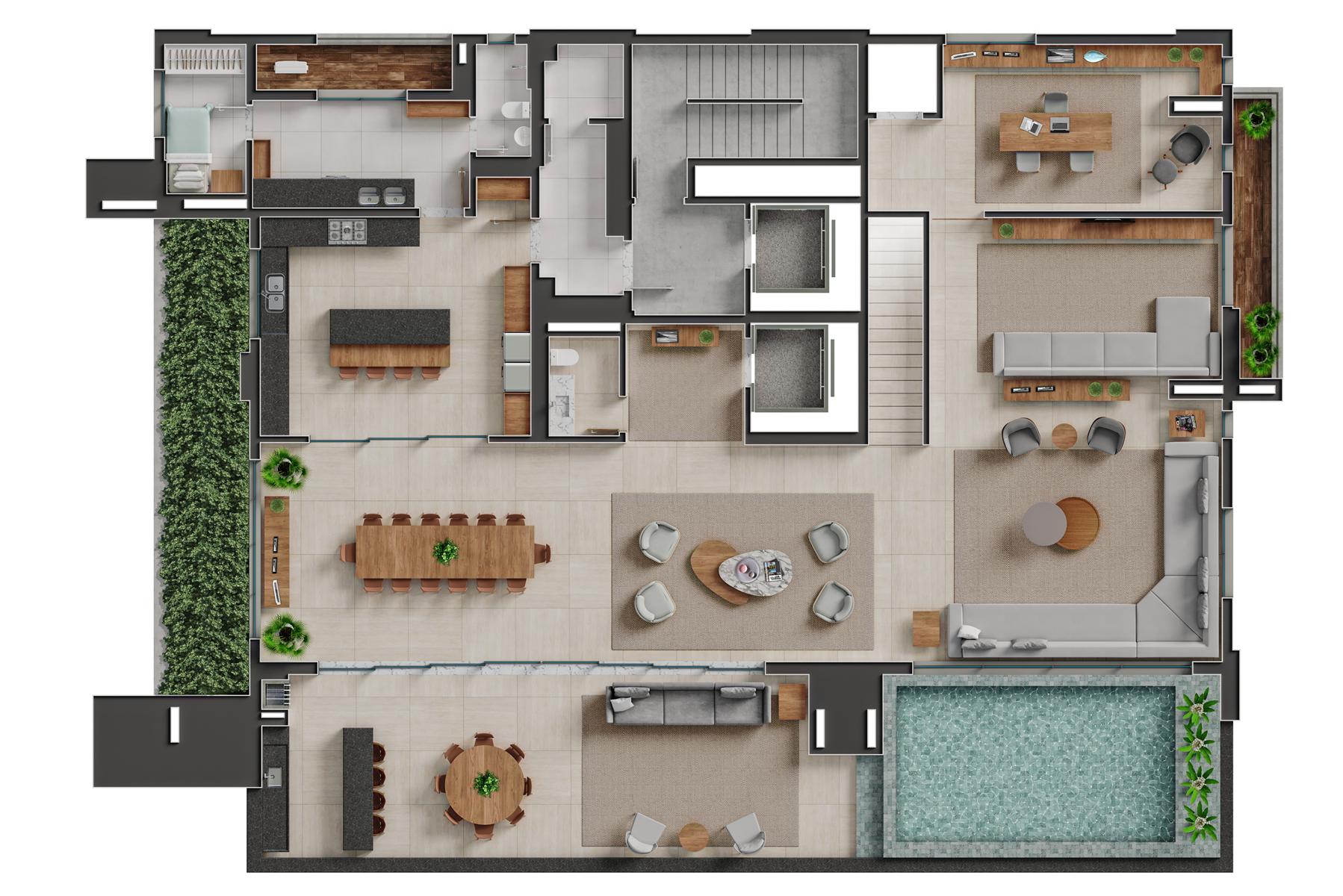 Os apartamentos garden do Bauhaus possuem metragem de 550 m² e contam com 4 suítes. Essa tipologia oferece áreas externas privativas integradas aos ambientes sociais, proporcionando maior amplitude e contato com áreas verdes. As unidades apresentam varanda gourmet, piscina privativa, acabamentos de alto padrão e distribuição inteligente dos espaços, mantendo a identidade arquitetônica moderna do empreendimento.