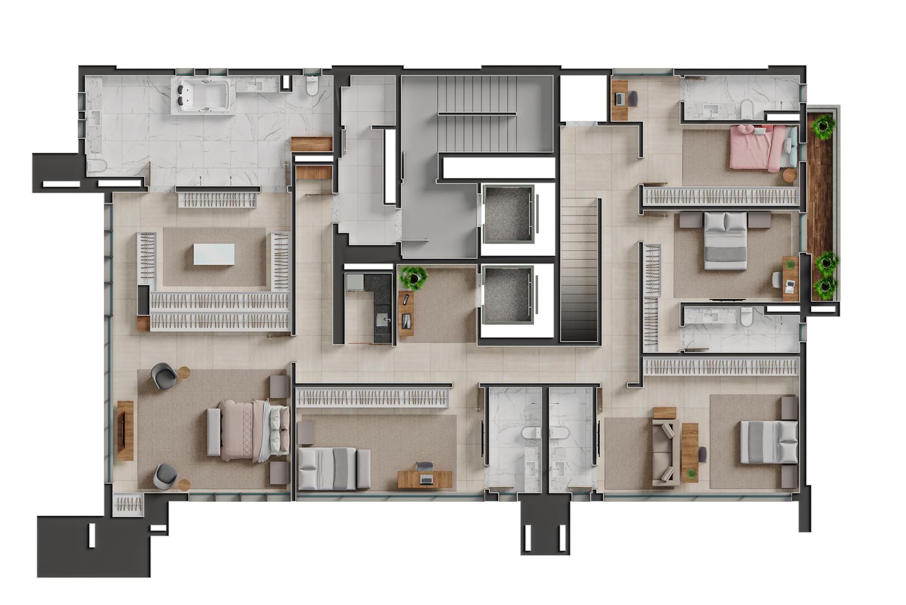O empreendimento conta com apartamentos pool house de 350 m², 400 m² e 550 m² com 4 suítes, apartamentos garden de 550 m² com 4 suítes e coberturas duplex de 670 m² e 740 m² com 5 suítes.