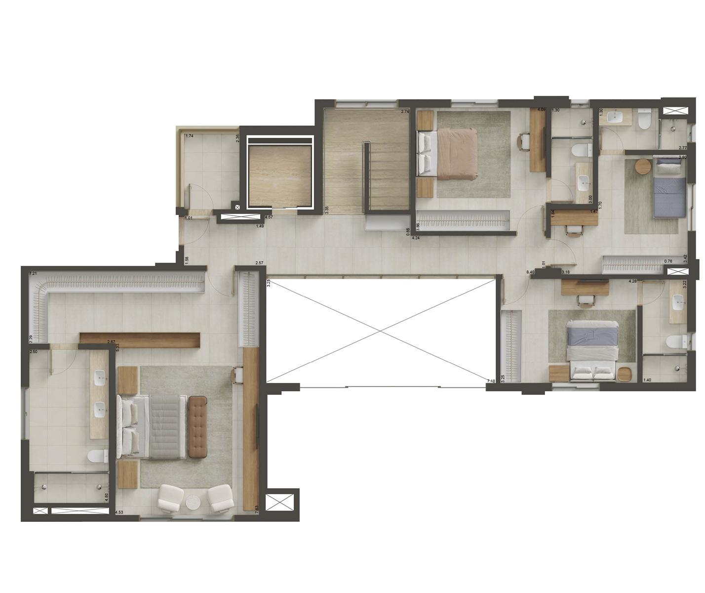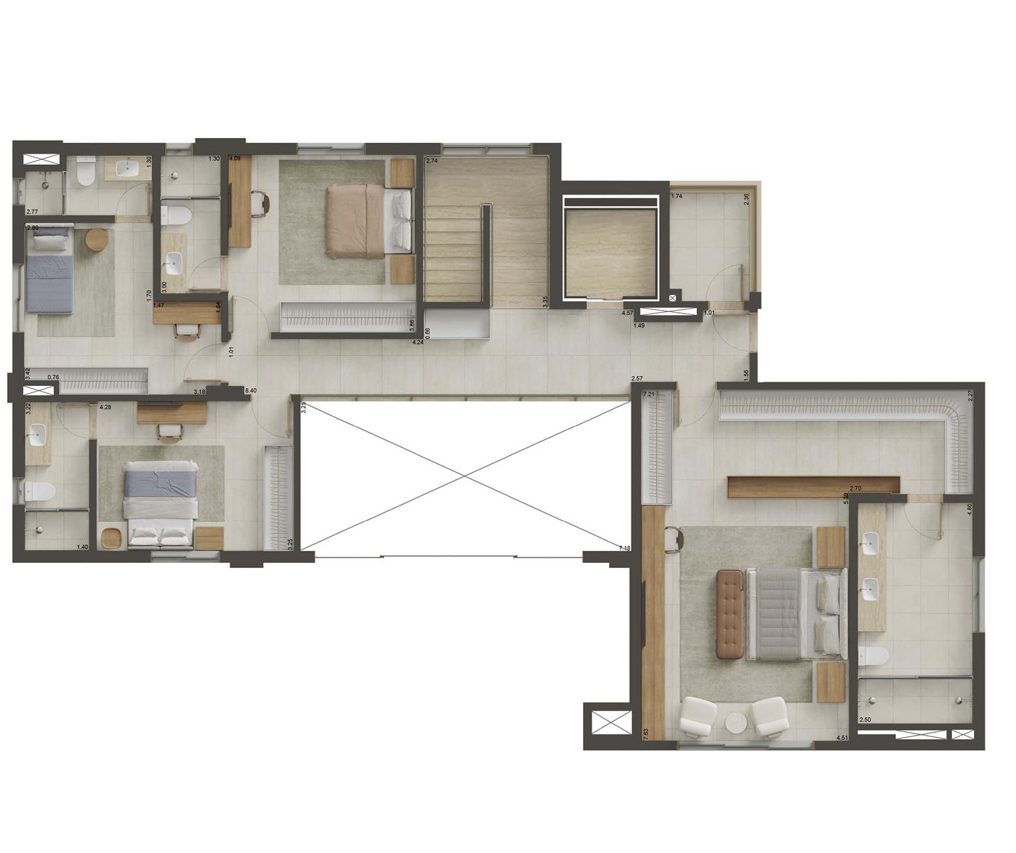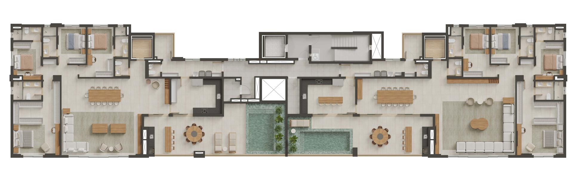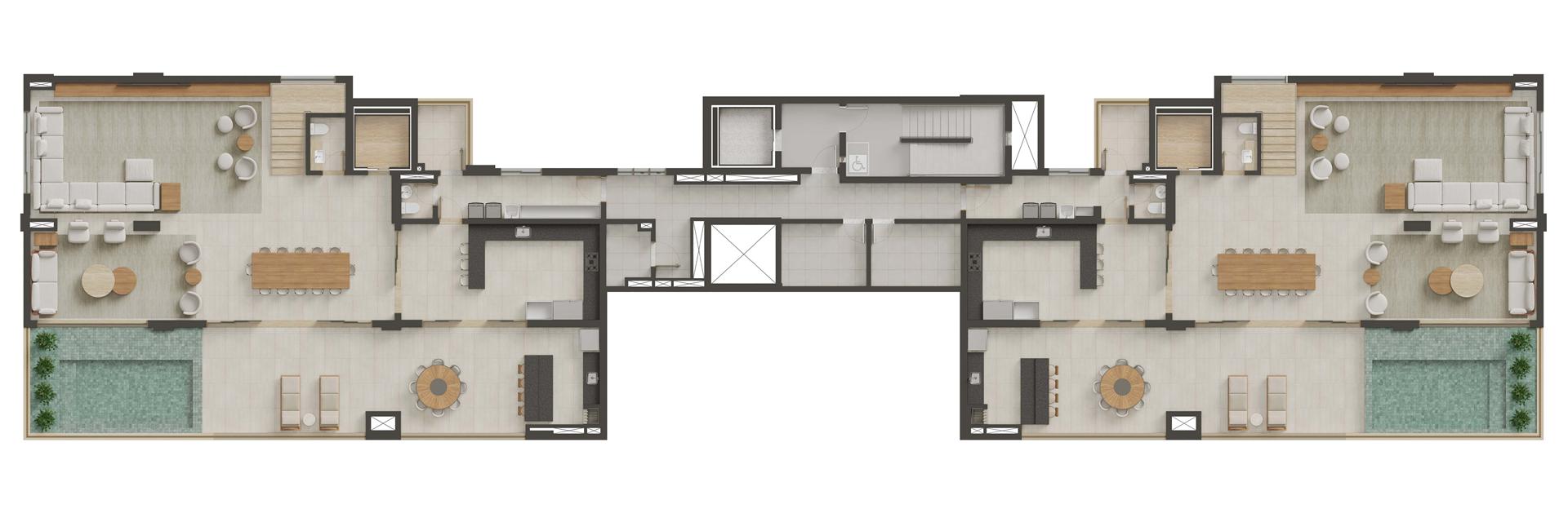 Os apartamentos duplex do Capadócia Marista possuem metragens de 410 m² e oferecem 4 suítes, com elevador privativo atendendo os pavimentos. As unidades contam com varanda equipada com churrasqueira a carvão e piscina descoberta, além de ambientes amplos e bem distribuídos. Os acabamentos seguem o padrão elevado do empreendimento, com materiais naturais, esquadrias com veneziana integrada e infraestrutura para ar-condicionado tipo VRF, garantindo conforto e funcionalidade.