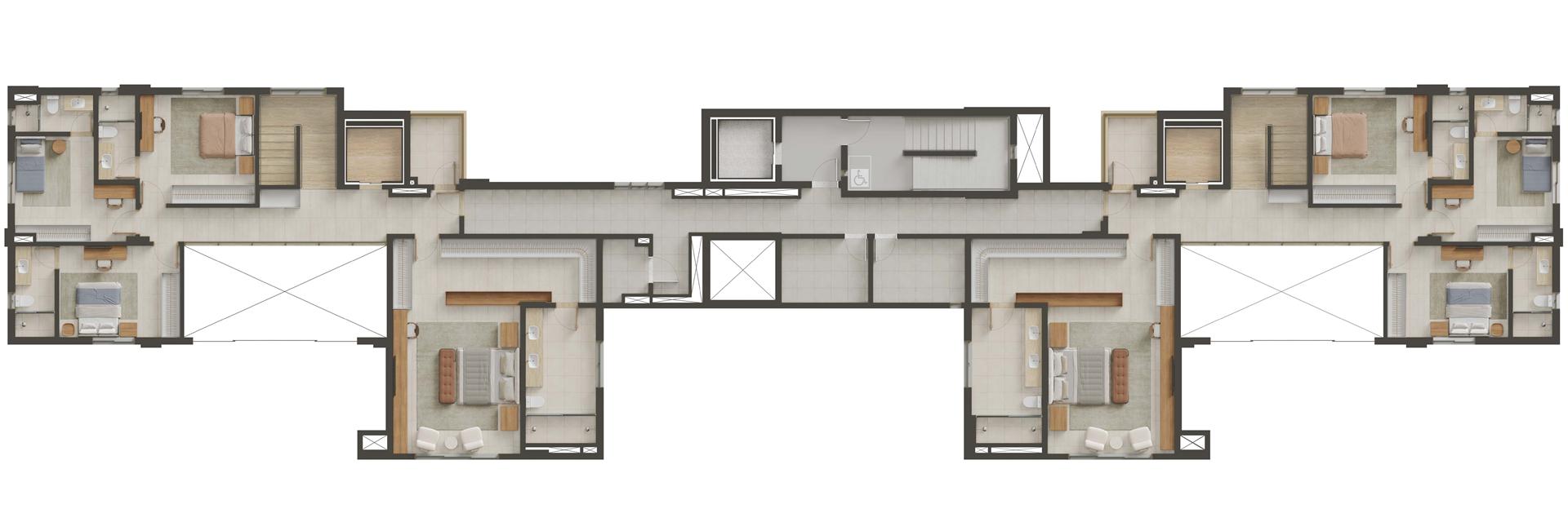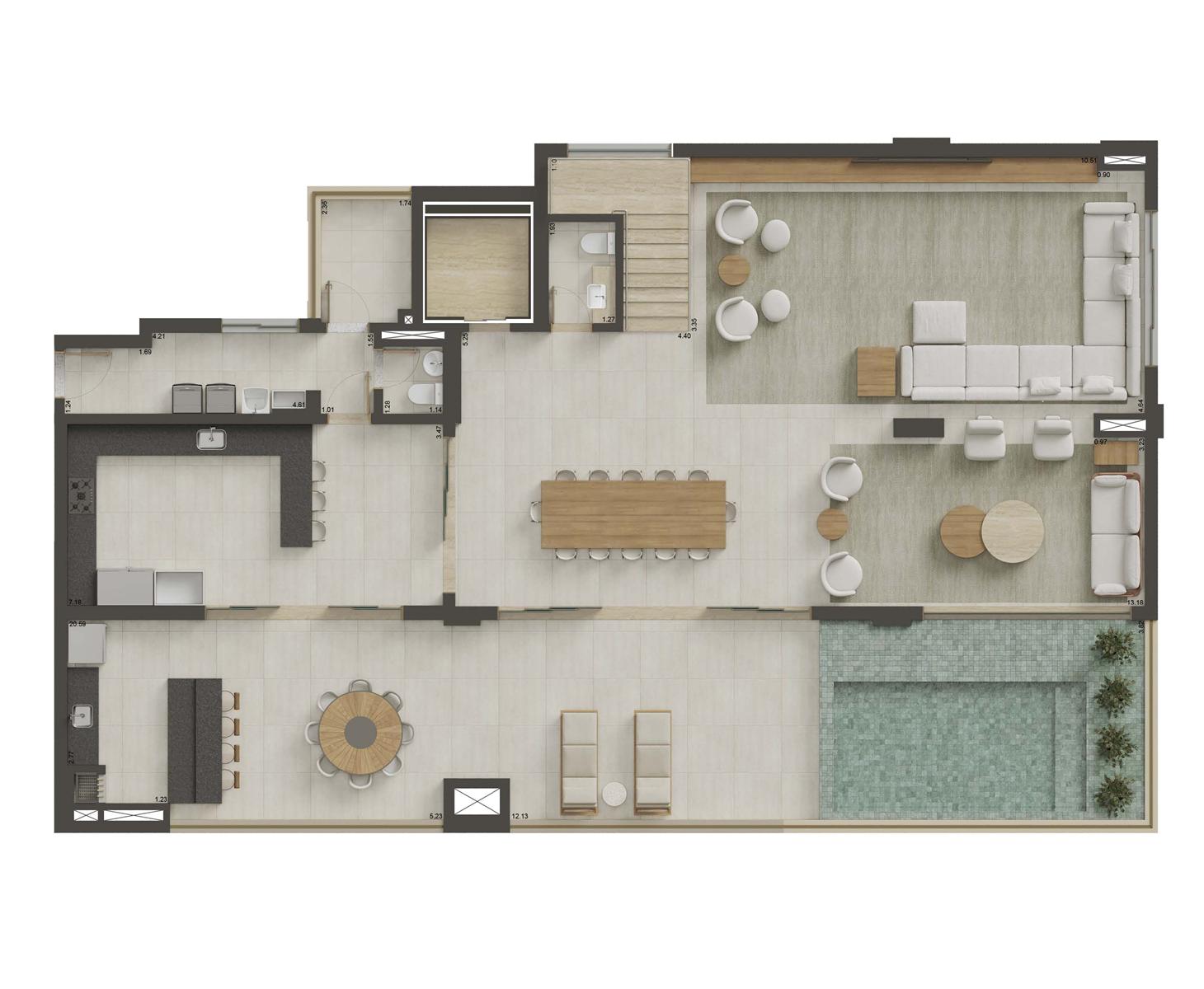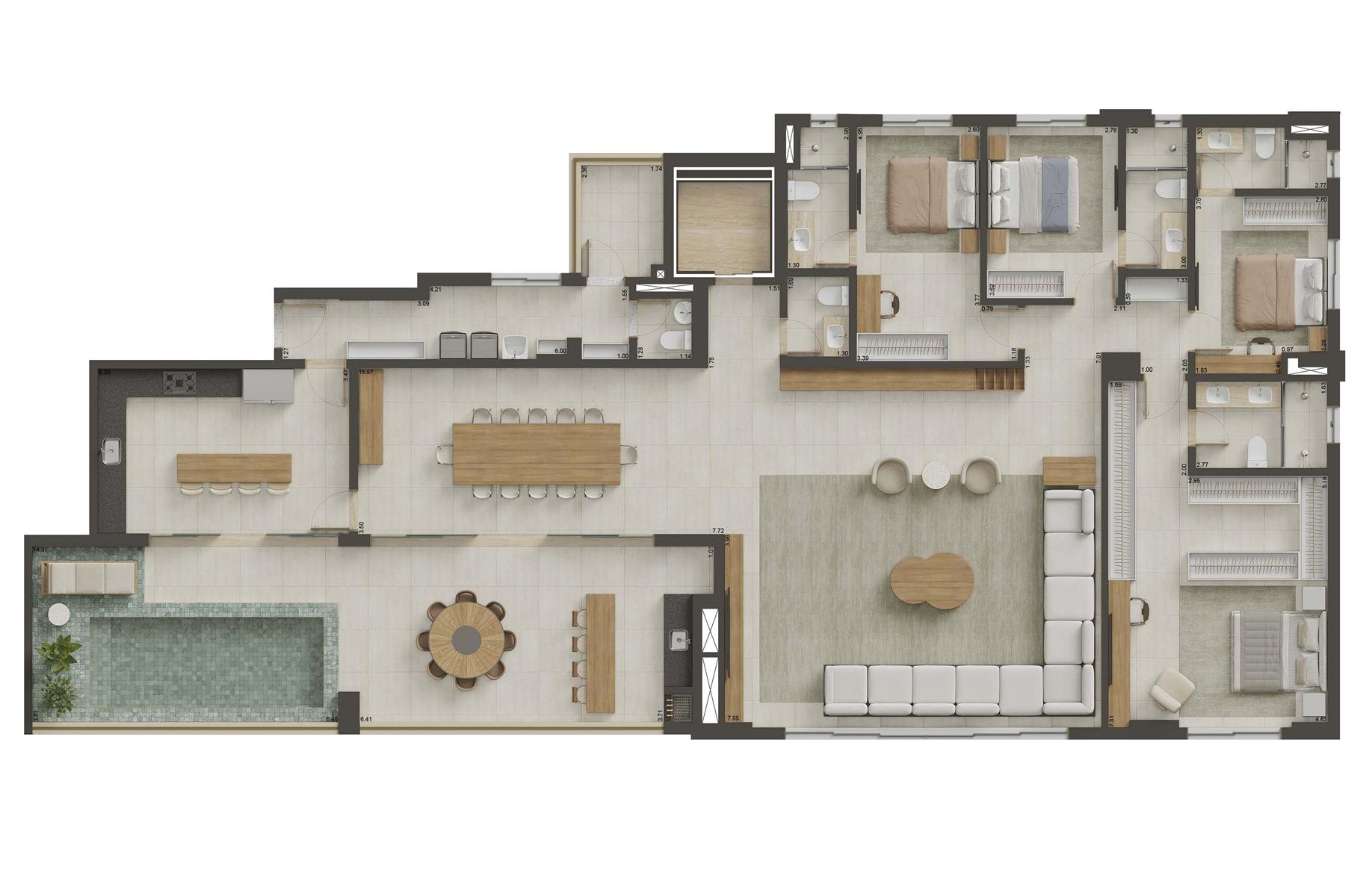 Os apartamentos duplex do Capadócia Marista possuem metragens de 410 m² e oferecem 4 suítes, com elevador privativo atendendo os pavimentos. As unidades contam com varanda equipada com churrasqueira a carvão e piscina descoberta, além de ambientes amplos e bem distribuídos. Os acabamentos seguem o padrão elevado do empreendimento, com materiais naturais, esquadrias com veneziana integrada e infraestrutura para ar-condicionado tipo VRF, garantindo conforto e funcionalidade.