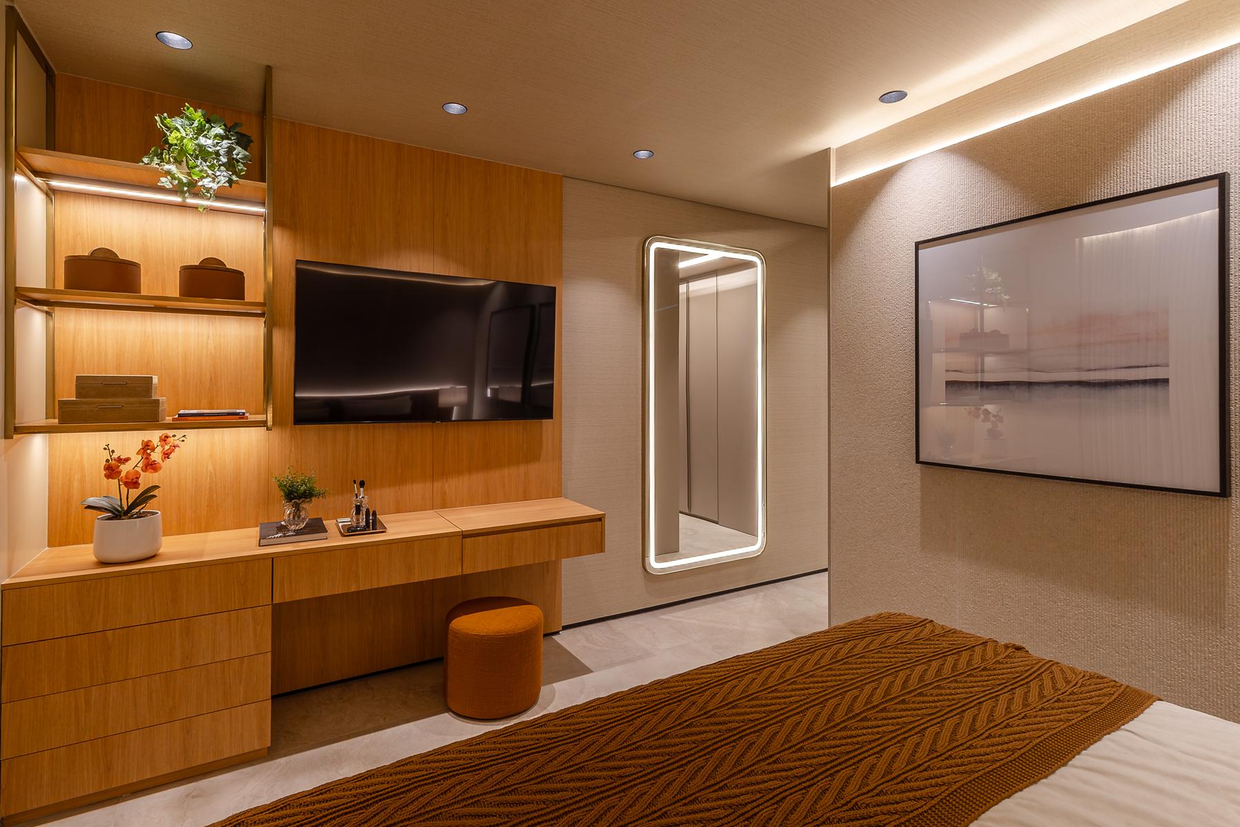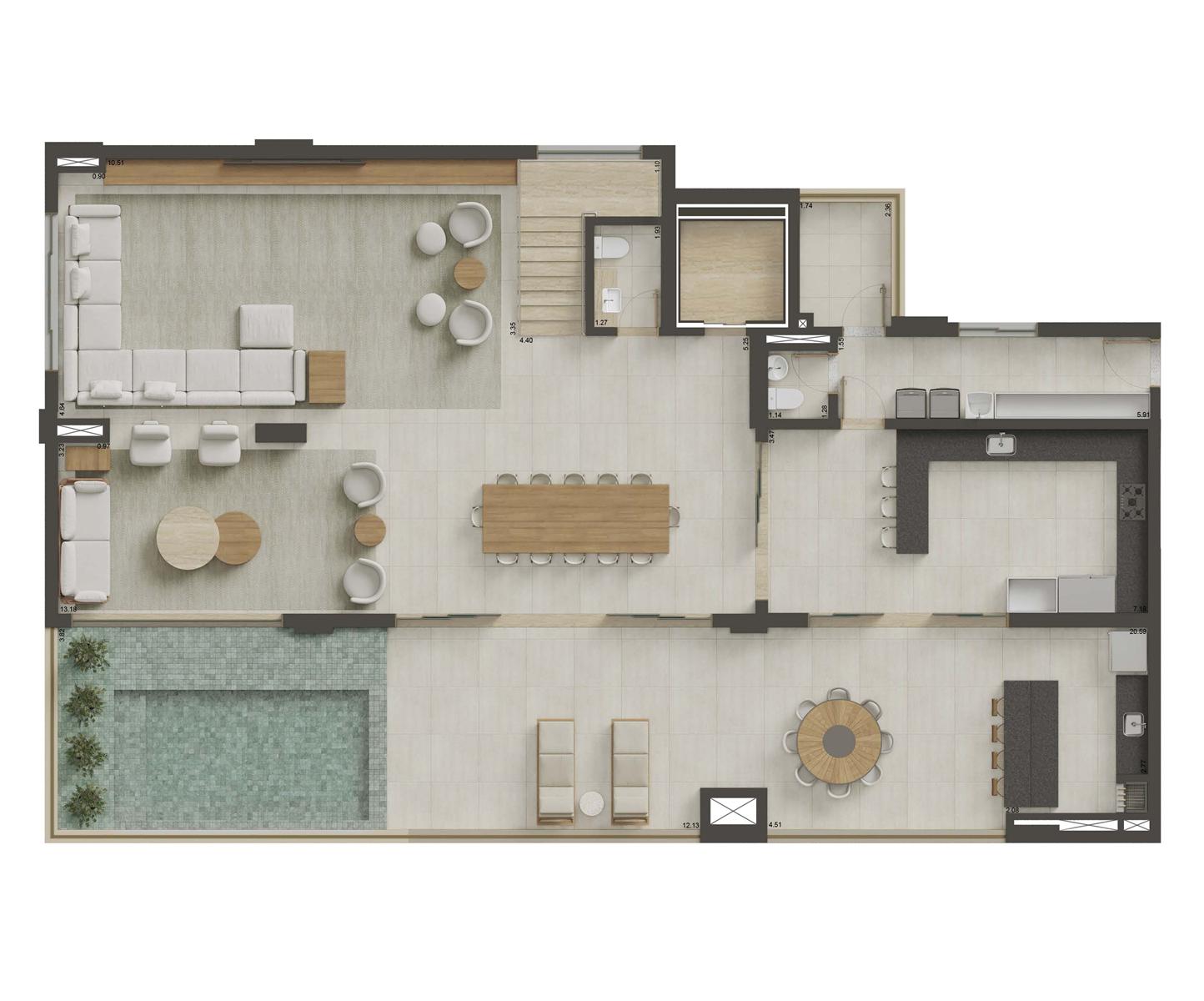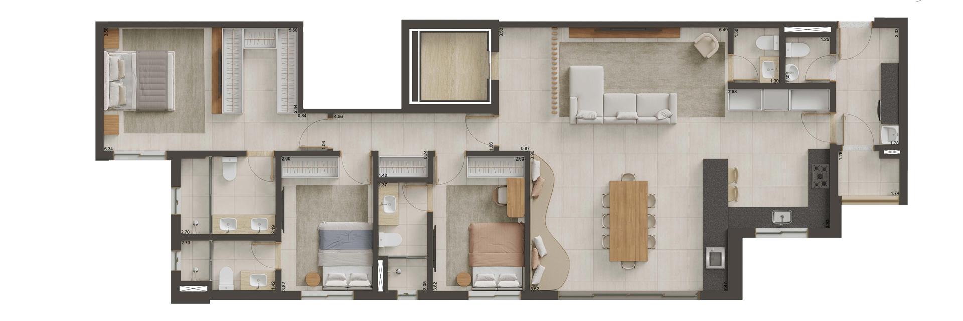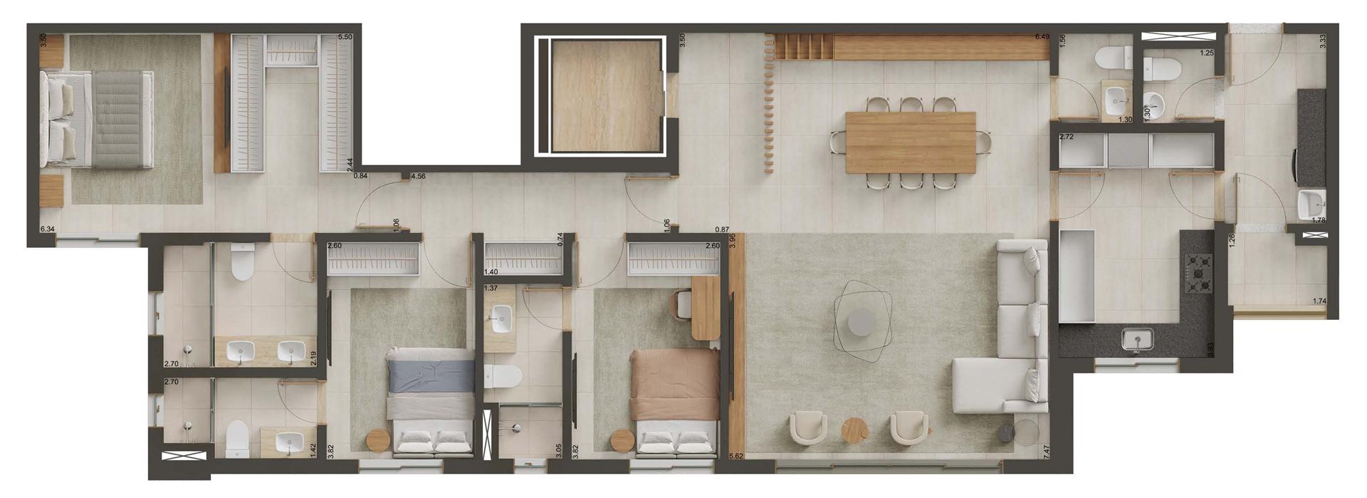 Os apartamentos duplex do Capadócia Marista possuem metragens de 410 m² e oferecem 4 suítes, com elevador privativo atendendo os pavimentos. As unidades contam com varanda equipada com churrasqueira a carvão e piscina descoberta, além de ambientes amplos e bem distribuídos. Os acabamentos seguem o padrão elevado do empreendimento, com materiais naturais, esquadrias com veneziana integrada e infraestrutura para ar-condicionado tipo VRF, garantindo conforto e funcionalidade.