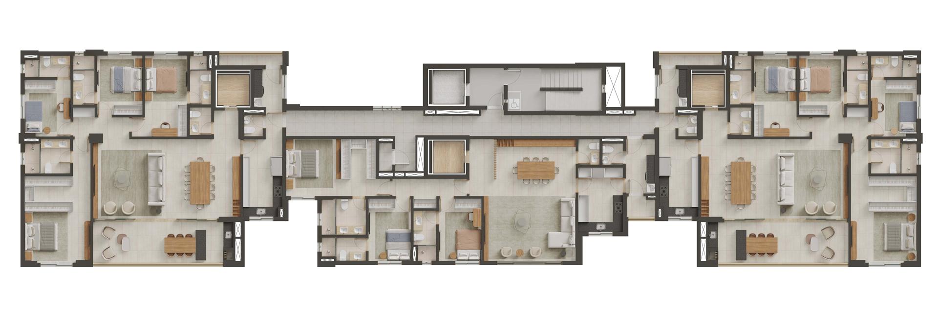 Os apartamentos do Capadócia Marista possuem plantas bem distribuídas, com metragens de 150 m² e 200 m², oferecendo 3 ou 4 suítes. As unidades contam com elevador privativo, acabamentos em materiais naturais, esquadrias com veneziana integrada e opção de varanda com churrasqueira a carvão. O projeto prioriza iluminação natural, ventilação e vista livre, com soluções técnicas voltadas ao conforto e à funcionalidade.