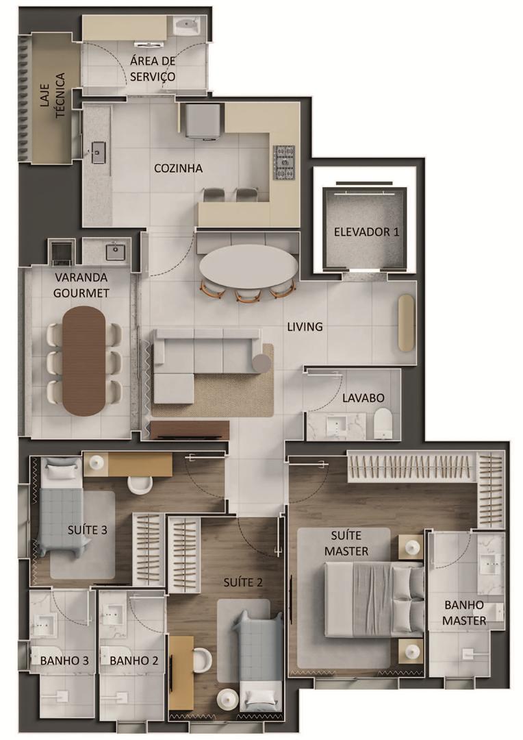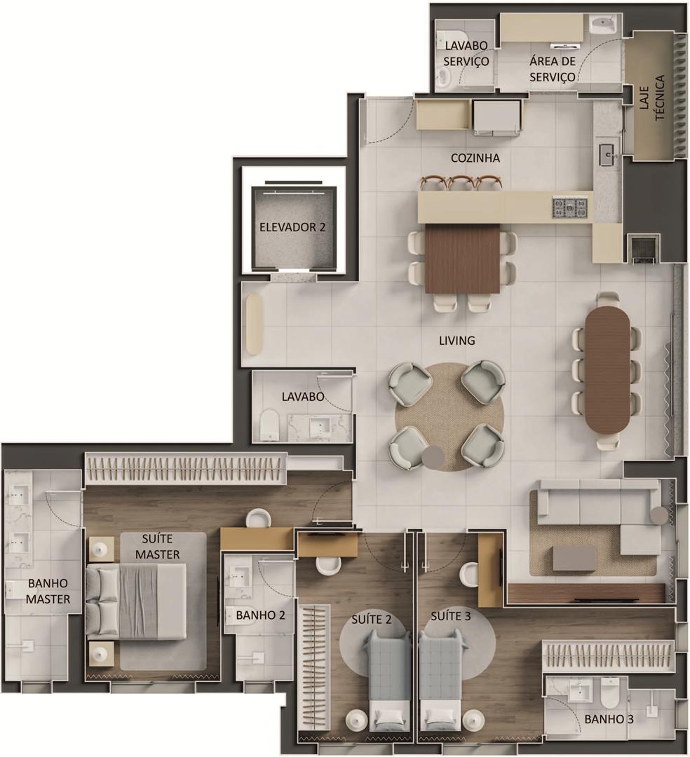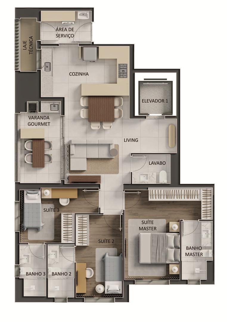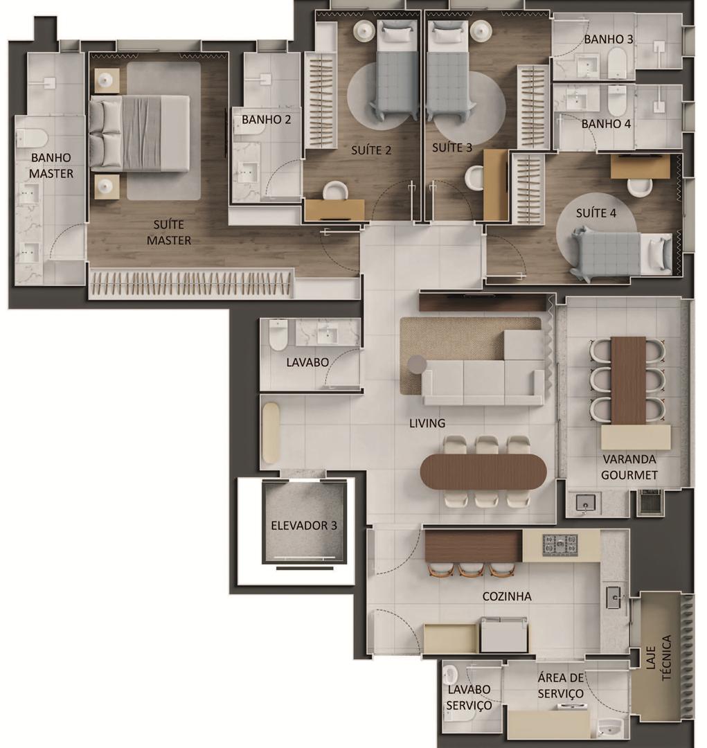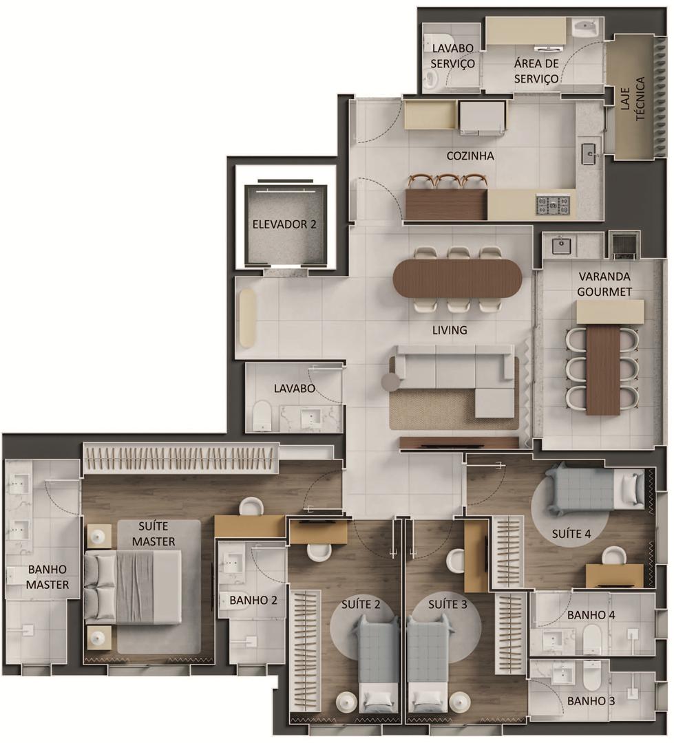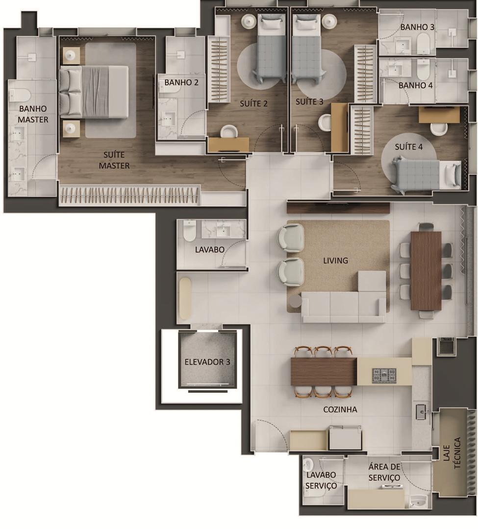 Os apartamentos apresentam metragens de 120 m² a 153 m², com plantas que incluem 3 a 4 suítes, varanda com churrasqueira a carvão e elevador com hall privativo. O condomínio oferece ampla área de lazer com piscina, sauna, quadras, espaços de bem-estar e ambientes de conveniência como minimercado, business area e smart access, complementando a experiência residencial com praticidade e segurança.