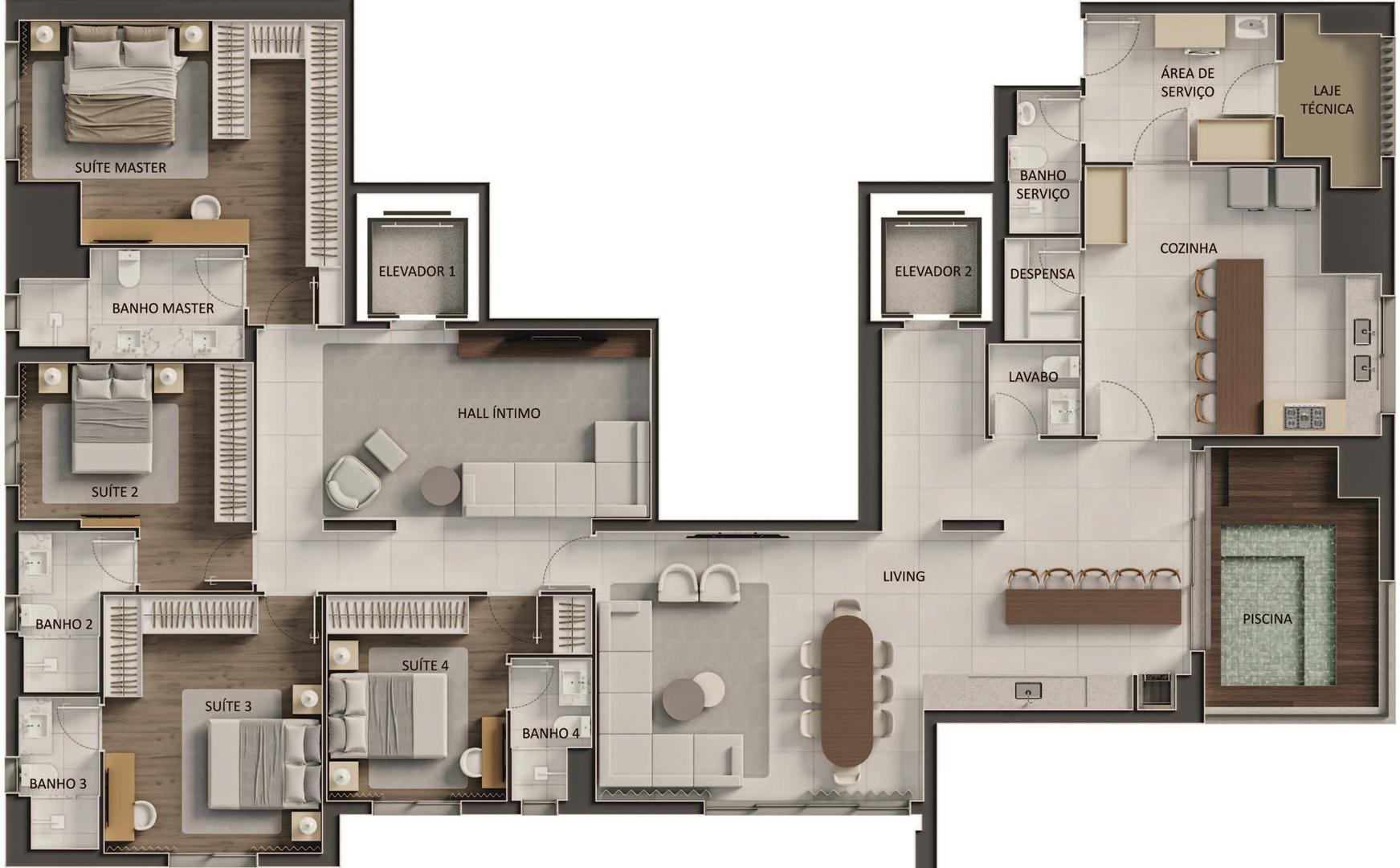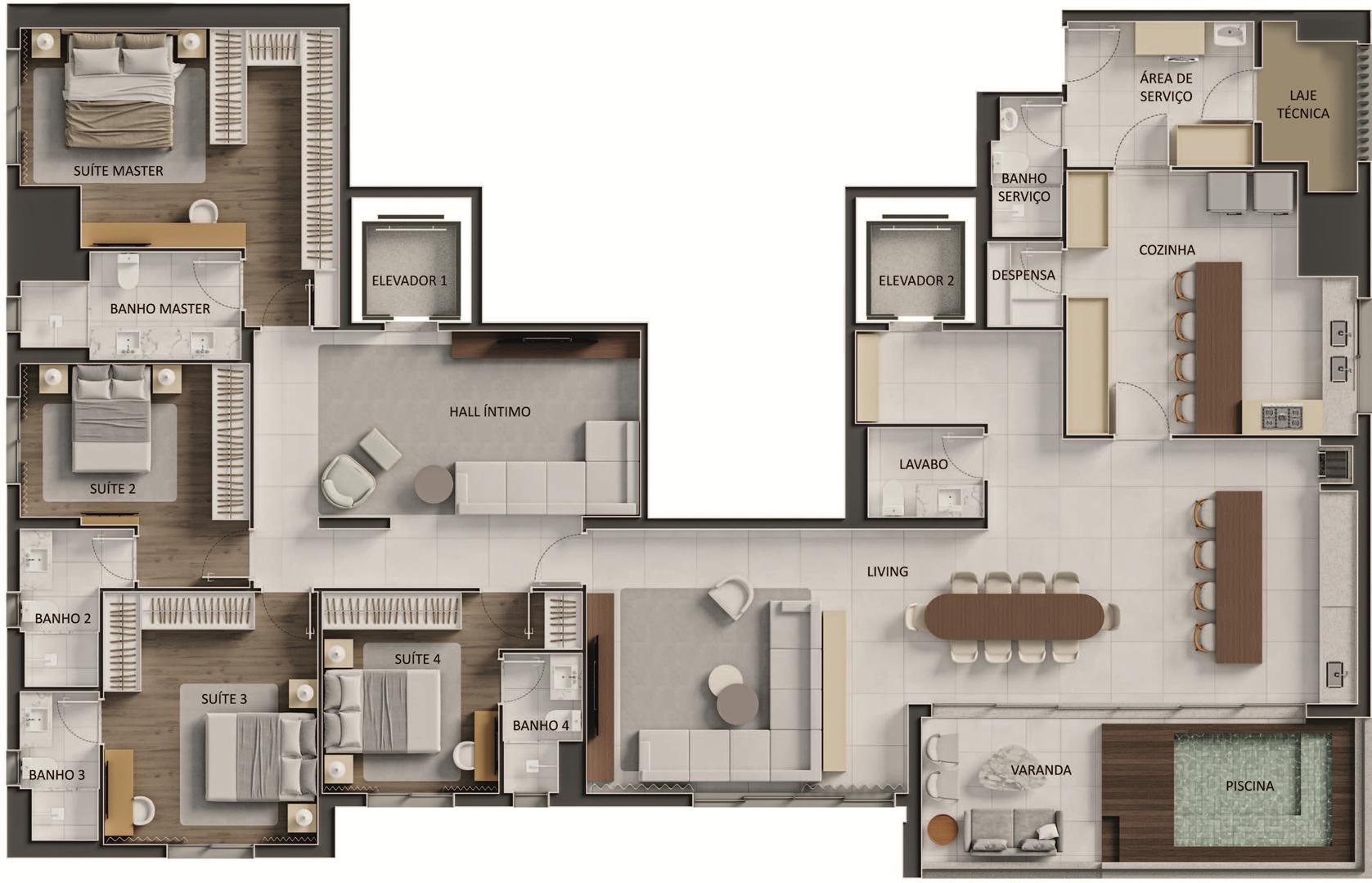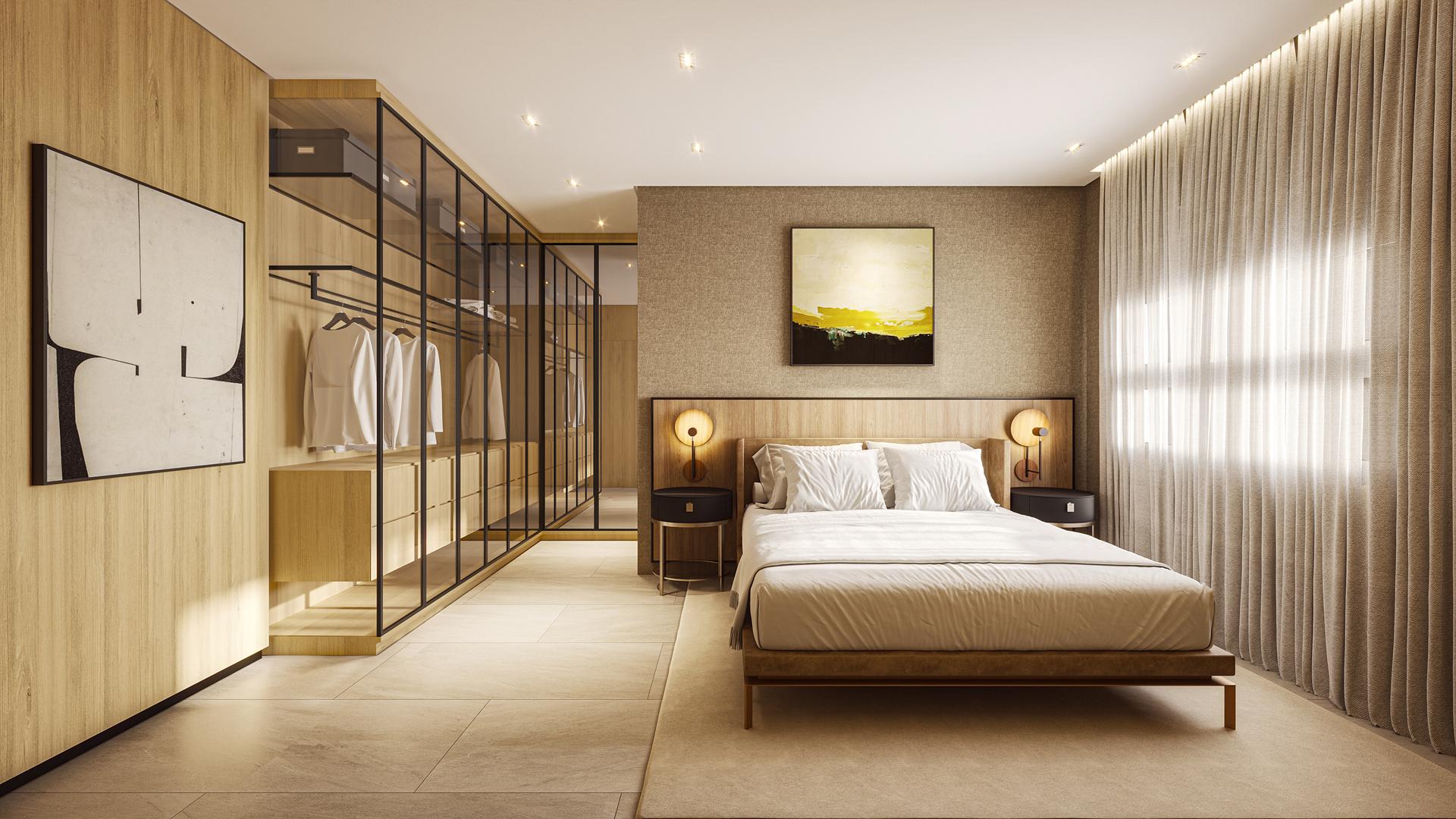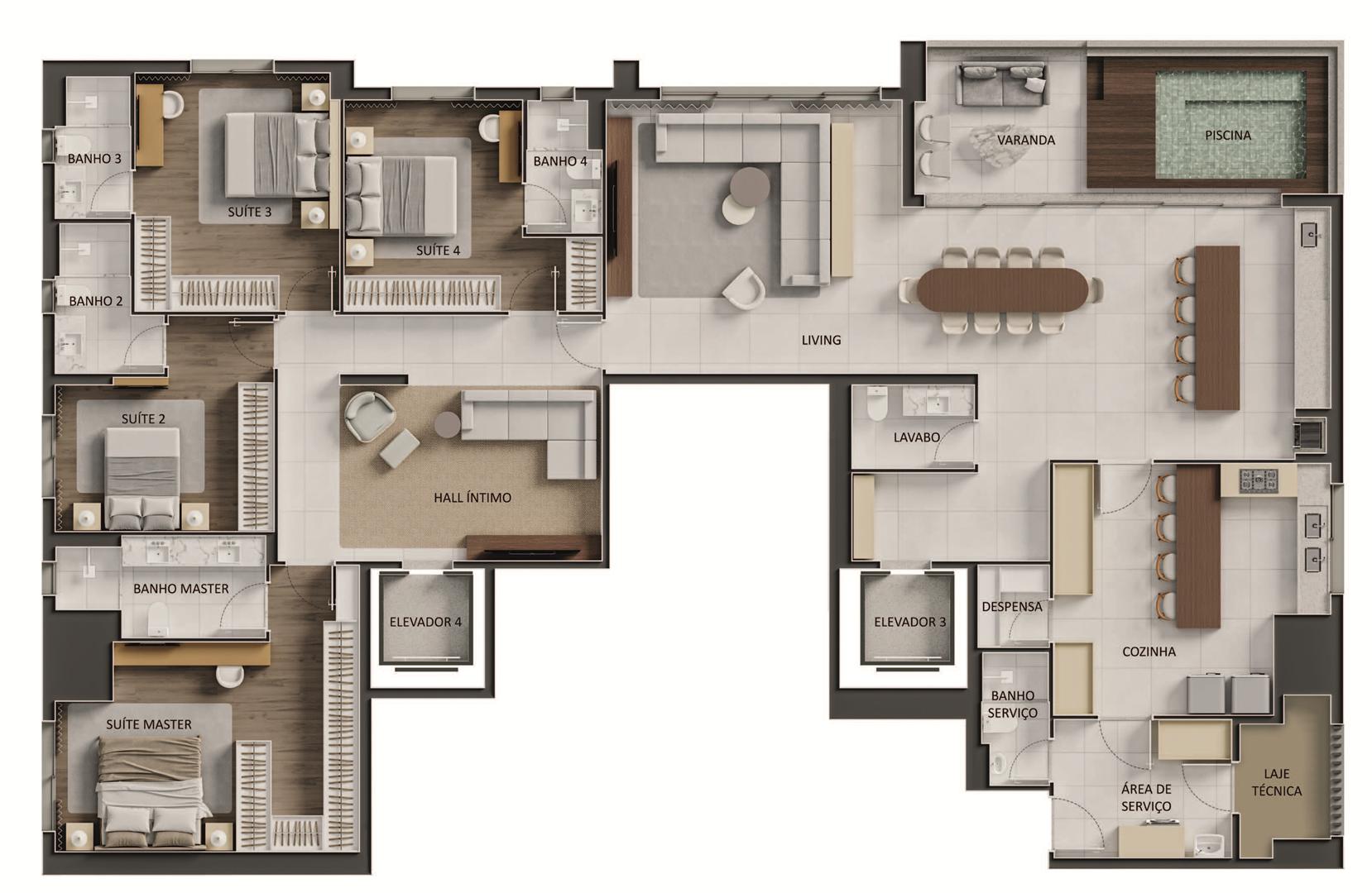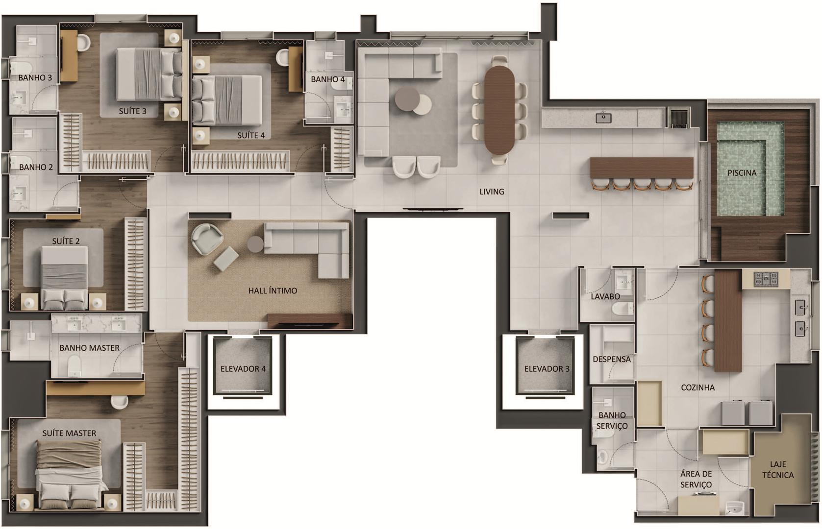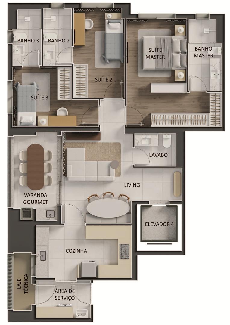 Os apartamentos apresentam metragens de 120 m² a 153 m², com plantas que incluem 3 a 4 suítes, varanda com churrasqueira a carvão e elevador com hall privativo. O condomínio oferece ampla área de lazer com piscina, sauna, quadras, espaços de bem-estar e ambientes de conveniência como minimercado, business area e smart access, complementando a experiência residencial com praticidade e segurança.