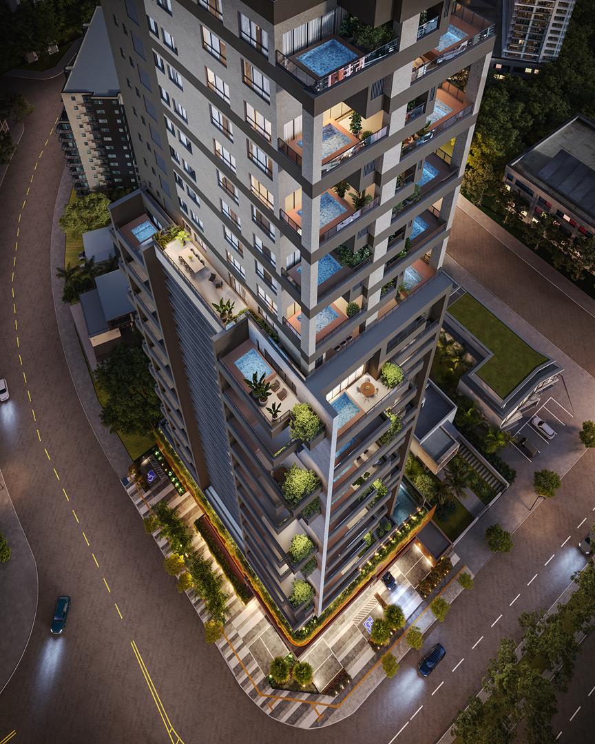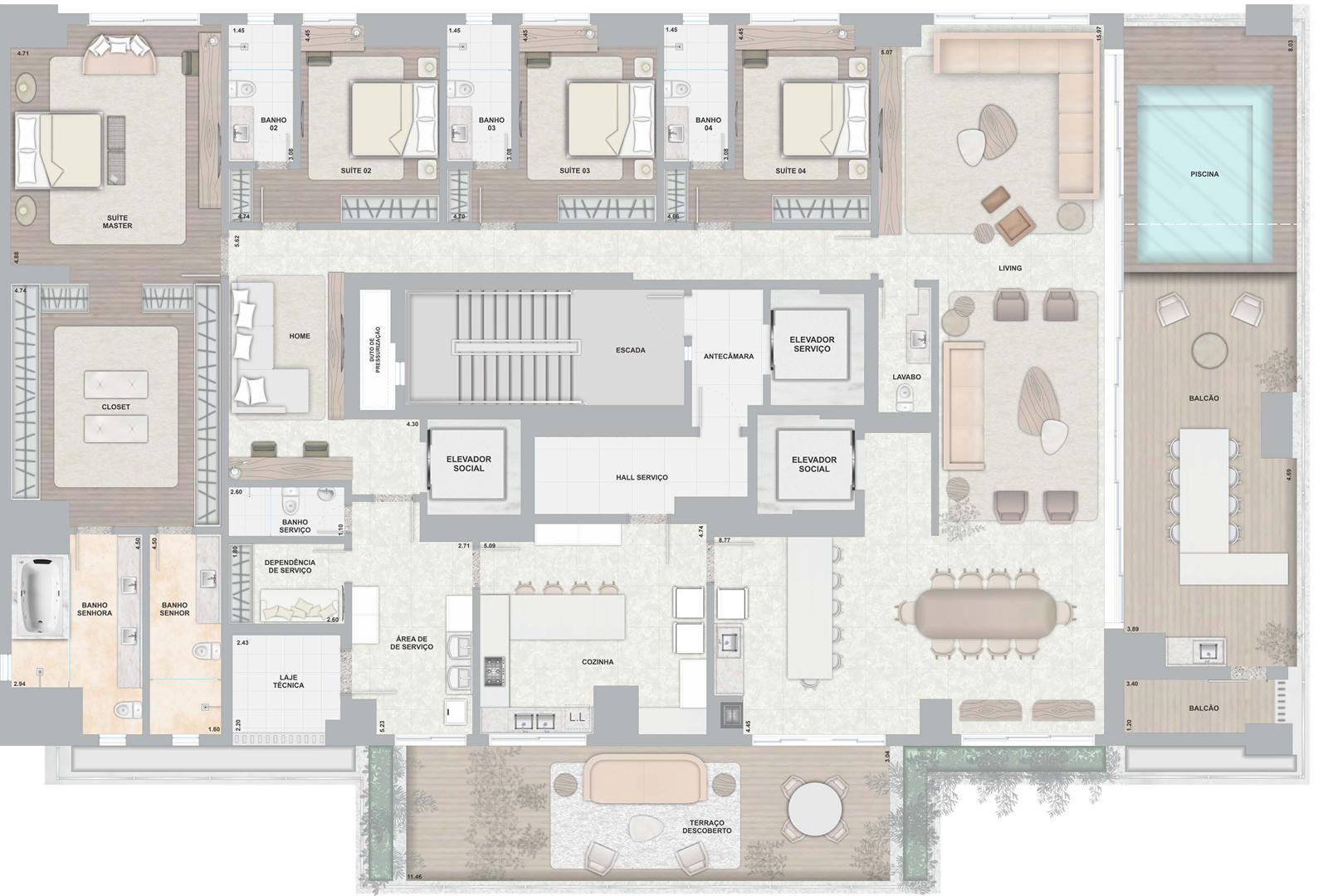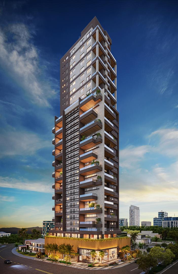 O empreendimento oferece apartamentos de 4 suítes, com metragens de 253 m², 305 m² e 415 m², além de vagas de garagem. Todas as unidades contam com piscina privativa, pé-direito de 2,70 m e sol da manhã.