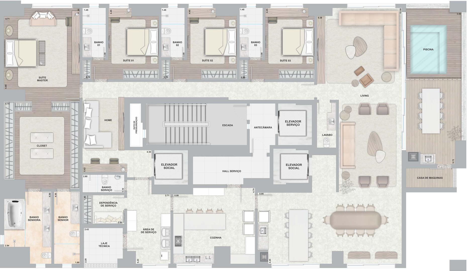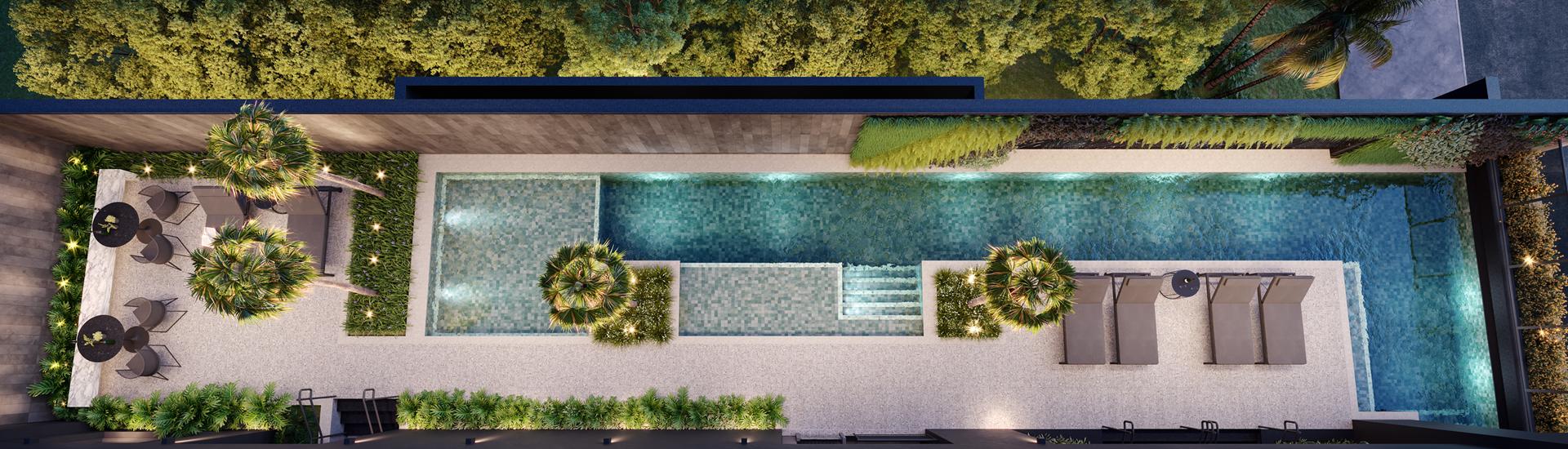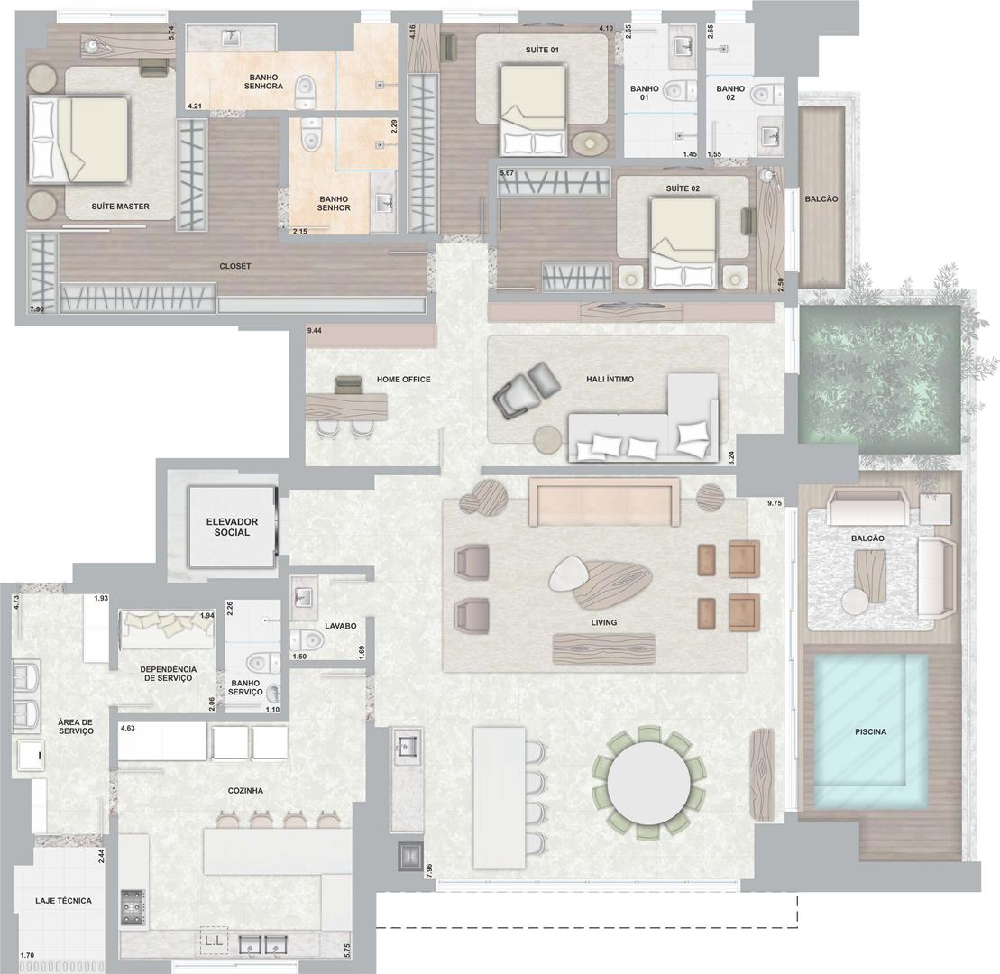 O empreendimento oferece apartamentos de 4 suítes, com metragens de 253 m², 305 m² e 415 m², além de vagas de garagem. Todas as unidades contam com piscina privativa, pé-direito de 2,70 m e sol da manhã.