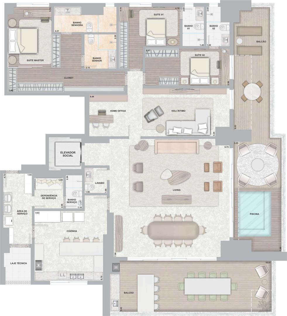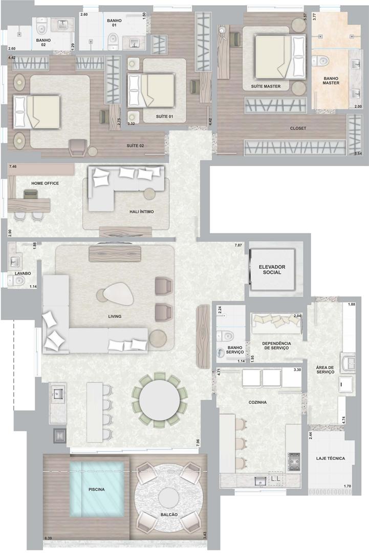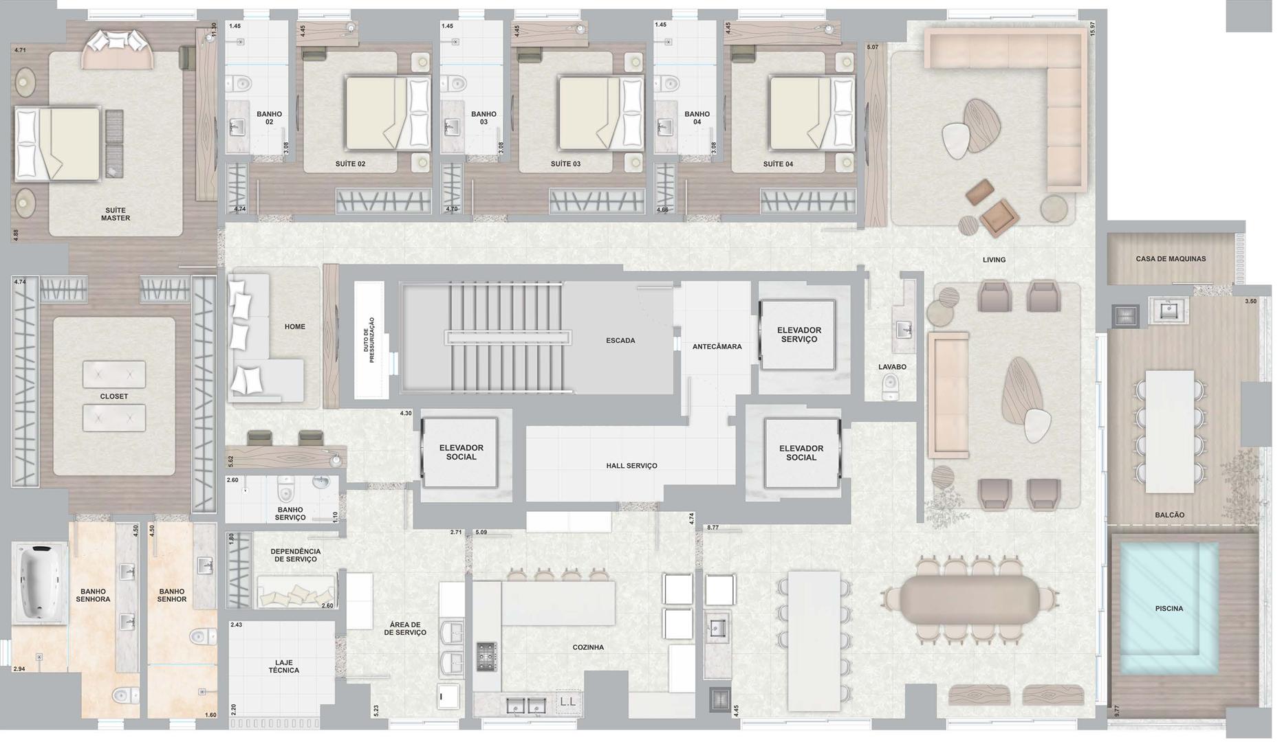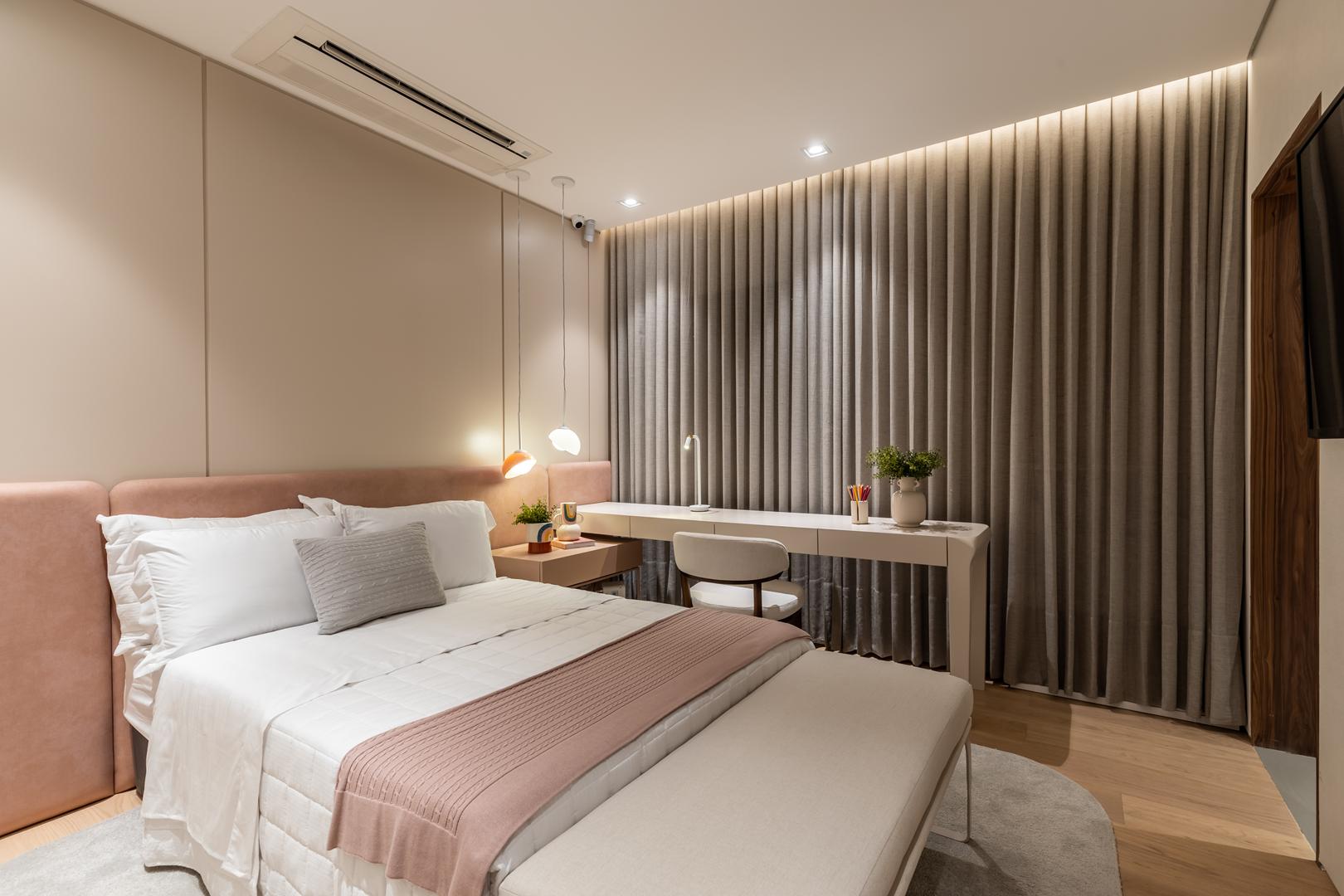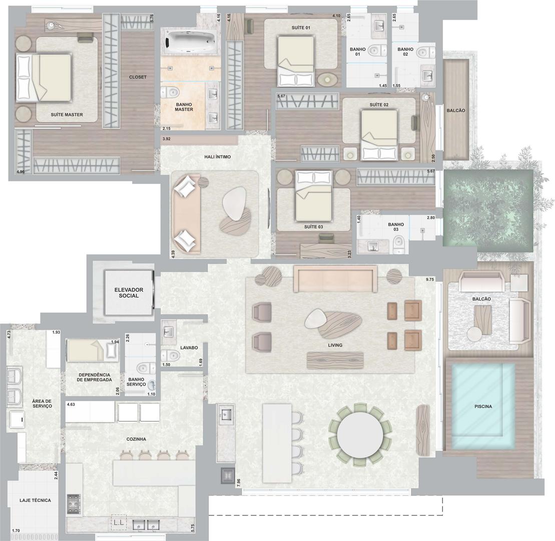 Os apartamentos do City Ricardo Paranhos oferecem 4 suítes, com metragens de 253 m², 305 m² e 415 m², garantindo amplitude e eficiência na distribuição dos ambientes. Todas as unidades incluem piscina privativa, sol da manhã, pé-direito de 2,70 m e laje maciça. O projeto valoriza acabamentos de qualidade, iluminação natural e integração entre os espaços, proporcionando conforto e sofisticação.