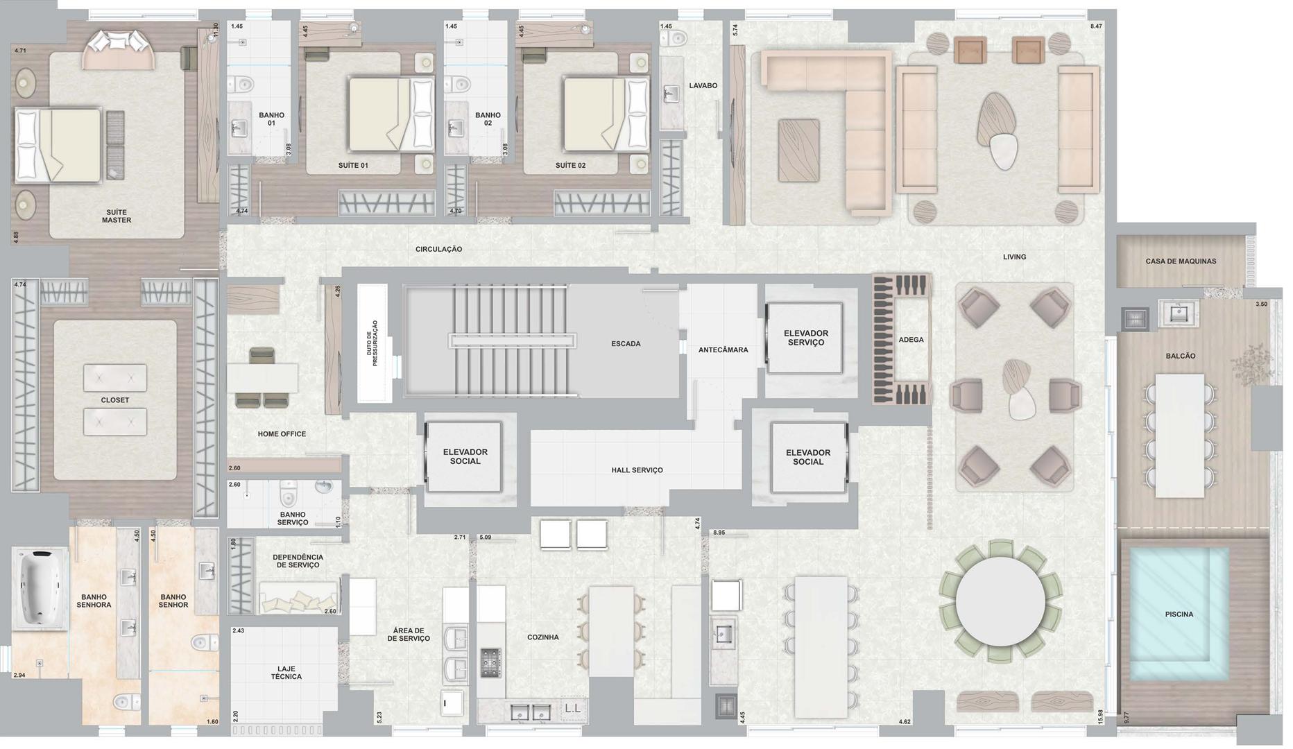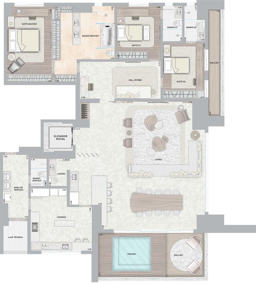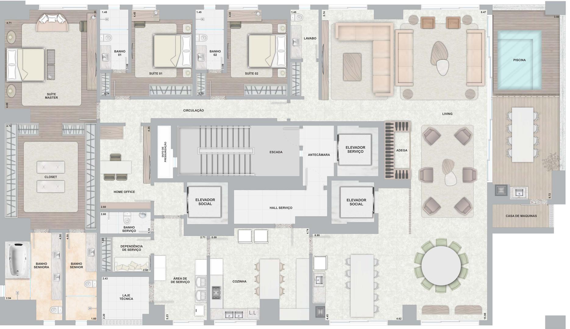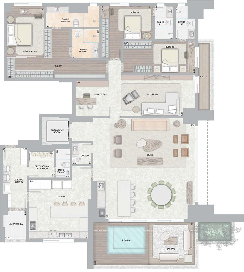 Os apartamentos do City Ricardo Paranhos oferecem 4 suítes, com metragens de 253 m², 305 m² e 415 m², garantindo amplitude e eficiência na distribuição dos ambientes. Todas as unidades incluem piscina privativa, sol da manhã, pé-direito de 2,70 m e laje maciça. O projeto valoriza acabamentos de qualidade, iluminação natural e integração entre os espaços, proporcionando conforto e sofisticação.
