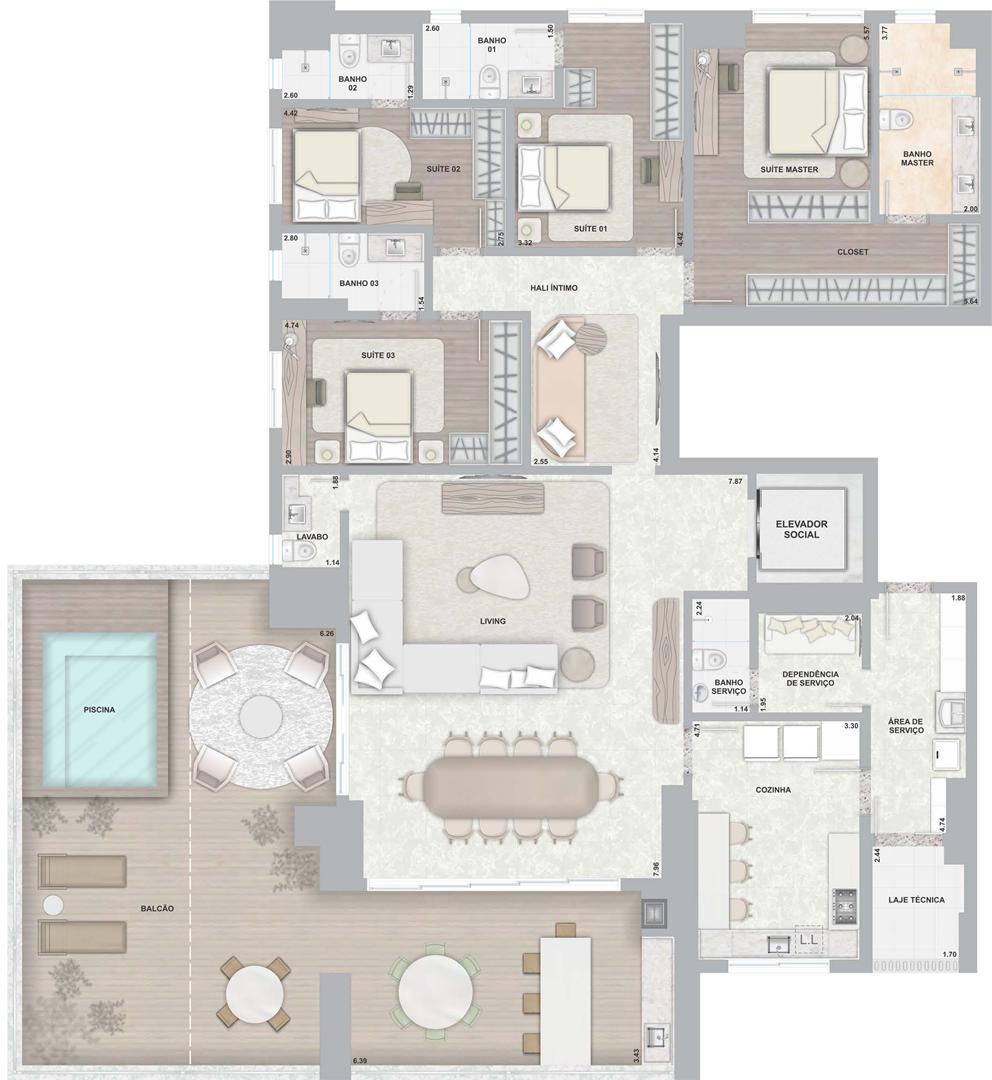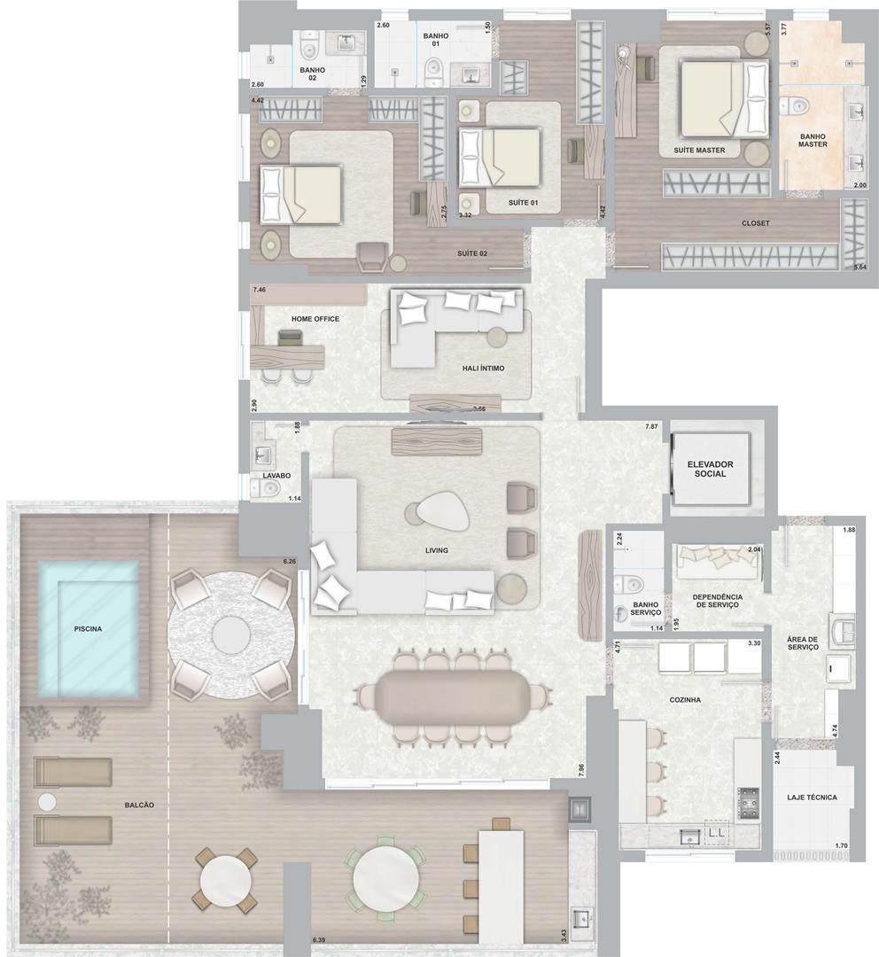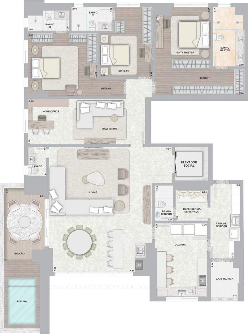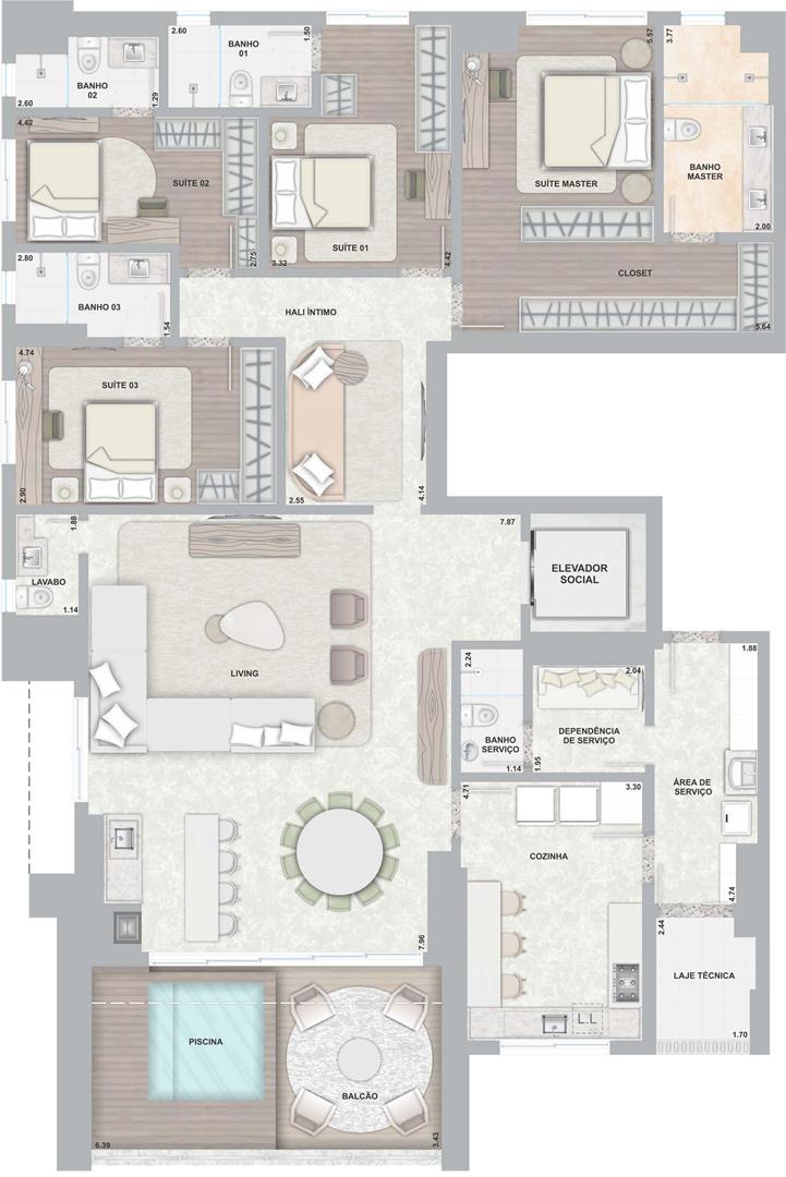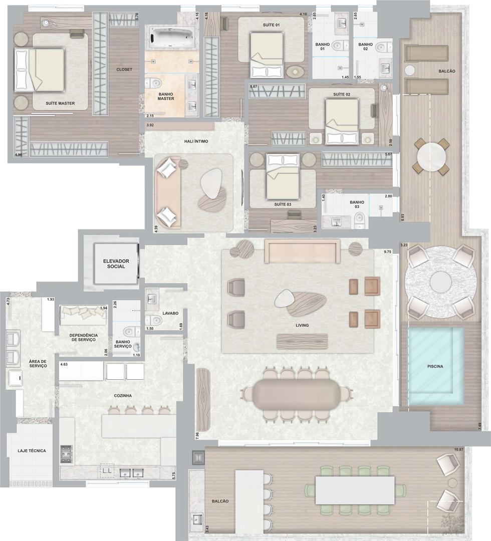 Os apartamentos do City Ricardo Paranhos oferecem 4 suítes, com metragens de 253 m², 305 m² e 415 m², garantindo amplitude e eficiência na distribuição dos ambientes. Todas as unidades incluem piscina privativa, sol da manhã, pé-direito de 2,70 m e laje maciça. O projeto valoriza acabamentos de qualidade, iluminação natural e integração entre os espaços, proporcionando conforto e sofisticação.