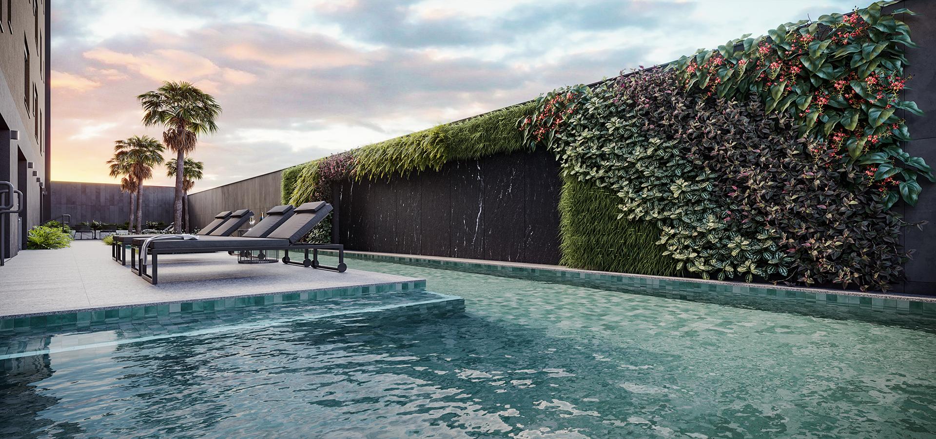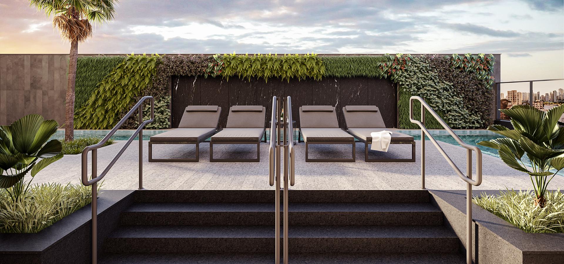 Entre os destaques estão reconhecimento facial, piscina privativa em todas as unidades, gerador para os apartamentos, laje maciça, irrigação automatizada, vaga com carregamento elétrico, pé-direito de 2,70 m e área comum equipada.