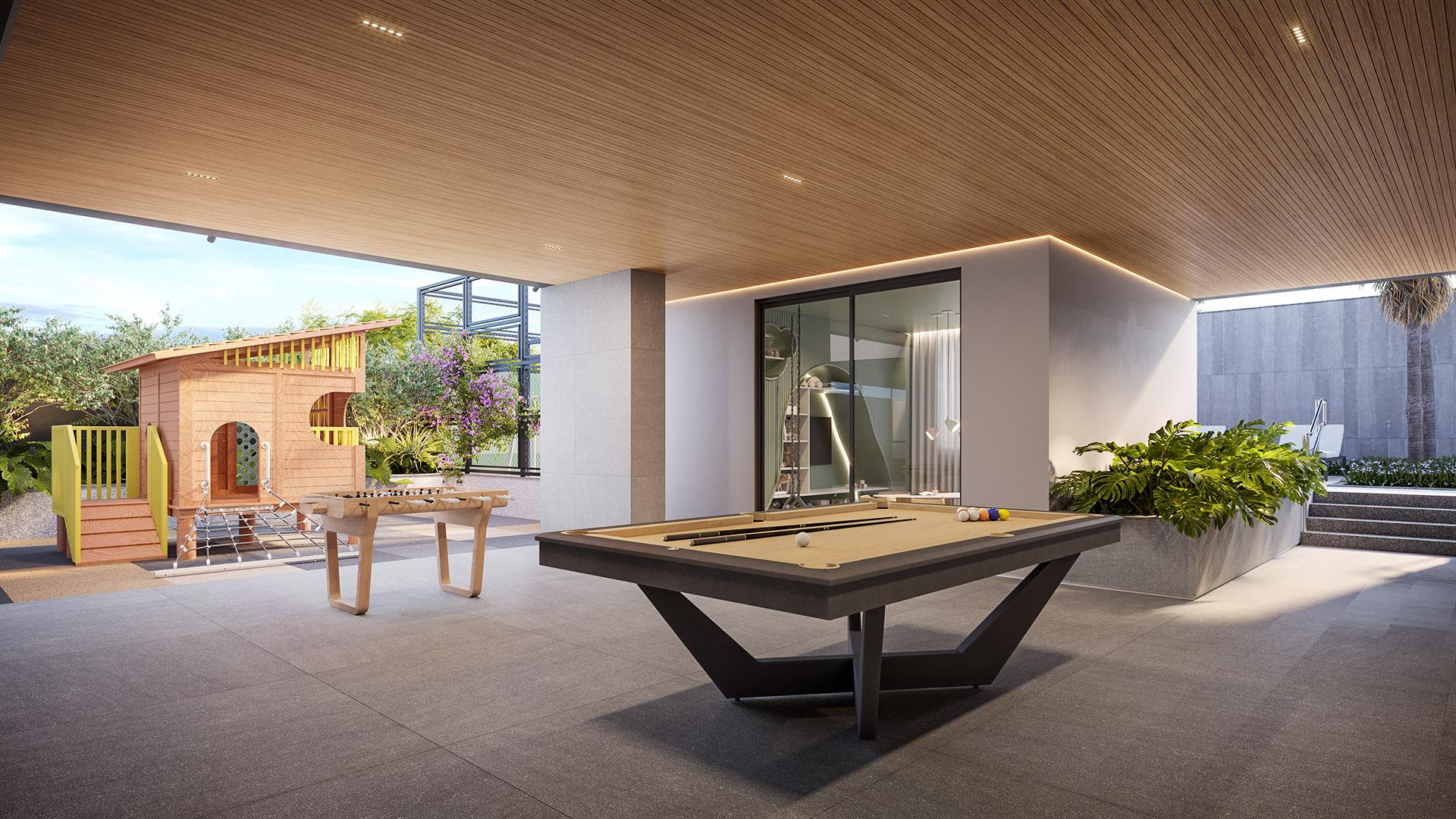 O lazer inclui piscinas, piscina hidro + sauna, deck piscina, salão de festas, gourmet com churrasqueira, lounge play, quadra, espaço kids, playground e academia com assinatura Grupo Flex.
