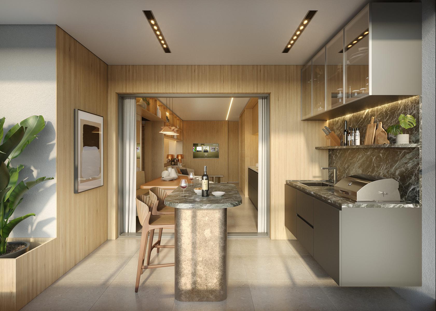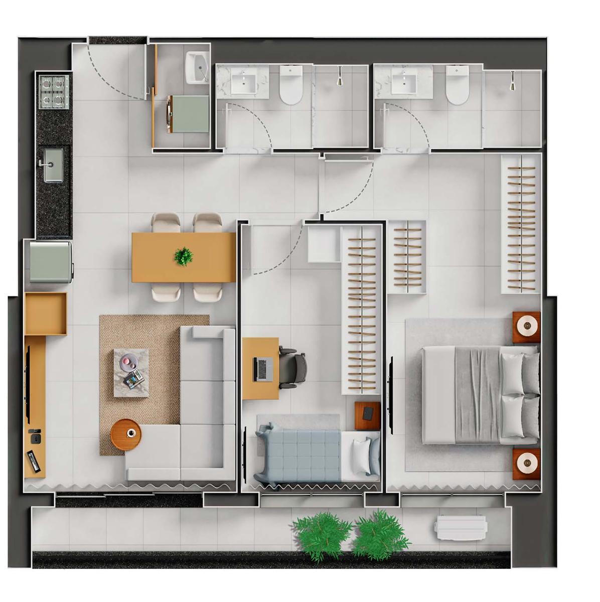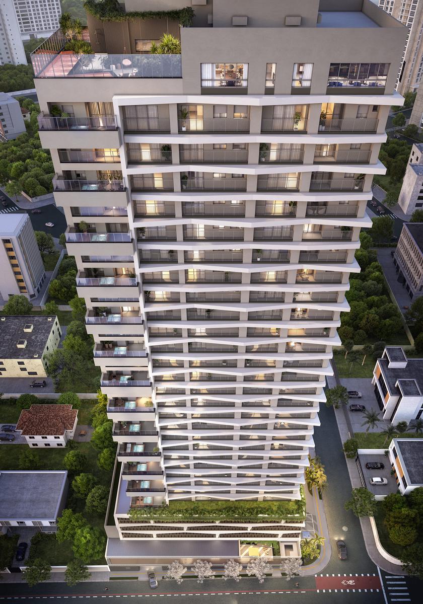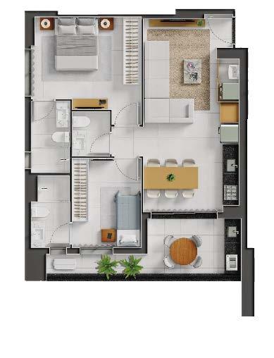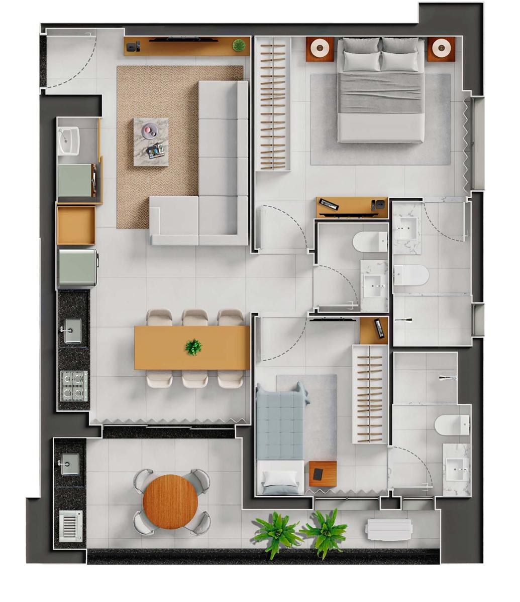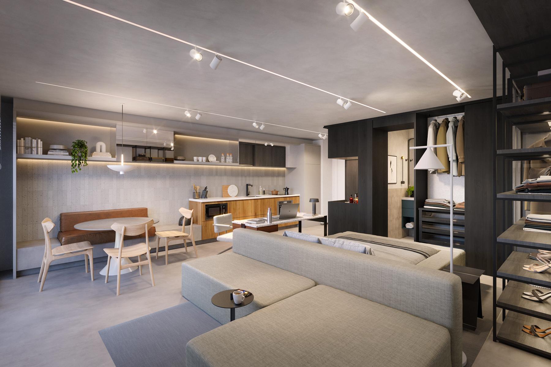 O City Way oferece três metragens distintas: studios de 50 m² e apartamentos de 2 suítes com 77 m² e 97 m².