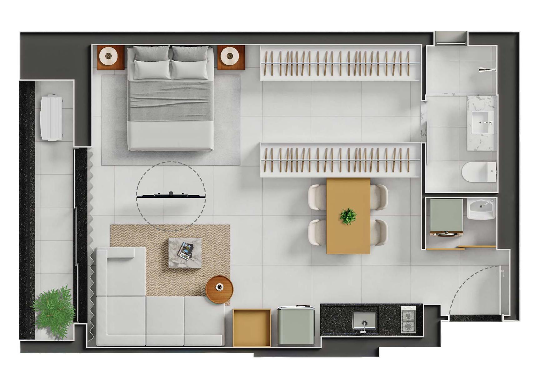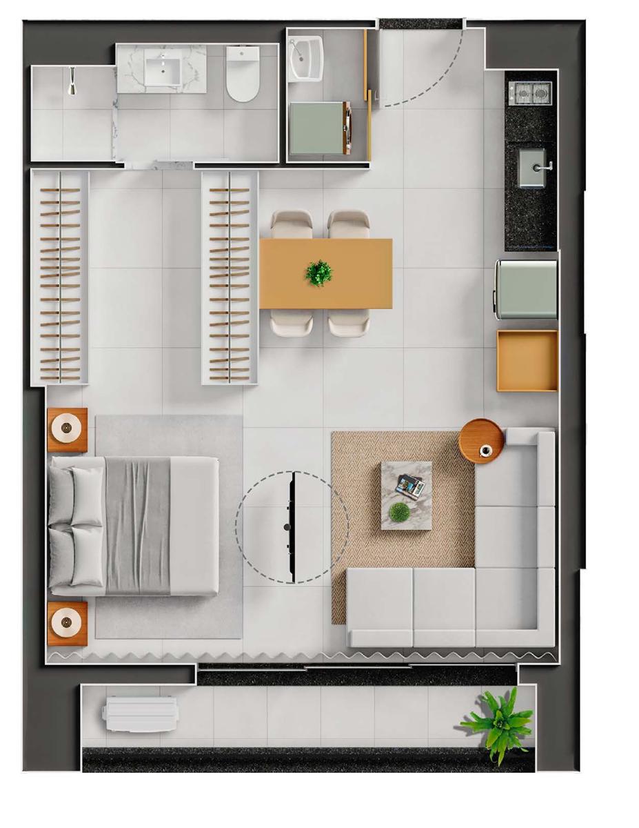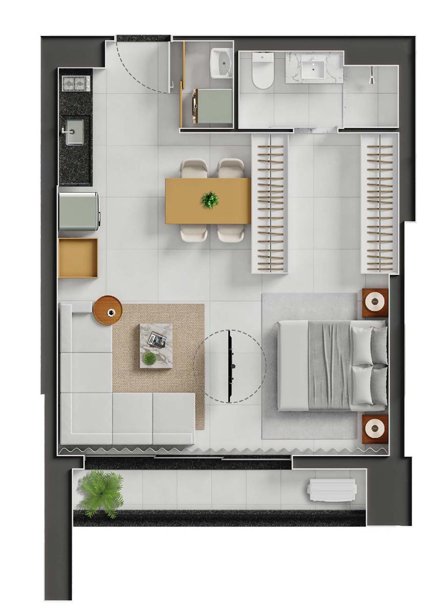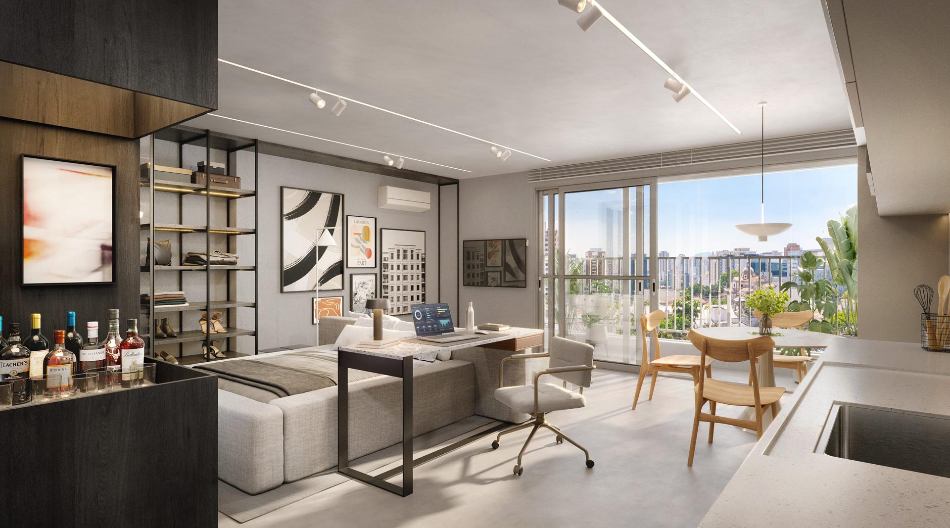 Os studios do City Way possuem metragens a partir de 50 m², com planta funcional que integra os ambientes de forma eficiente. Cada unidade conta com projeto acústico, favorecendo conforto e privacidade. Os acabamentos seguem o padrão do empreendimento, com iluminação planejada e distribuição inteligente para otimizar o espaço. As janelas proporcionam boa entrada de luz natural, enquanto a estrutura do condomínio garante praticidade com elevadores modernos e áreas comuns equipadas.