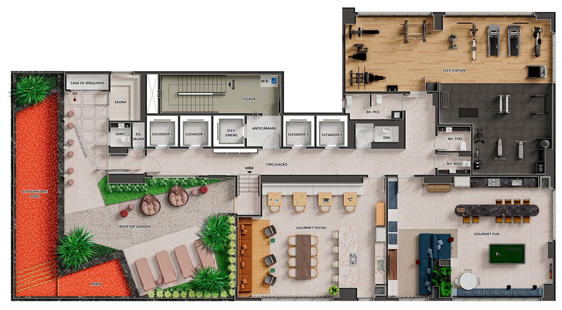 - Lazer: gourmet festas, gourmet pub, flex station, playground, city pool, rooftop garden, sauna, lavanderia, delivery room, sala de reuniões com coworking.
