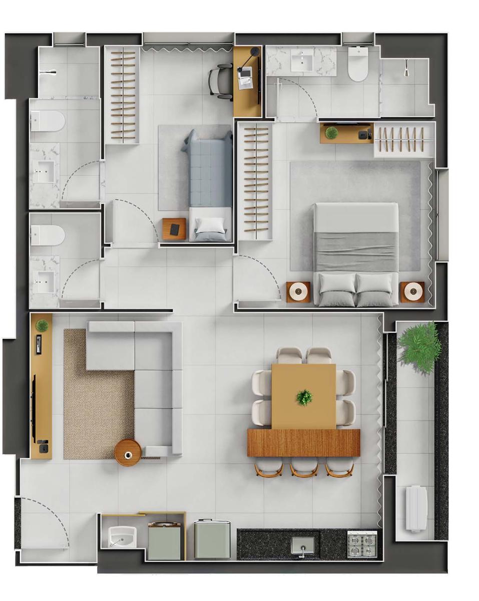 Os apartamentos do City Way apresentam metragens de 77 m² e 97 m², com 2 suítes e distribuição que privilegia conforto e funcionalidade. As unidades contam com projeto acústico, acabamentos de qualidade e integração dos ambientes sociais. As janelas favorecem a iluminação natural, enquanto a infraestrutura do prédio garante praticidade por meio de elevadores modernos e áreas comuns planejadas.
