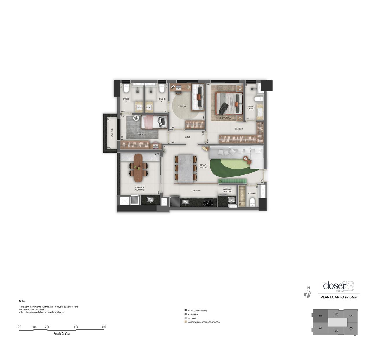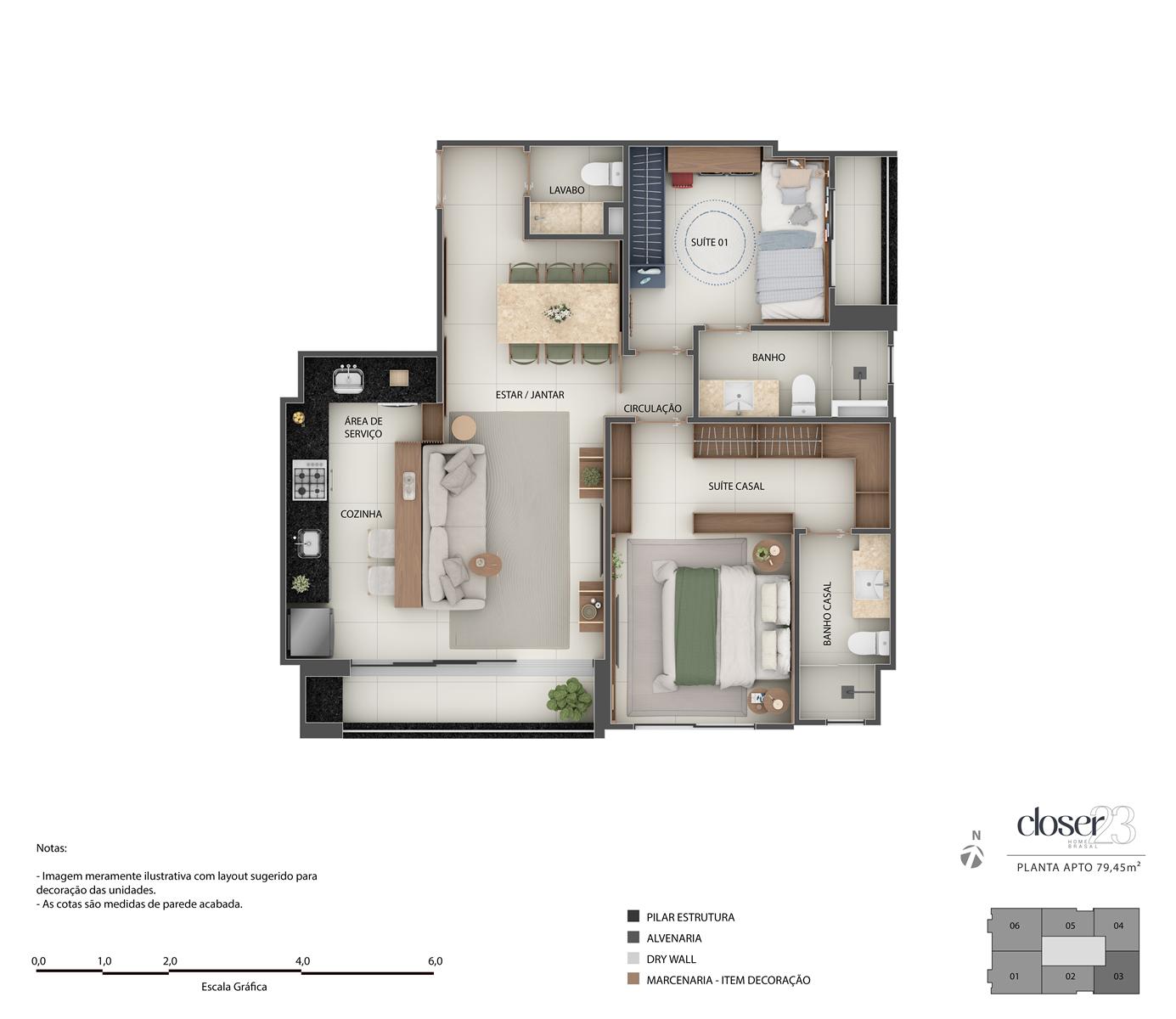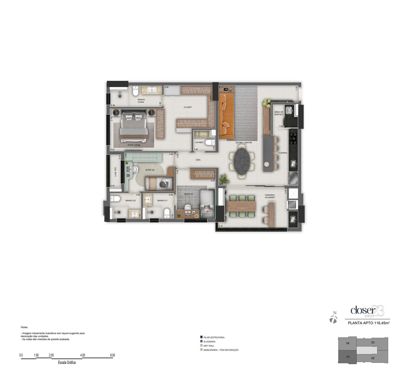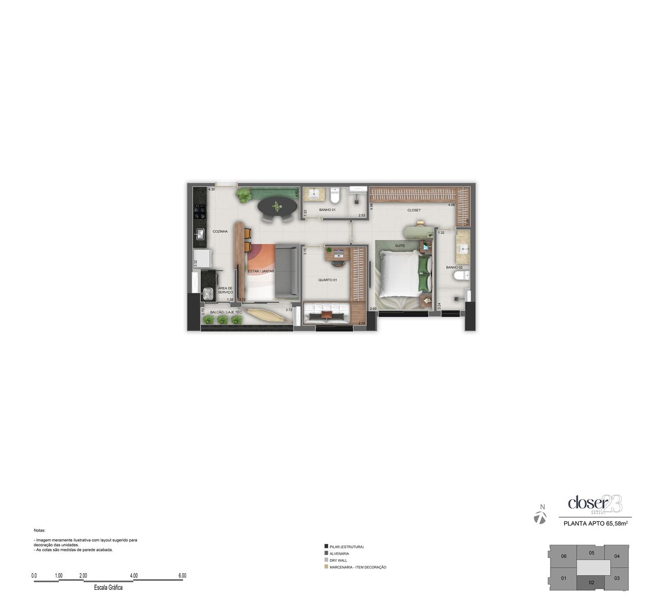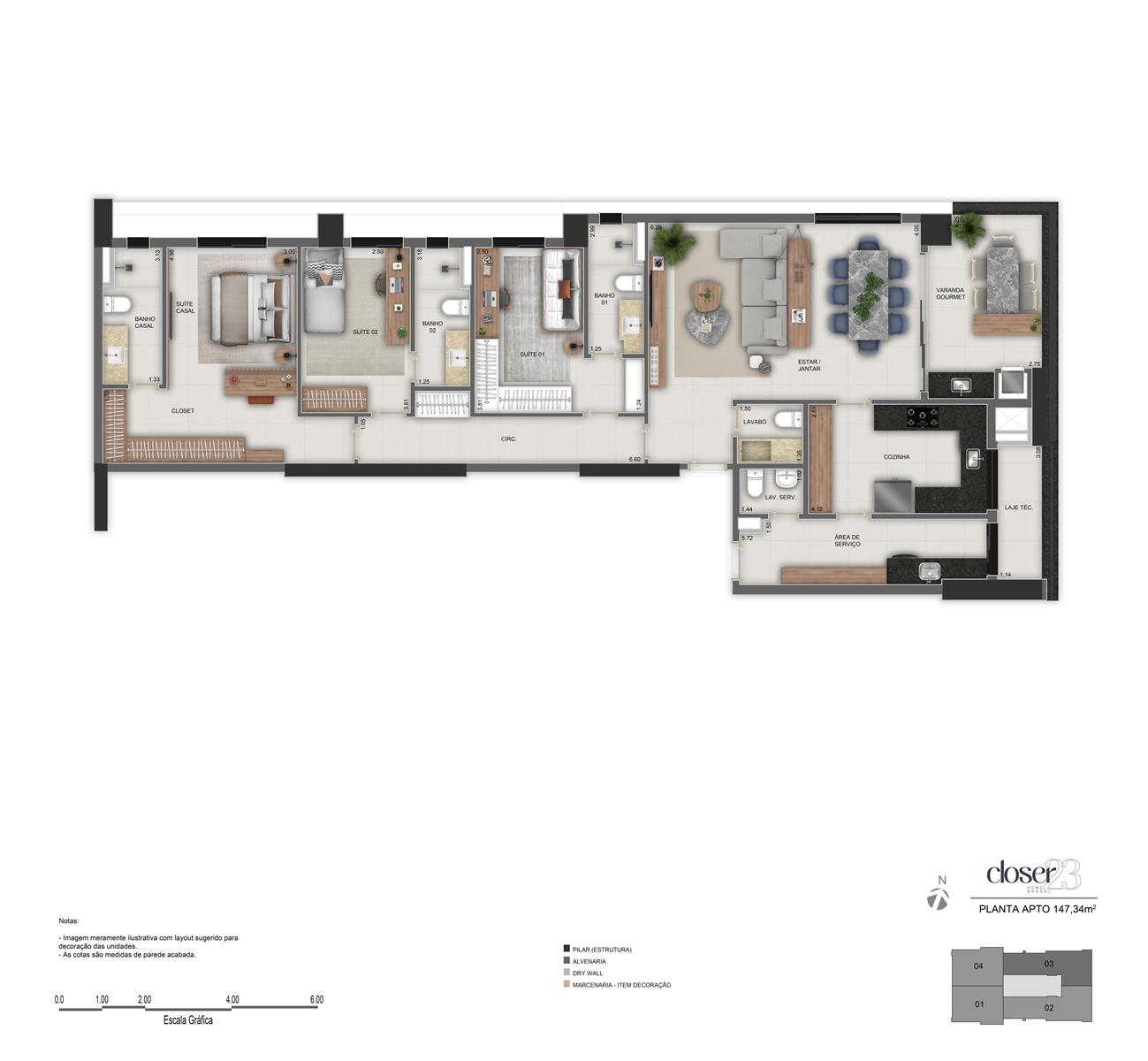 Os apartamentos do Closer 23 Home Brasal possuem plantas bem distribuídas, com metragens entre 65,14 m² e 147,34 m². As unidades variam entre 1 a 3 suítes, com varandas integradas, acabamentos em porcelanato, forro de gesso e infraestrutura para ar-condicionado. Algumas tipologias contam com churrasqueira, além de opções com até 3 vagas de garagem, garantindo funcionalidade e conforto.