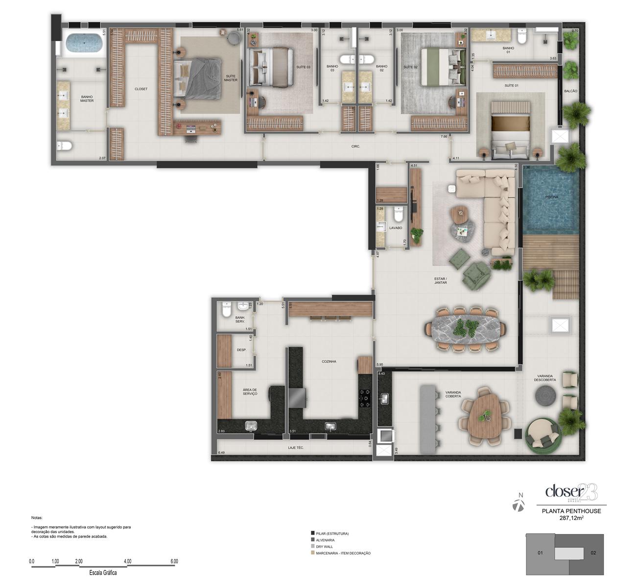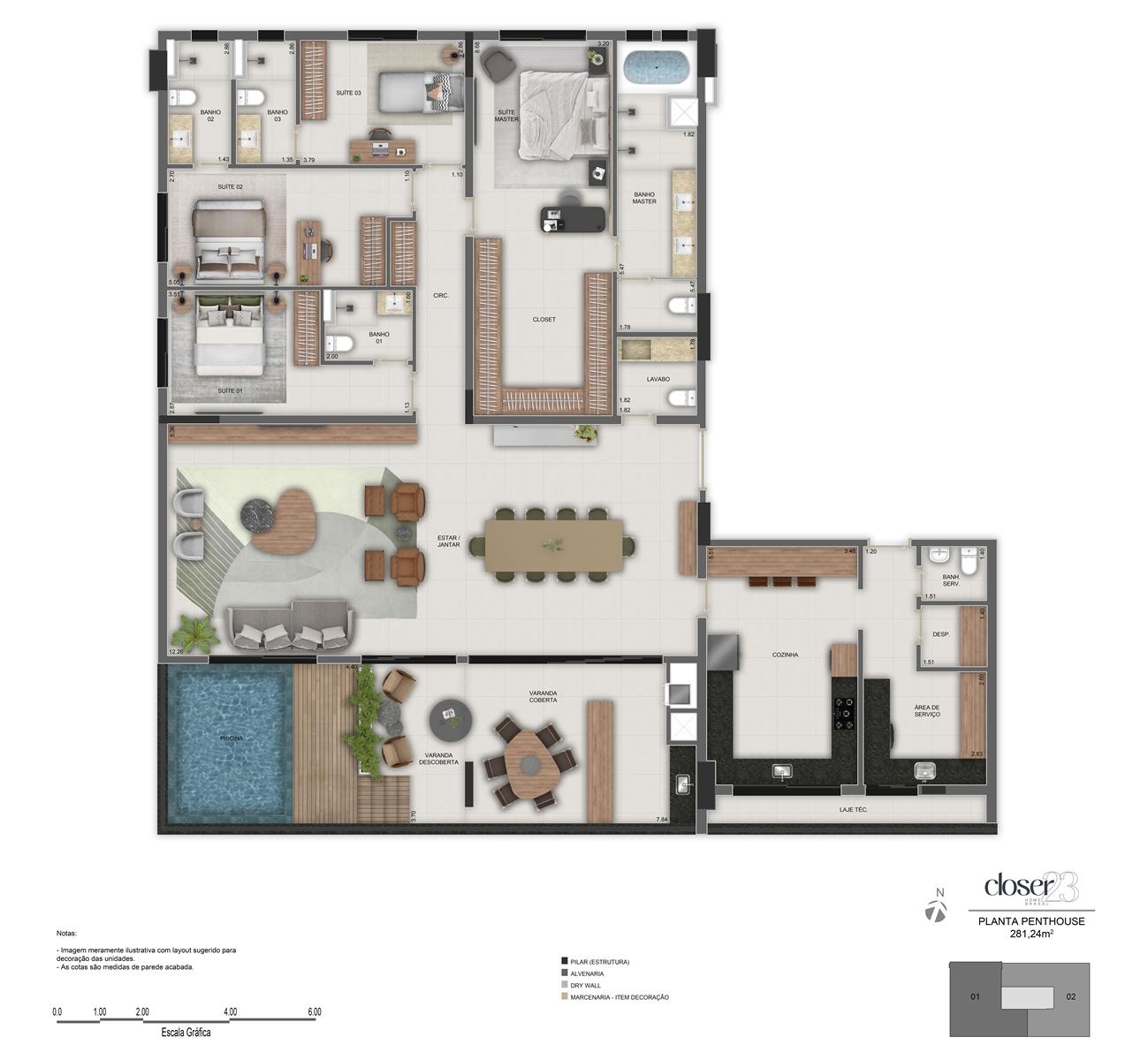 As coberturas do Closer 23 Home Brasal possuem metragens de 281,24 m² e 287,12 m², com plantas de 4 suítes. As unidades contam com amplas áreas sociais, varandas cobertas e descobertas, além de previsão para piscina privativa. Os acabamentos seguem o padrão do empreendimento, com porcelanato de grandes formatos, infraestrutura para climatização e até 3 vagas de garagem.