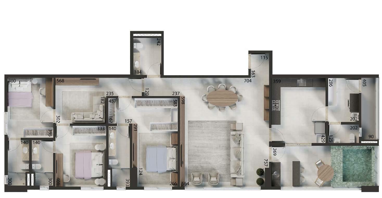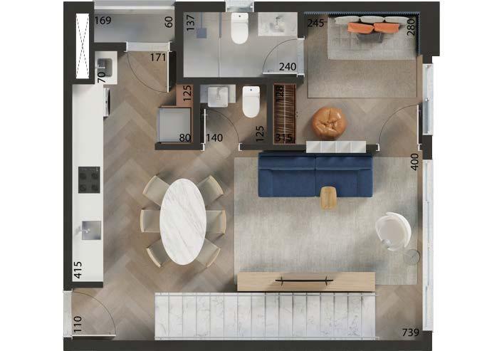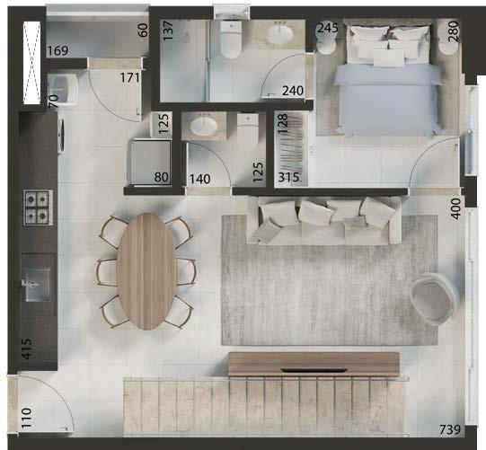O empreendimento conta com apartamentos lineares e duplex de 59 m² a 90 m², além de penthouses de 175 m² a 198 m², com 2 quartos, 2 suítes ou 3 suítes, conforme a tipologia.