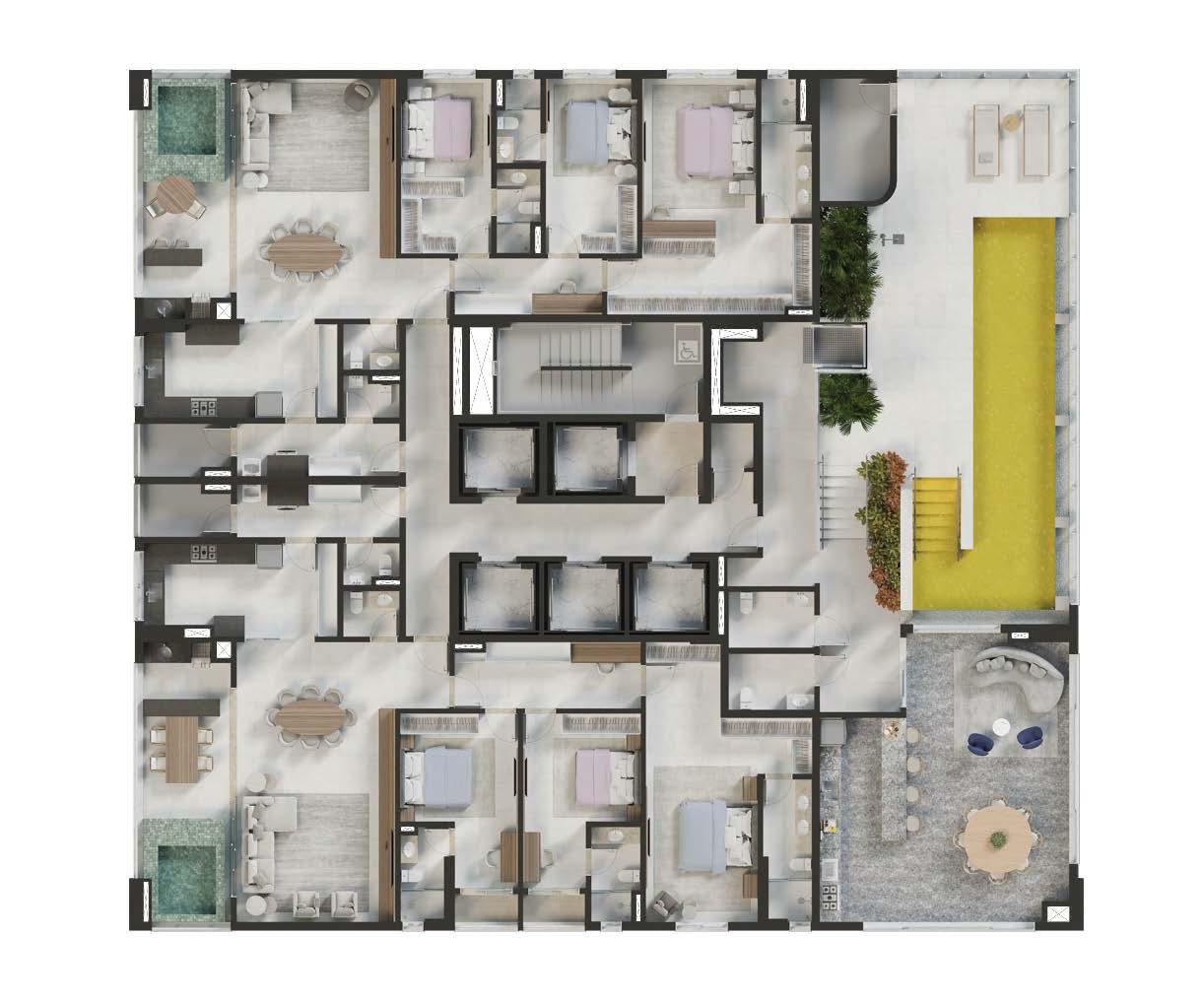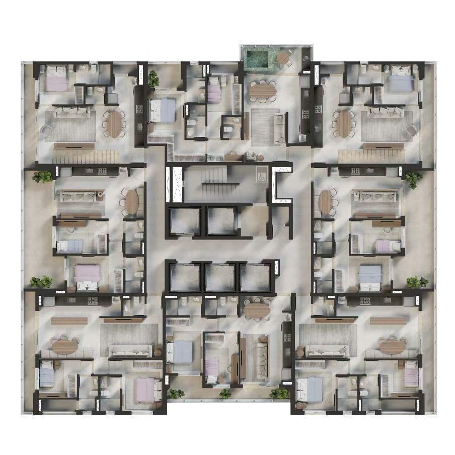 • Lazer: Piscina adulto e infantil, Churrasqueira, Golden Pool no rooftop, Rooftop gourmet, Brinquedoteca, Playground, Mini quadra, Lounge jogos, Salão de festas, Academia, Mini market, Bicicletário, Coworking, Spa nórdico;