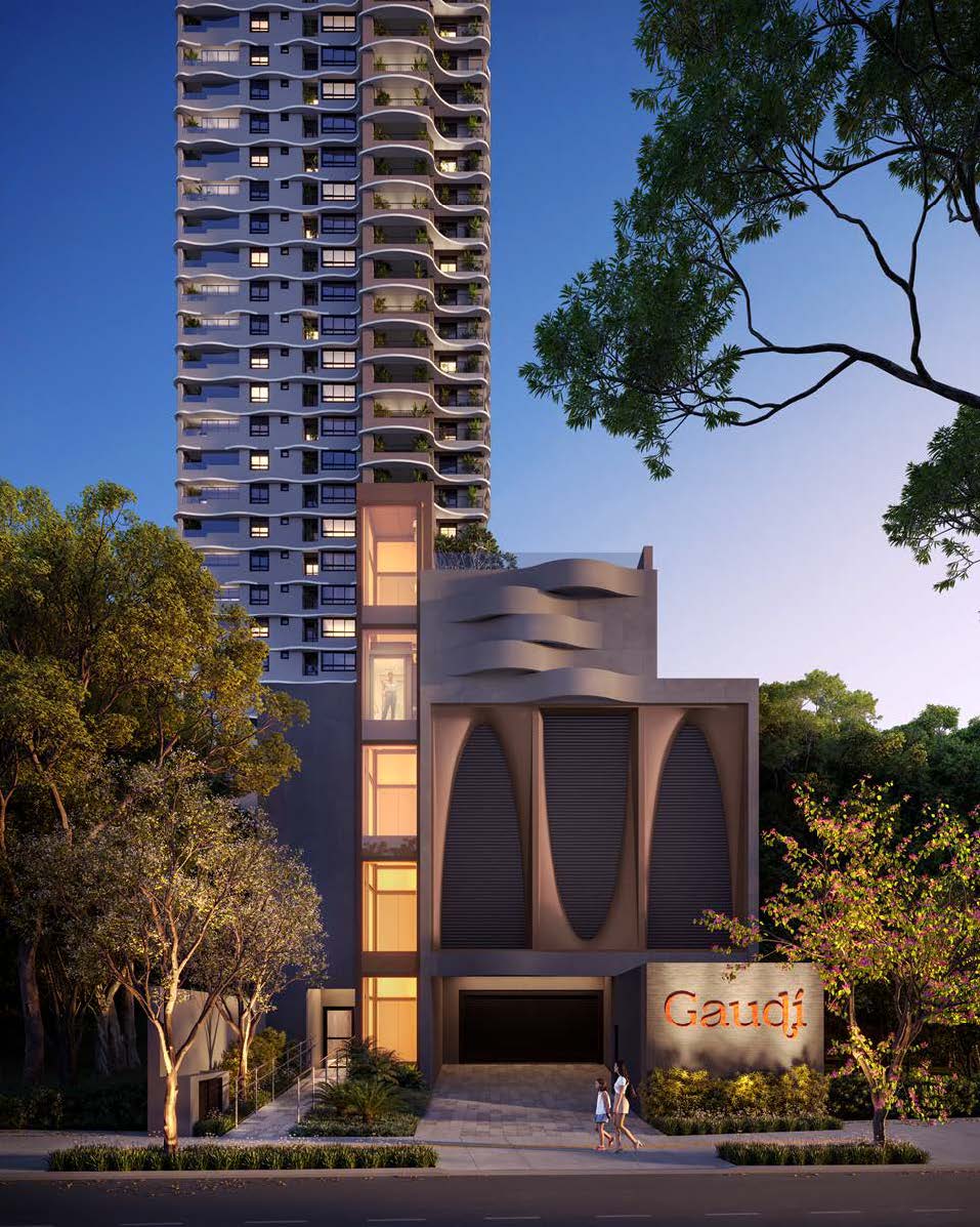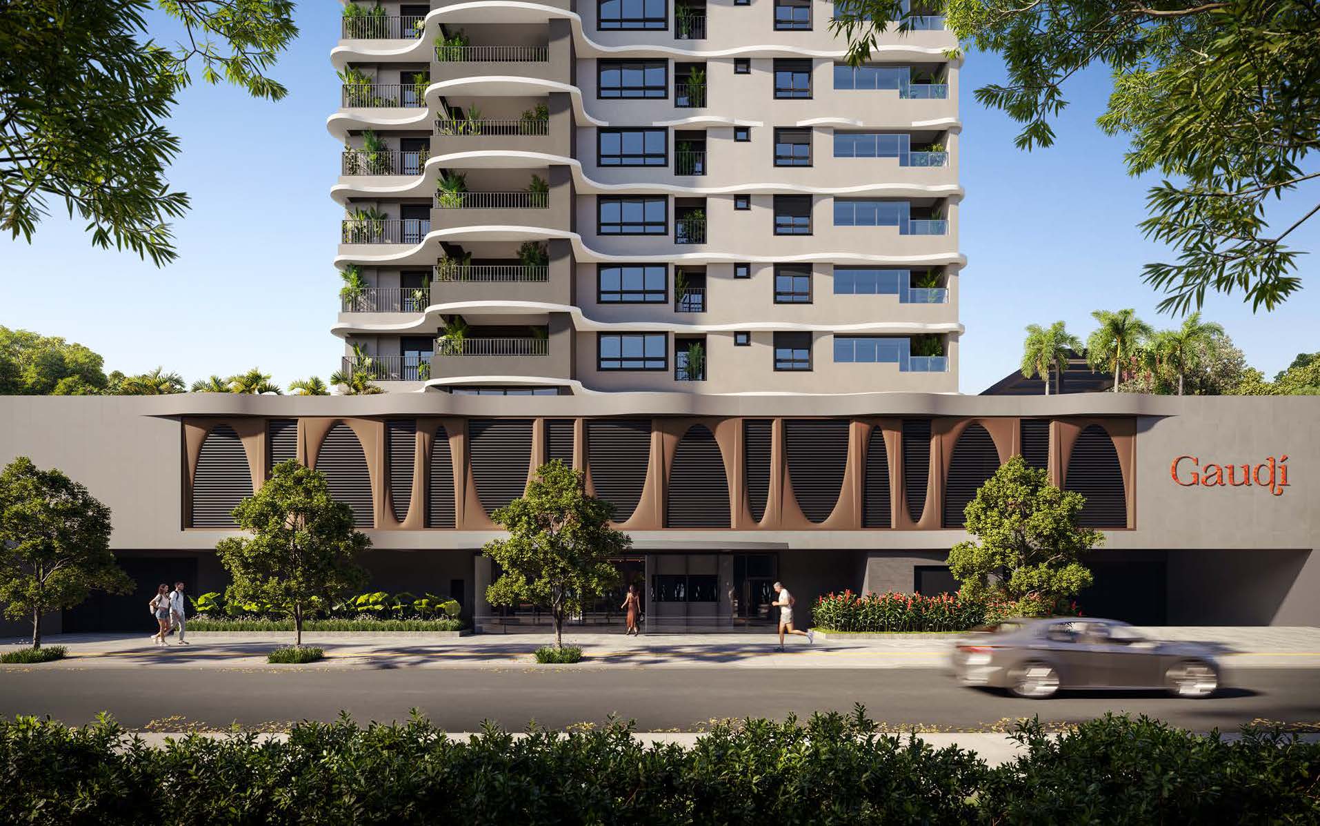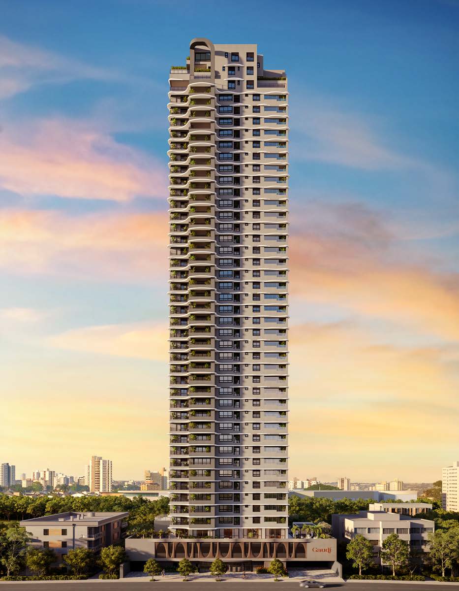 Os apartamentos do Gaudí possuem metragens entre 74 m², 80 m² e 134 m², com opções de 2 quartos ou 3 suítes, além de unidades com piscina privativa. As penthouses variam de 174 m² a 269 m², com 3 ou 4 suítes e piscina privativa. O empreendimento oferece áreas de lazer completas, elevador panorâmico, bicicletário, mini market, segurança reforçada e soluções sustentáveis integradas ao condomínio.