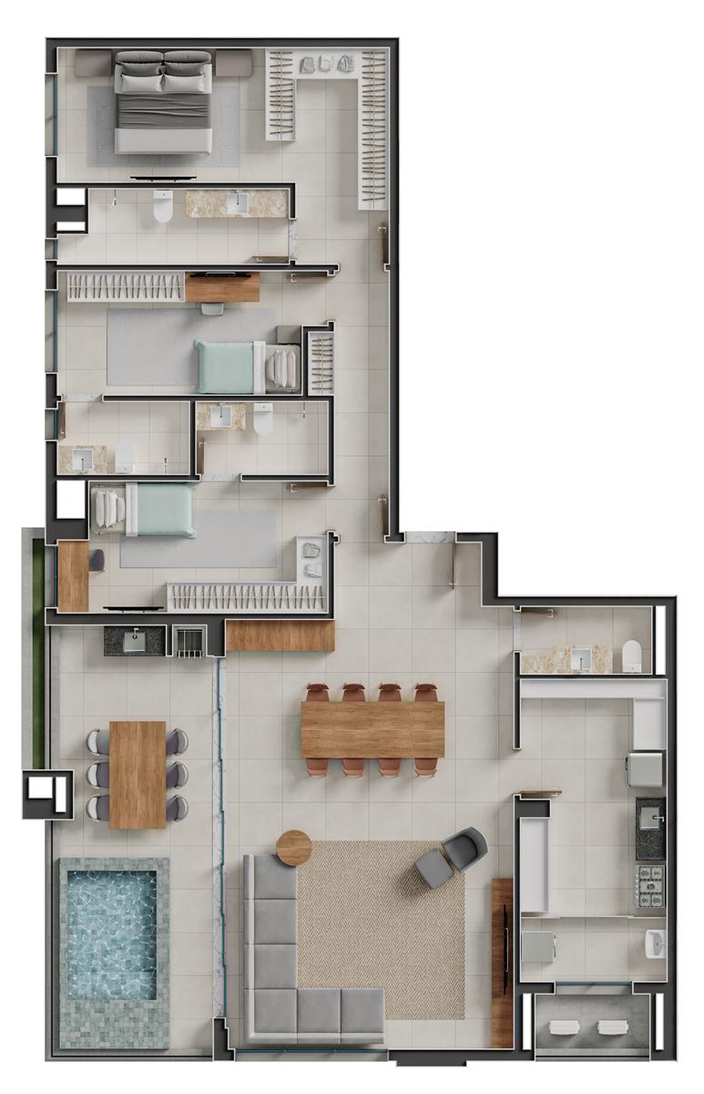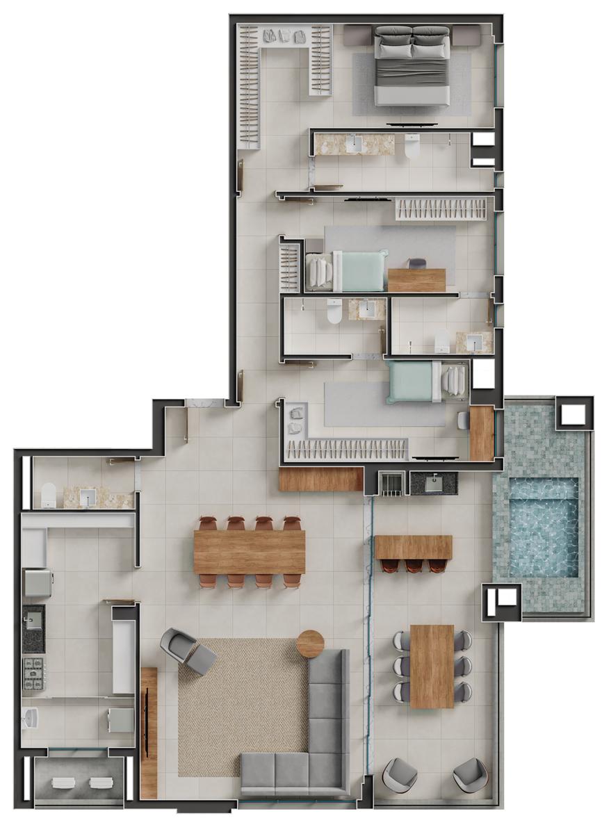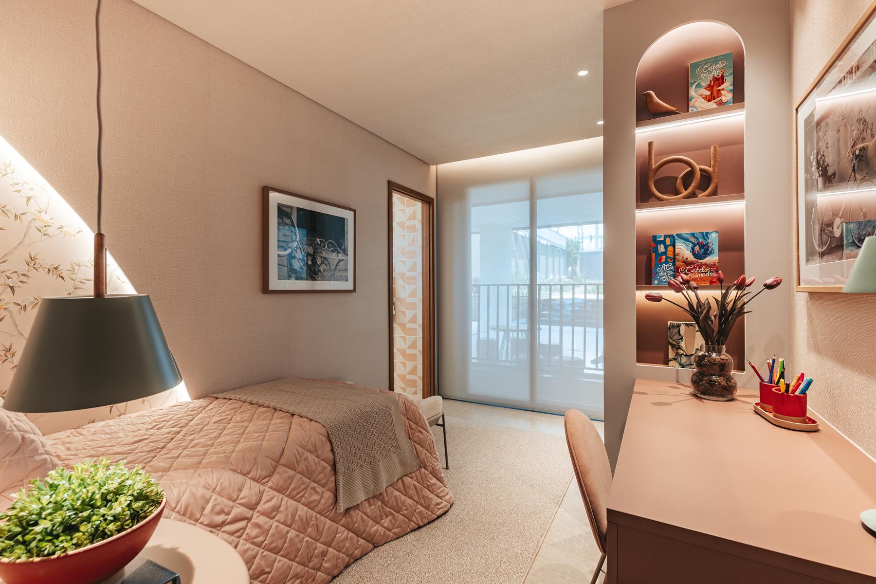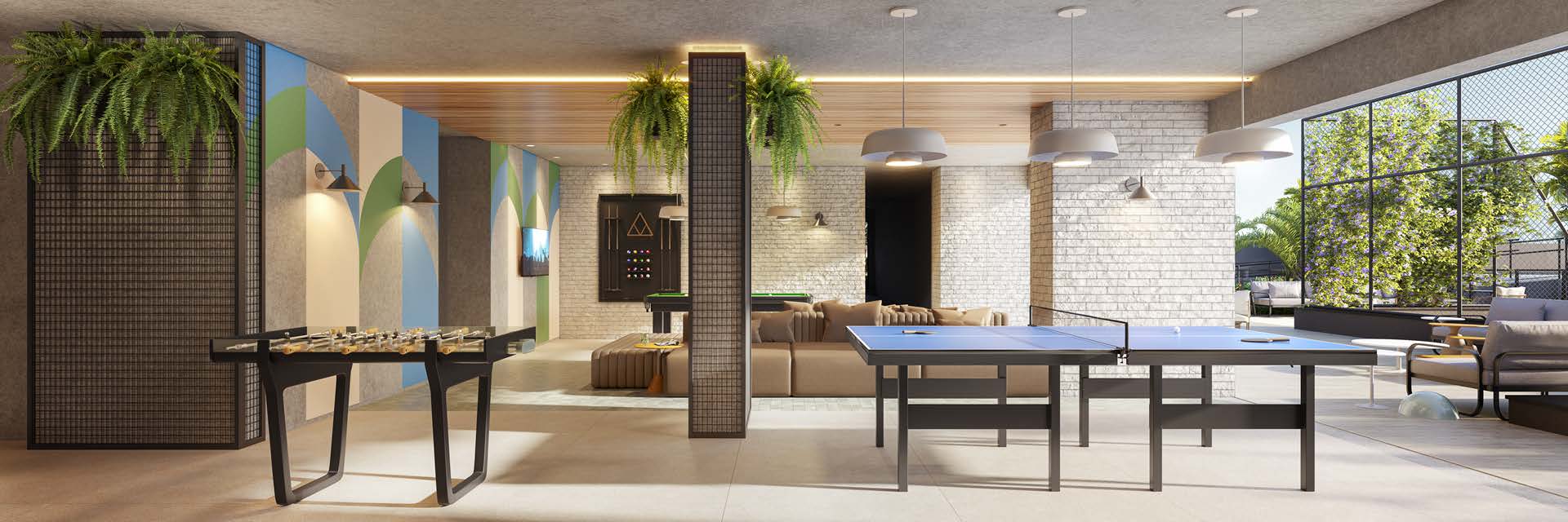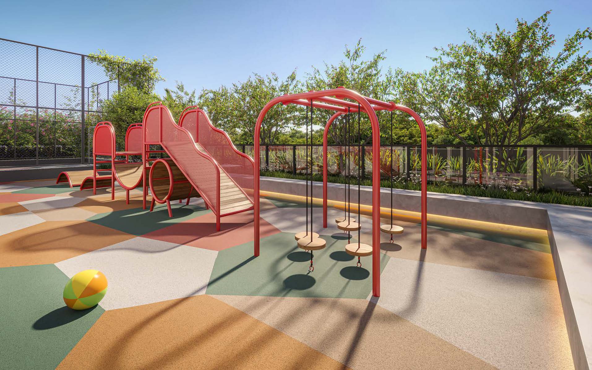 - Lazer: salão de festas, coworking, espaço gourmet, churrasqueira, piscina adulto, piscina infantil, pool house, spa, sauna, fitness, varanda fitness, lounge jogos, playground, brinquedoteca, beach tennis, mini quadra.