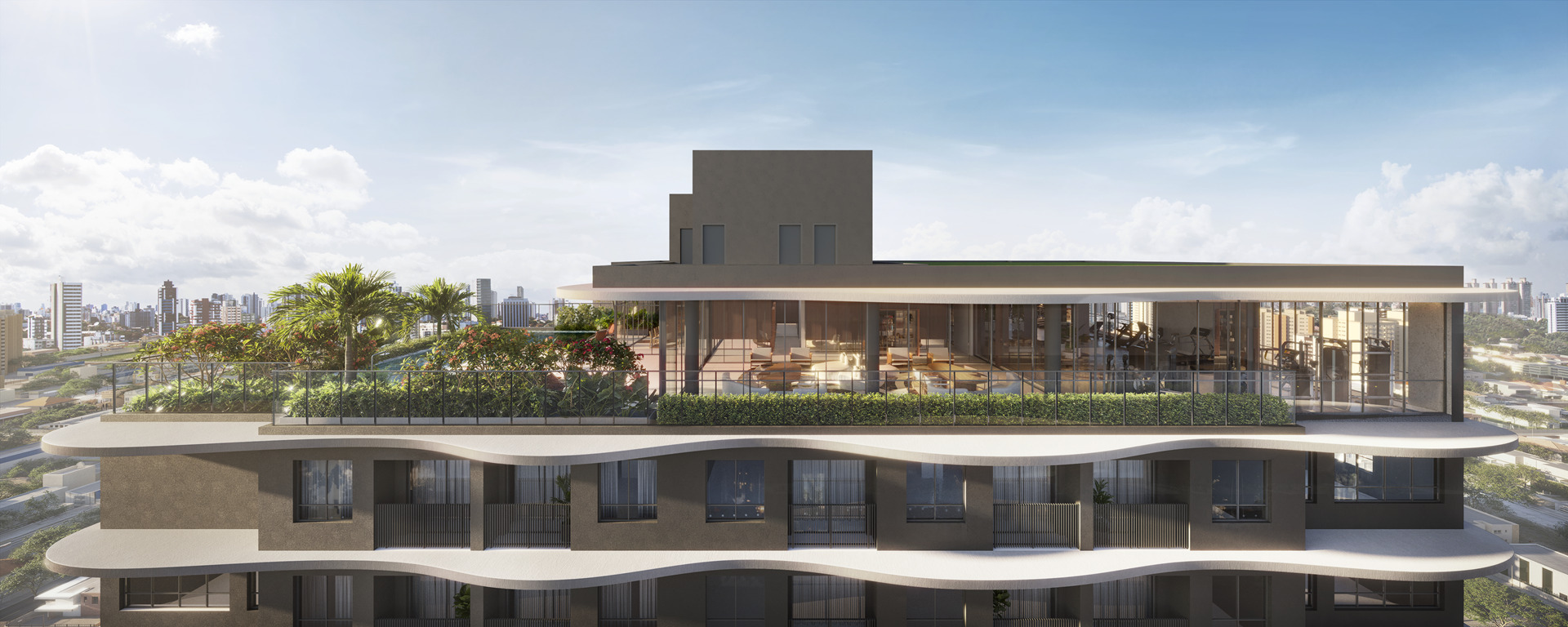 O lazer está concentrado no rooftop e inclui piscina climatizada com solarium e hidromassagem, lounge multiuso, espaço gourmet, academia Opus Gym e sauna, além de vistas amplas da região.
