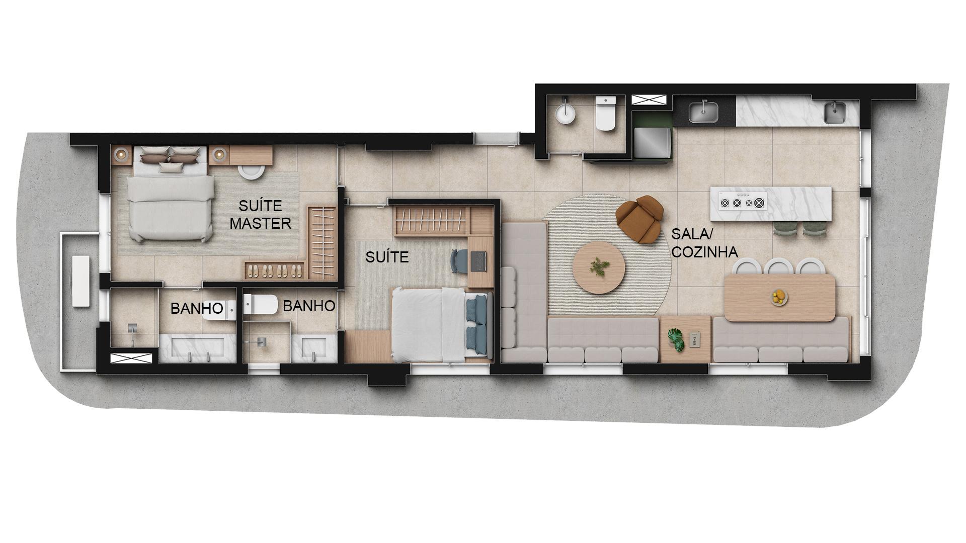 O Opus Zoom possui 306 unidades residenciais distribuídas em tipologias compactas entre 36 m² e 71 m².