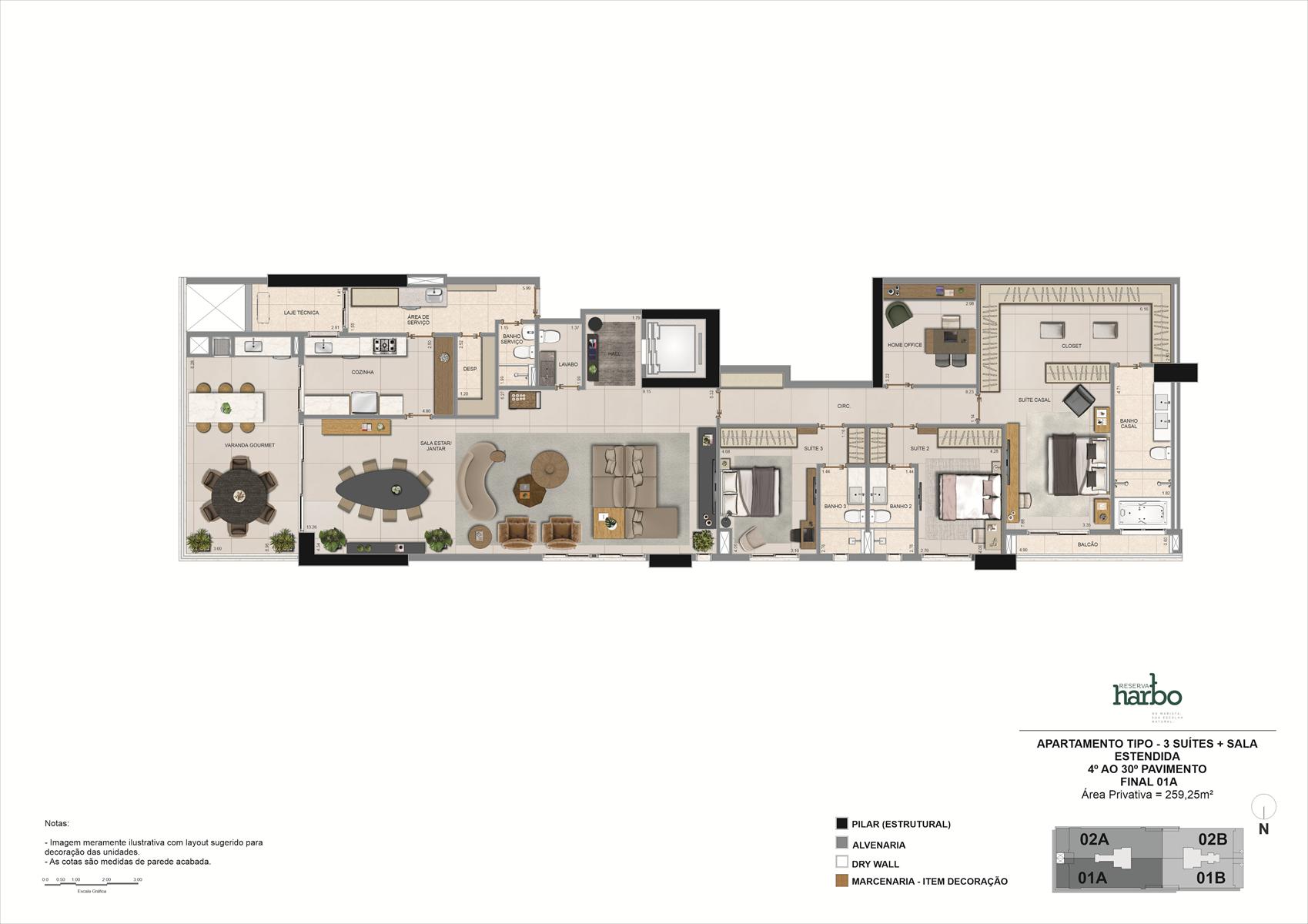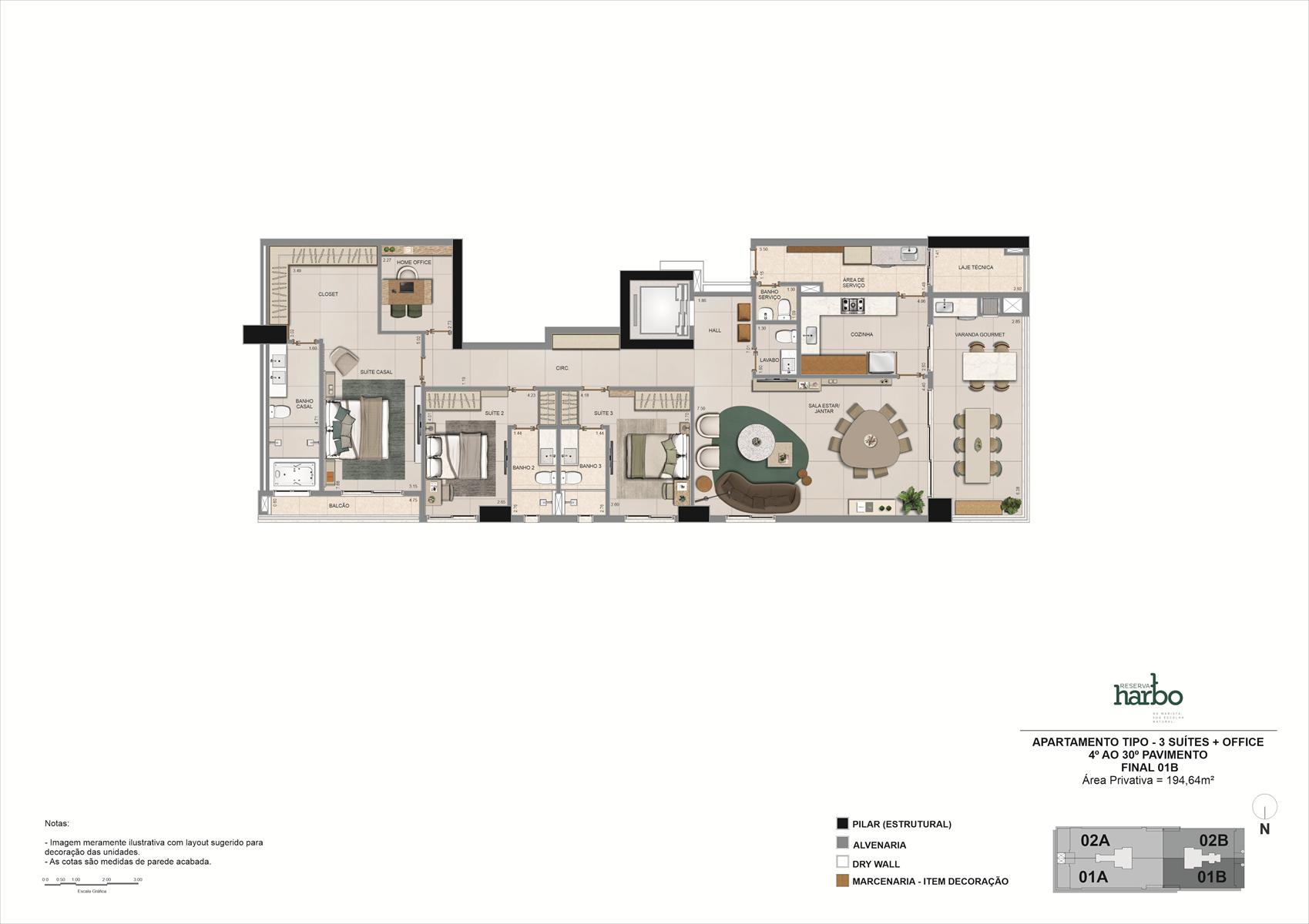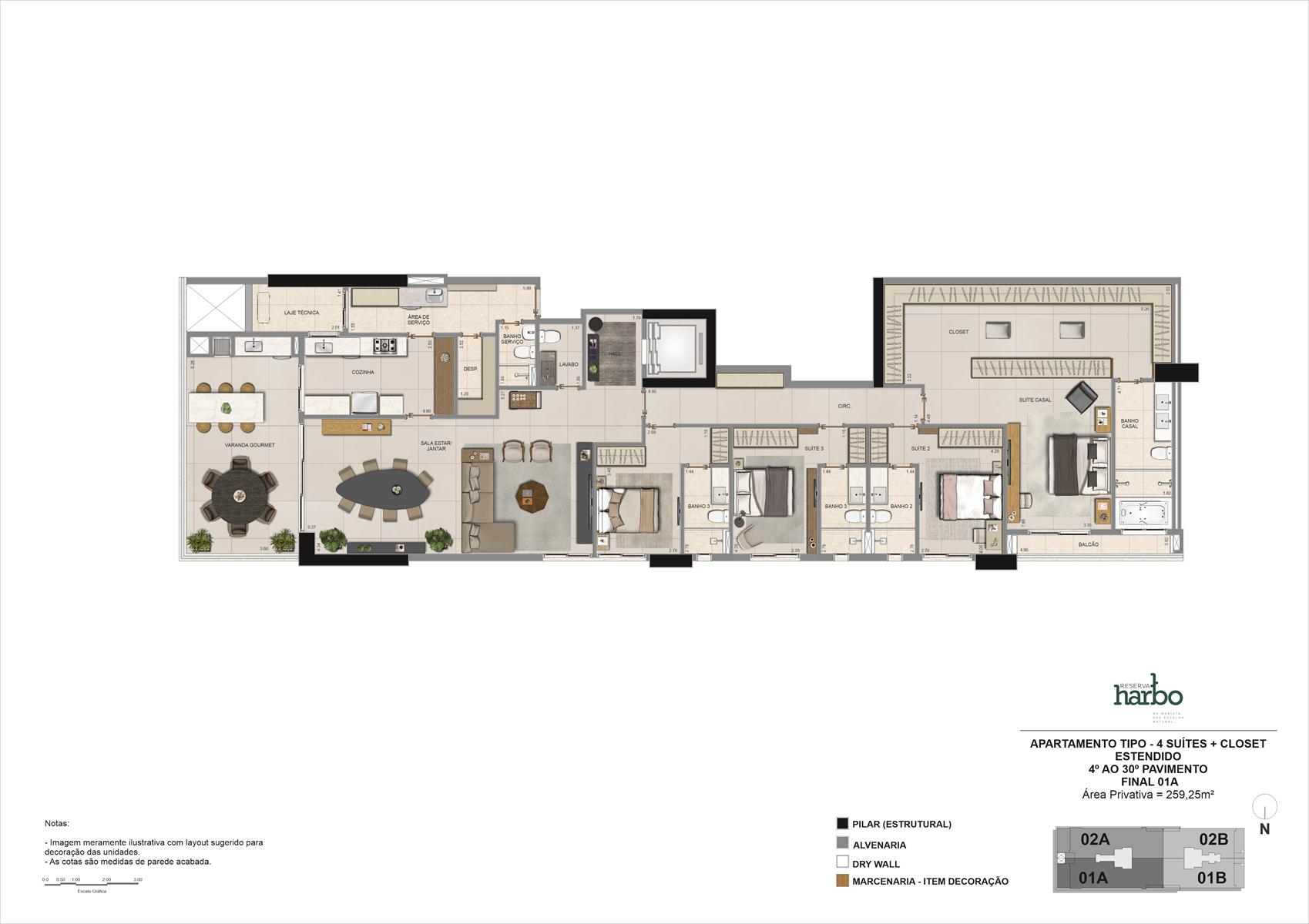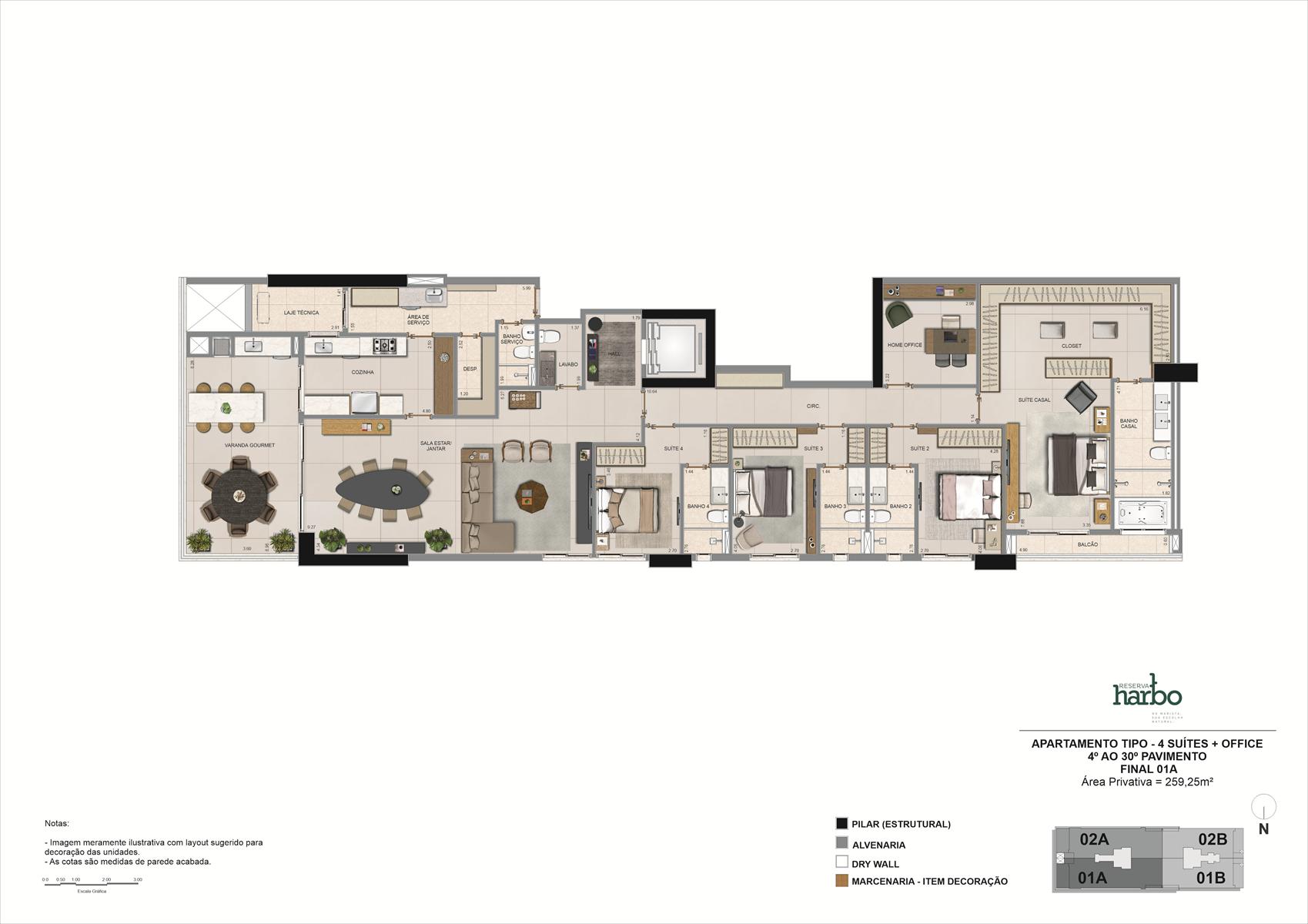 Os apartamentos do Reserva Harbo possuem metragens de 194,64 m² e 259,25 m², com 3 ou 4 suítes e até 4 vagas de garagem, enquanto as penthouses variam entre 391,35 m² e 524,95 m², com 5 suítes. Todas as unidades contam com varanda gourmet, churrasqueira a carvão, hall privativo e plantas flexíveis. O condomínio oferece lazer completo, segurança reforçada e áreas comuns entregues equipadas, climatizadas e mobiliadas.