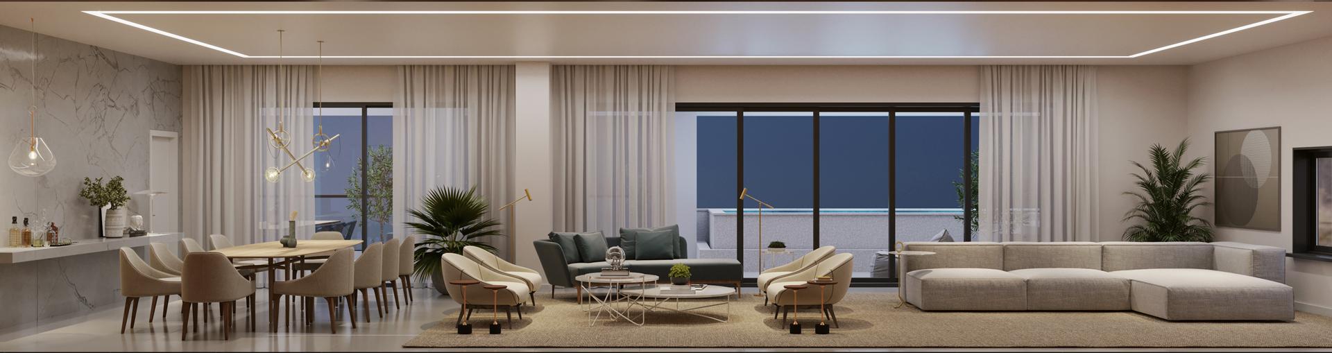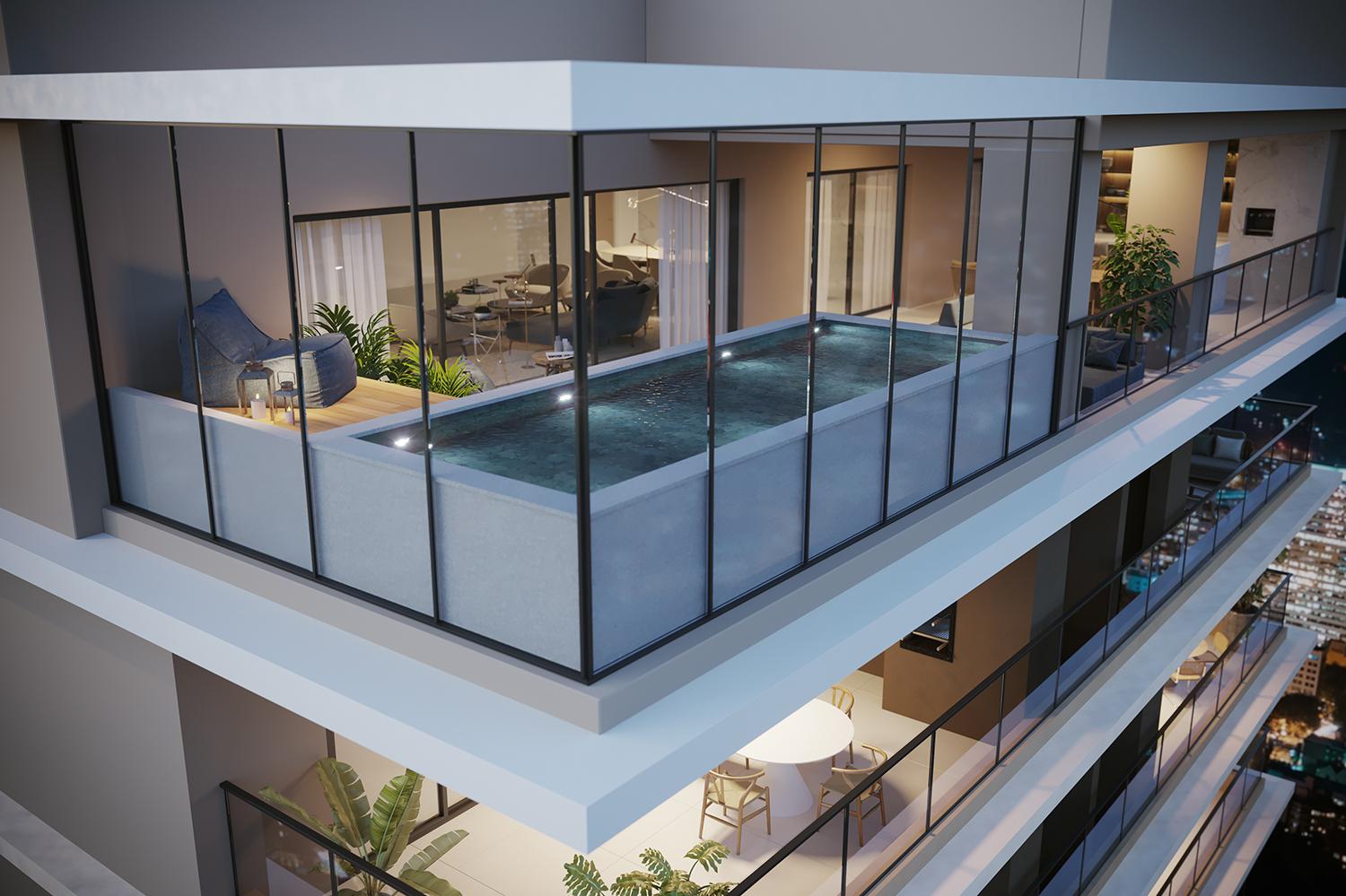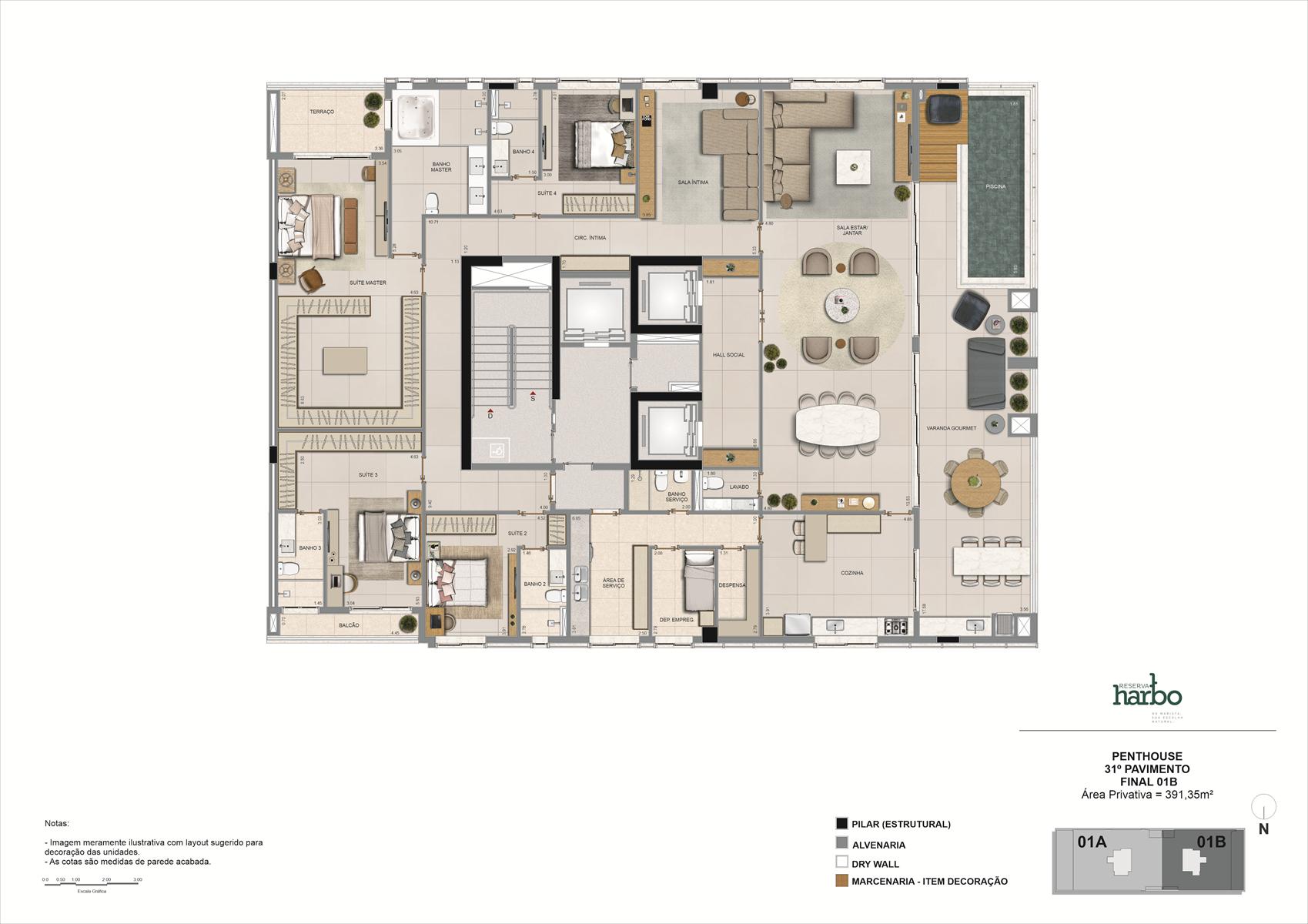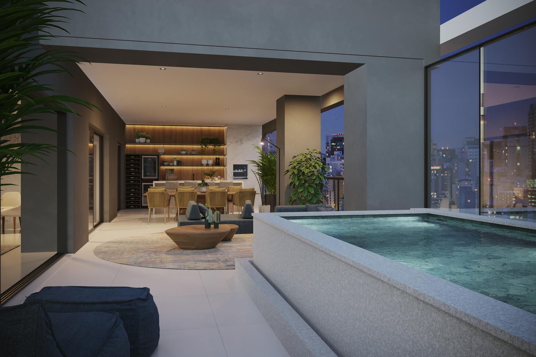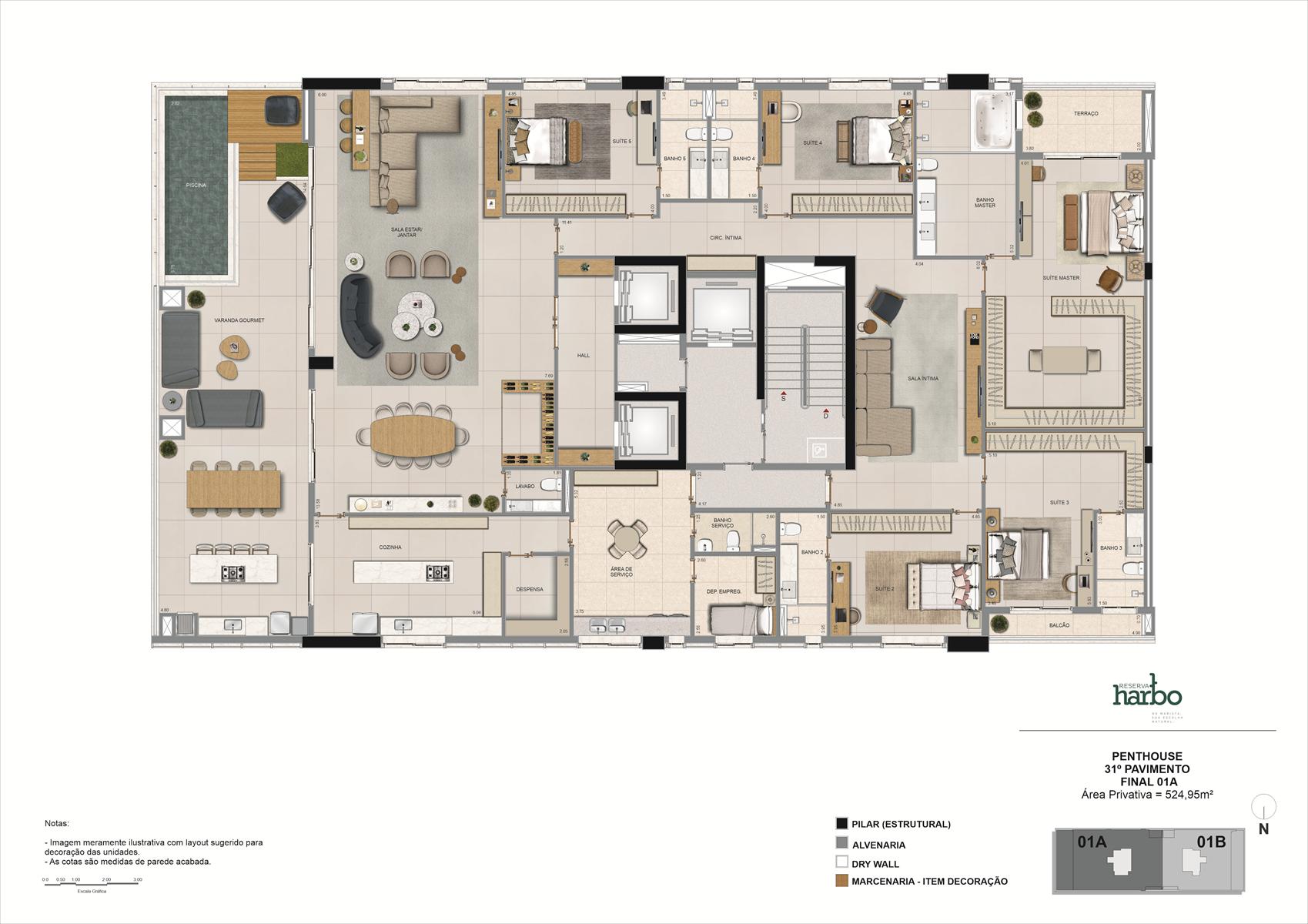 As coberturas do Reserva Harbo estão localizadas no 31º pavimento e contam com metragens de 391,35 m² e 524,95 m². As unidades possuem 5 suítes, ampla área social, varanda gourmet com piscina privativa e até 4 vagas de garagem. A distribuição dos ambientes privilegia áreas de convivência integradas e espaços íntimos bem definidos, com acabamentos alinhados ao padrão do empreendimento.