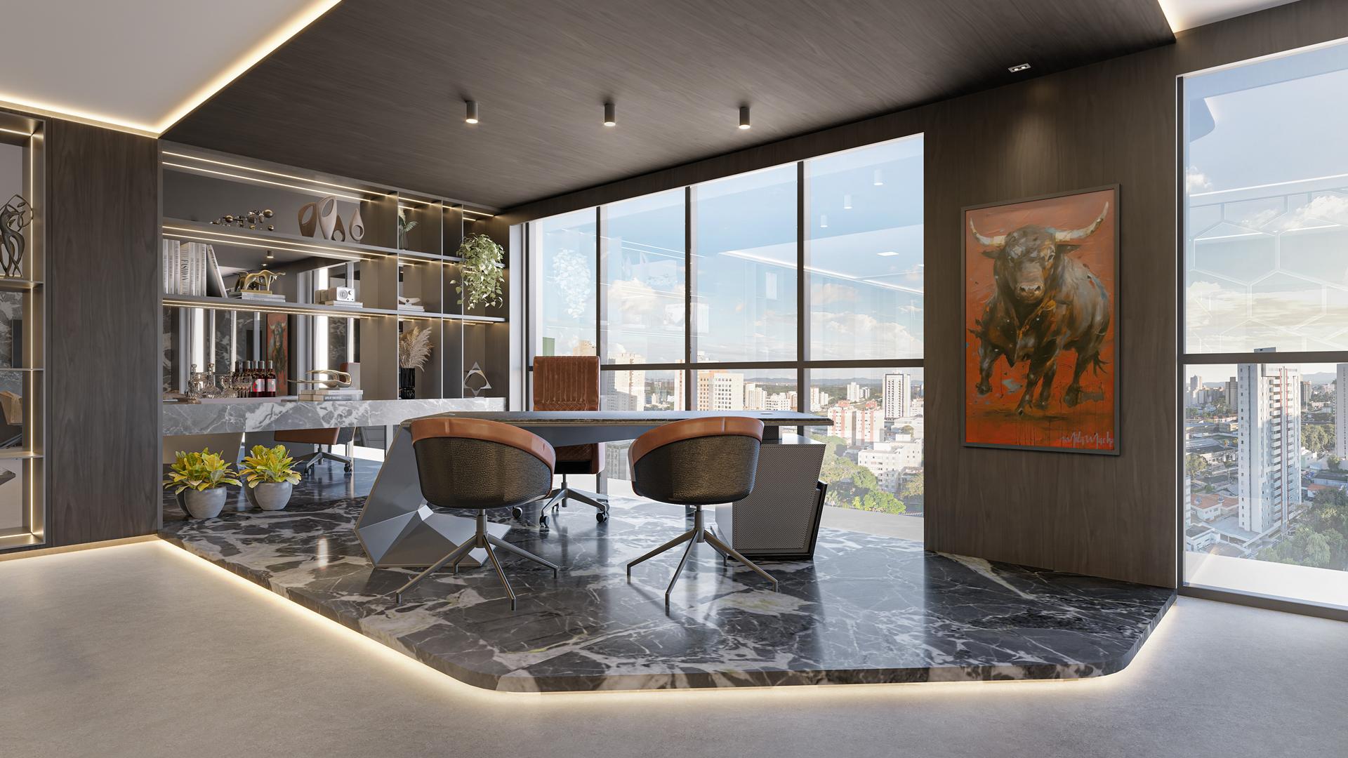As salas comerciais ocupam pavimentos dedicados, com infraestrutura técnica completa para operações corporativas. A torre oferece laje técnica central, gerador full-time, esquadrias amplas em alumínio e acesso independente ao setor empresarial. Os espaços contam com halls exclusivos, business center, auditório, salas de reunião e ambientes planejados para operações de alto desempenho. A disposição dos pavimentos favorece funcionalidade e integração entre empresas, serviços e áreas comuns.