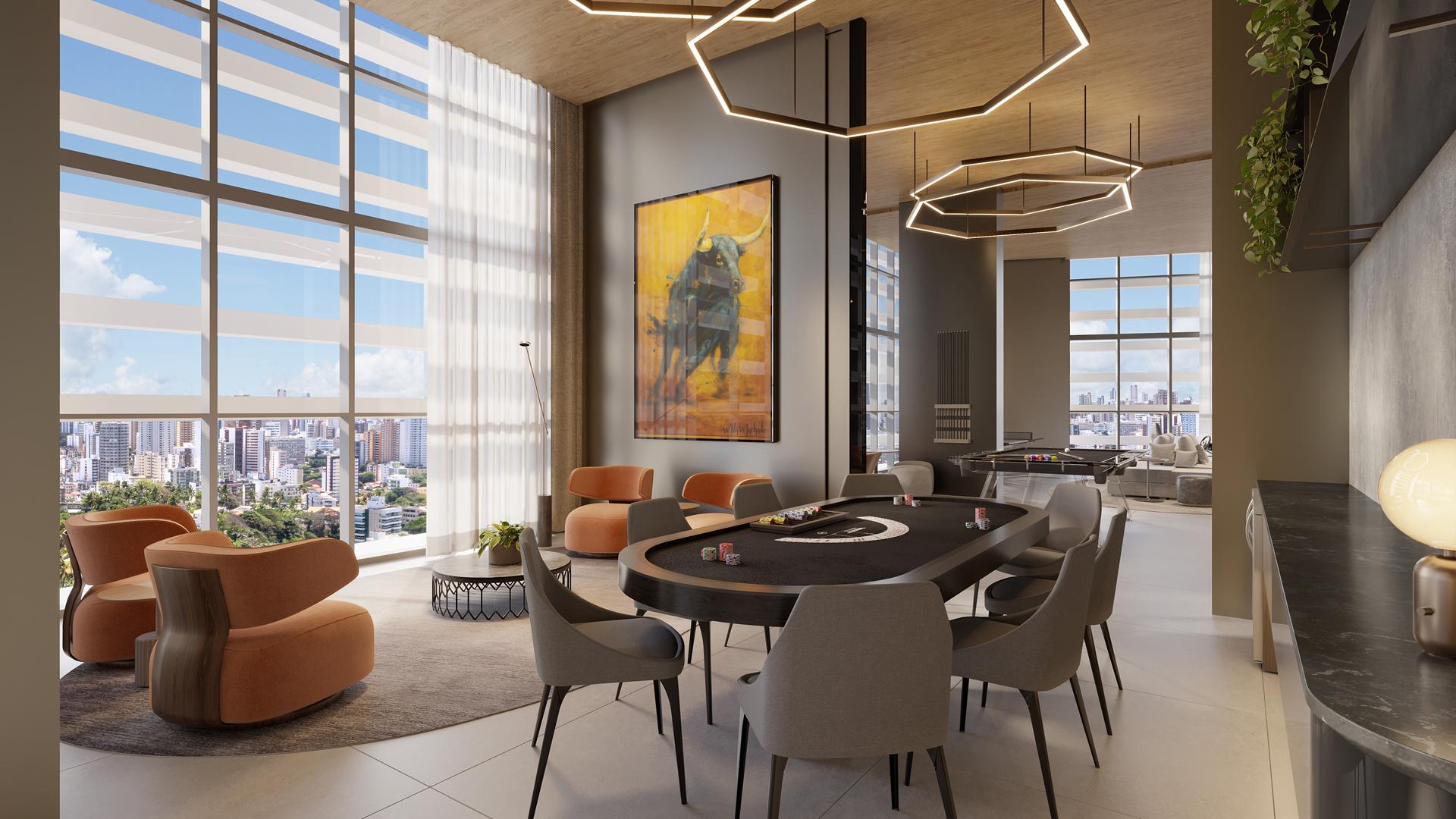 • Lazer: salão de festas, lavanderia, fitness center, yoga e pilates, wine bar/pub, salão de jogos, espaço kids, lounge gourmet, espaço gourmet, sauna, sala de massagem, piscina com borda infinita.