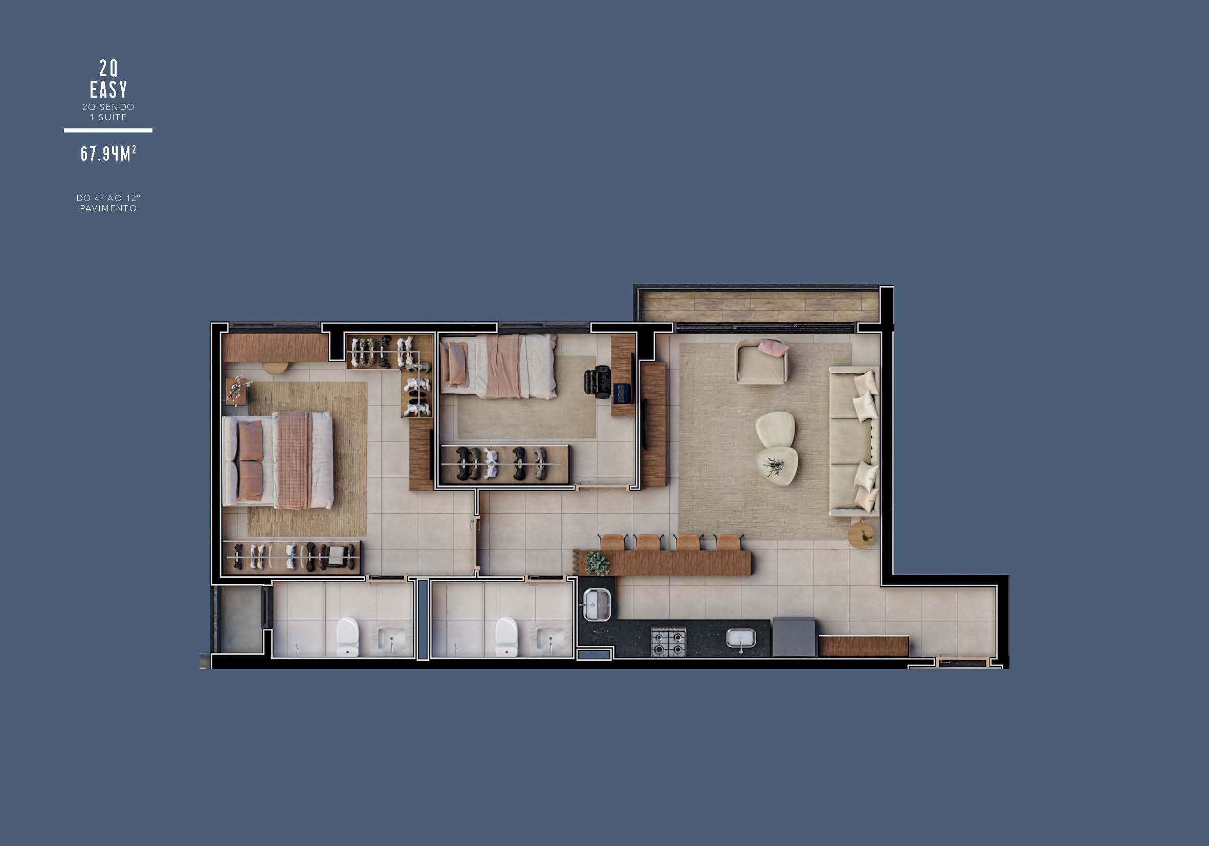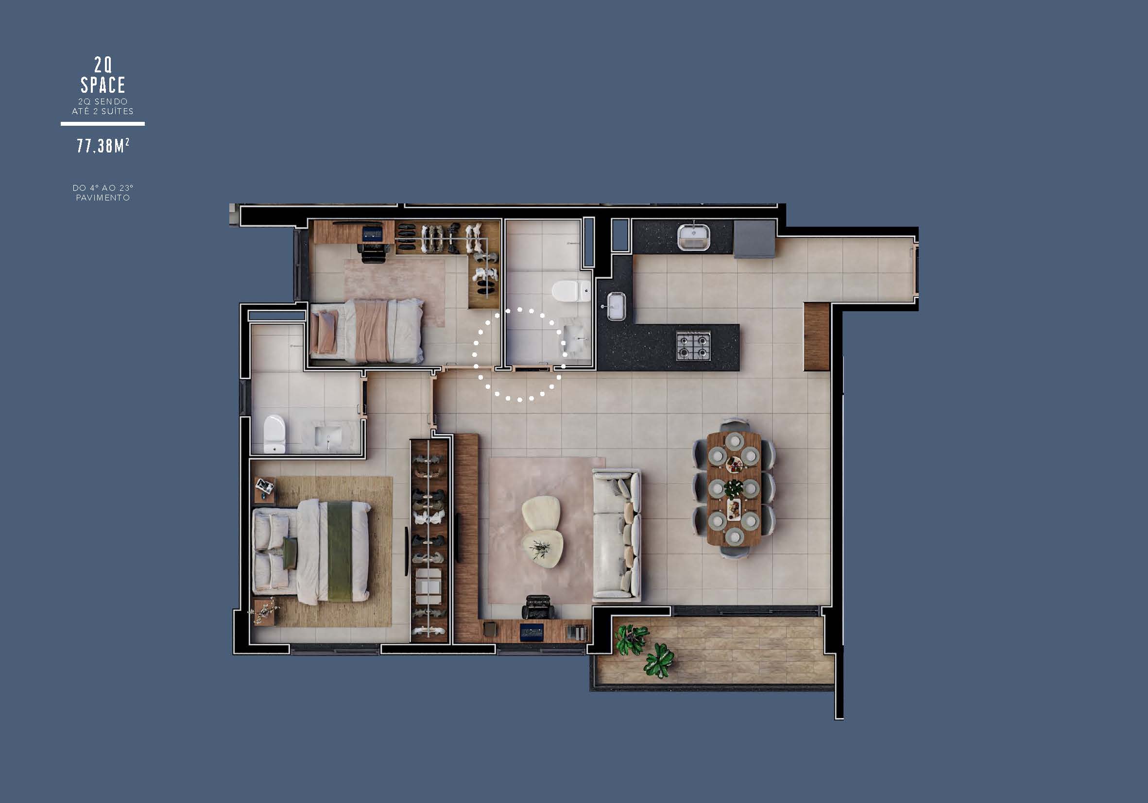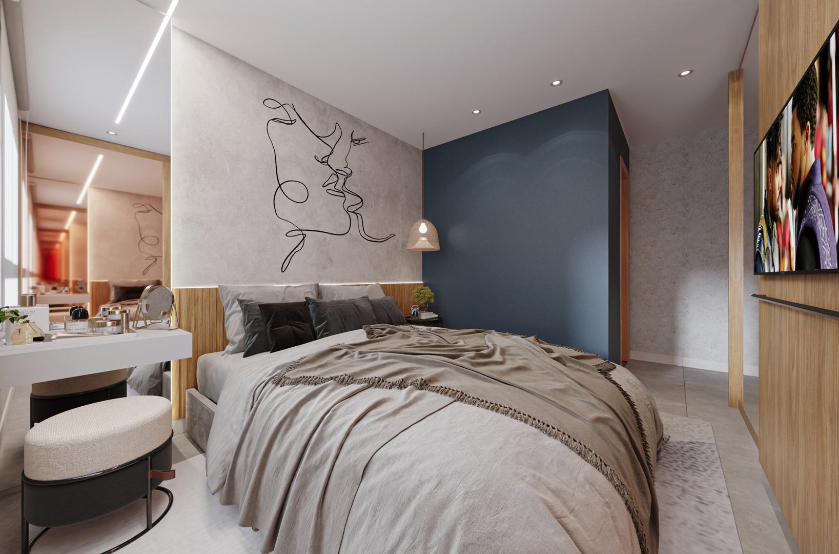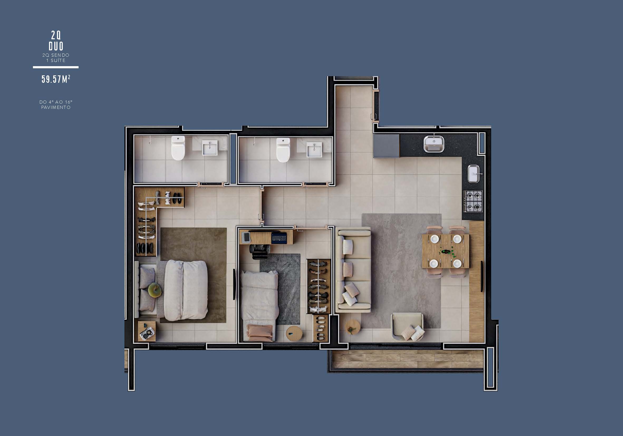 Os apartamentos do Vibe Marista foram planejados para equilibrar design e funcionalidade. Com opções de 2 e 3 quartos, as unidades variam entre 59,57 m² e 111,75 m², oferecendo até 2 suítes e 1 vaga de garagem. As plantas priorizam integração de ambientes, suíte master, varanda ampla e acabamentos de alto padrão que reforçam a exclusividade do projeto.