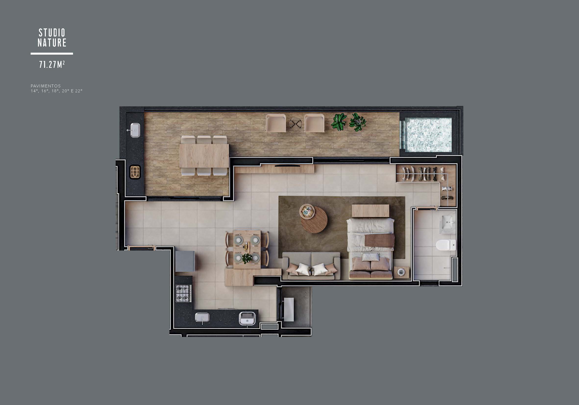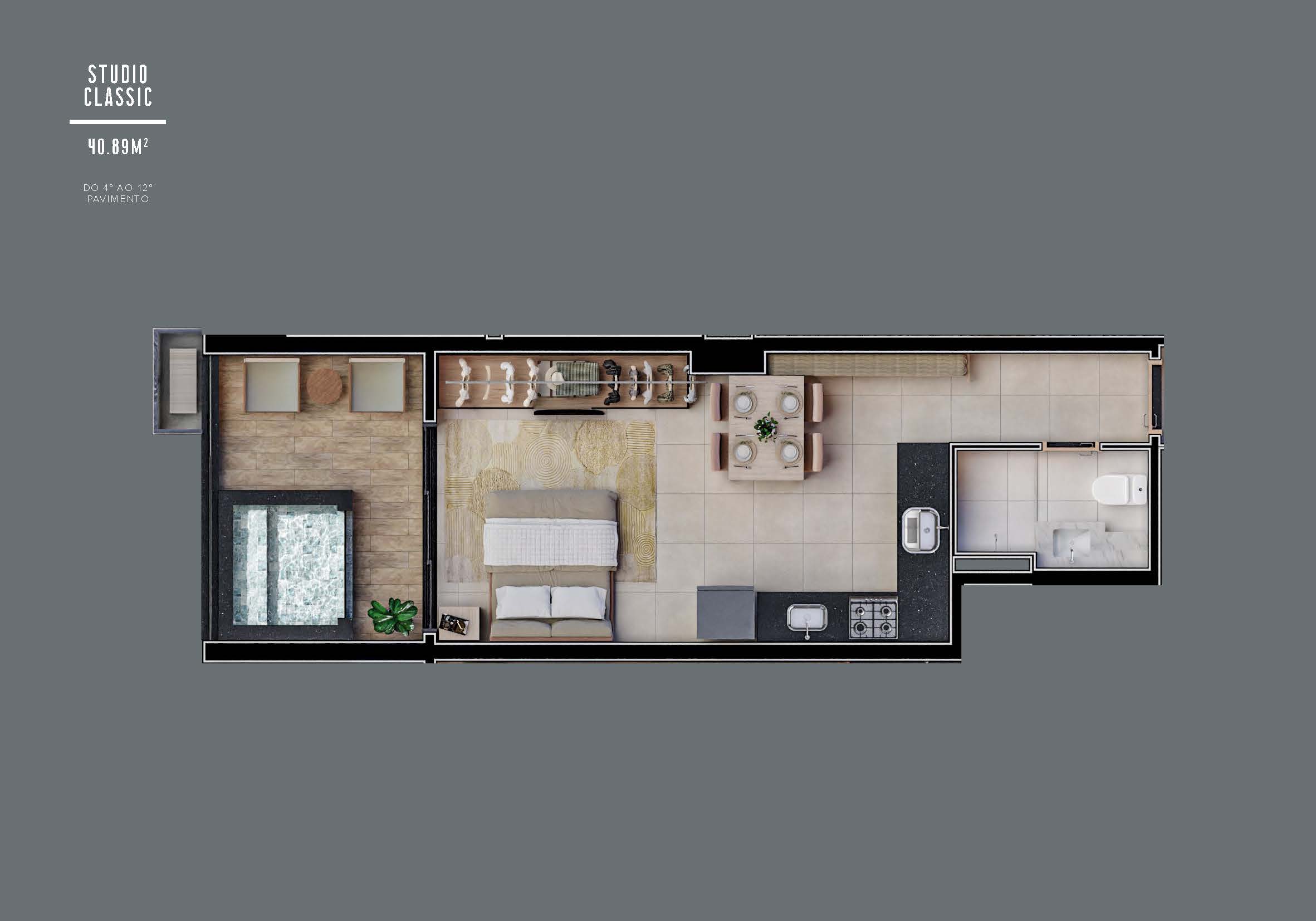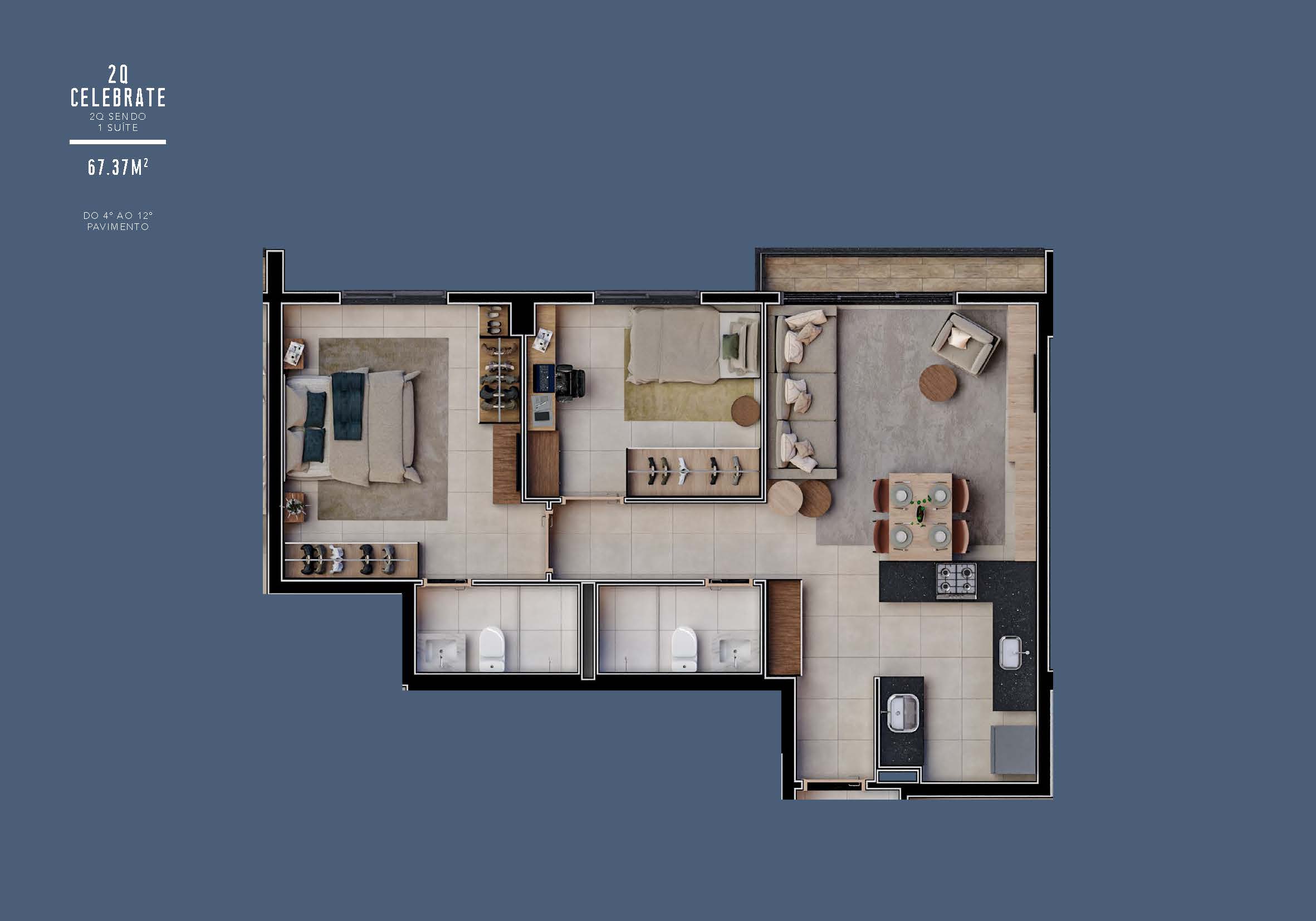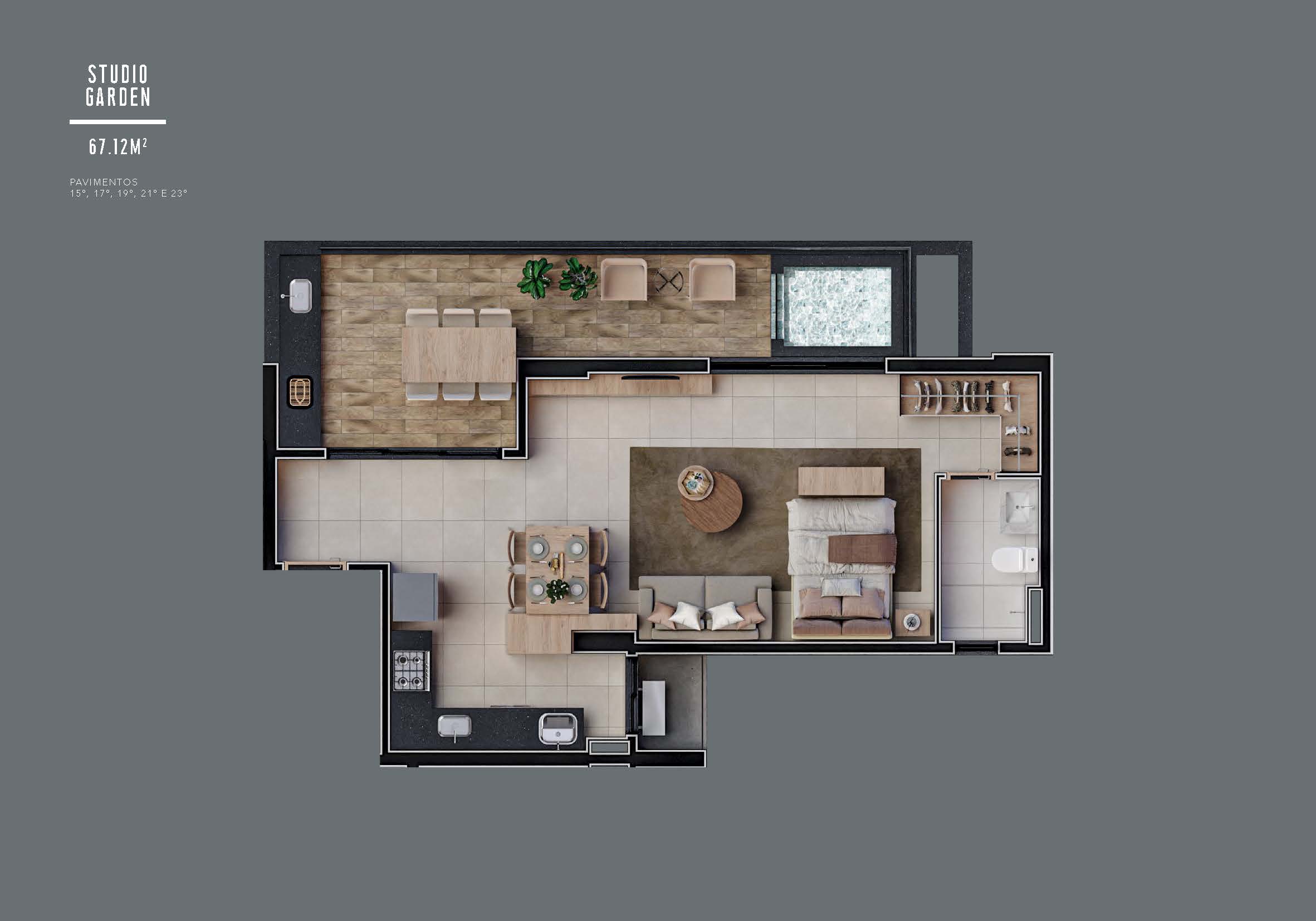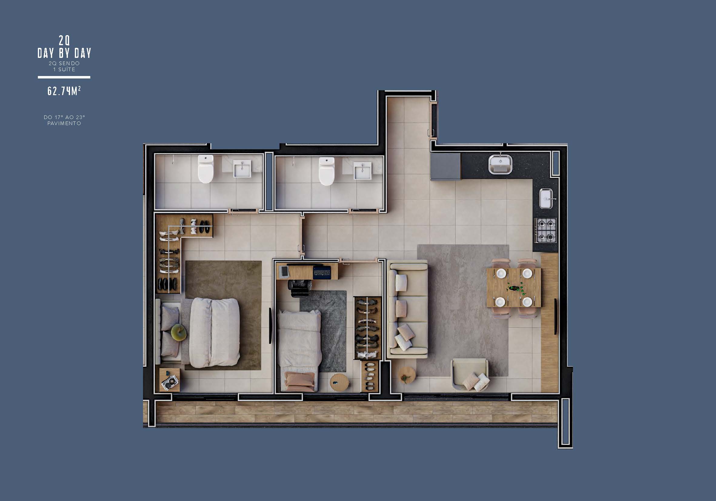Os apartamentos do Vibe Marista foram planejados para equilibrar design e funcionalidade. Com opções de 2 e 3 quartos, as unidades variam entre 59,57 m² e 111,75 m², oferecendo até 2 suítes e 1 vaga de garagem. As plantas priorizam integração de ambientes, suíte master, varanda ampla e acabamentos de alto padrão que reforçam a exclusividade do projeto.