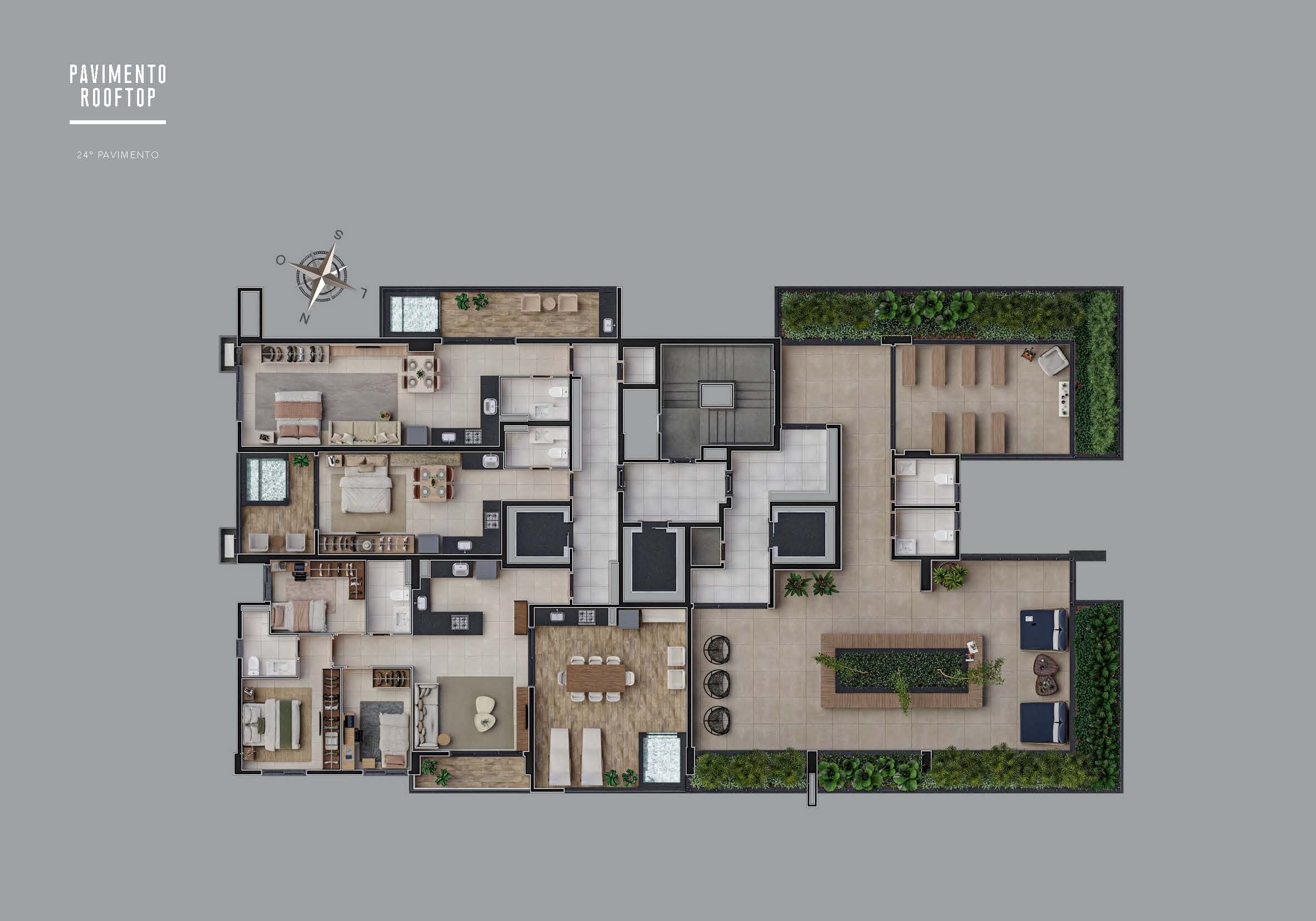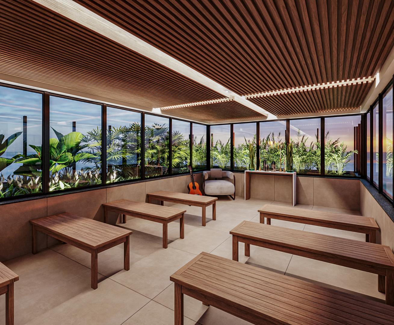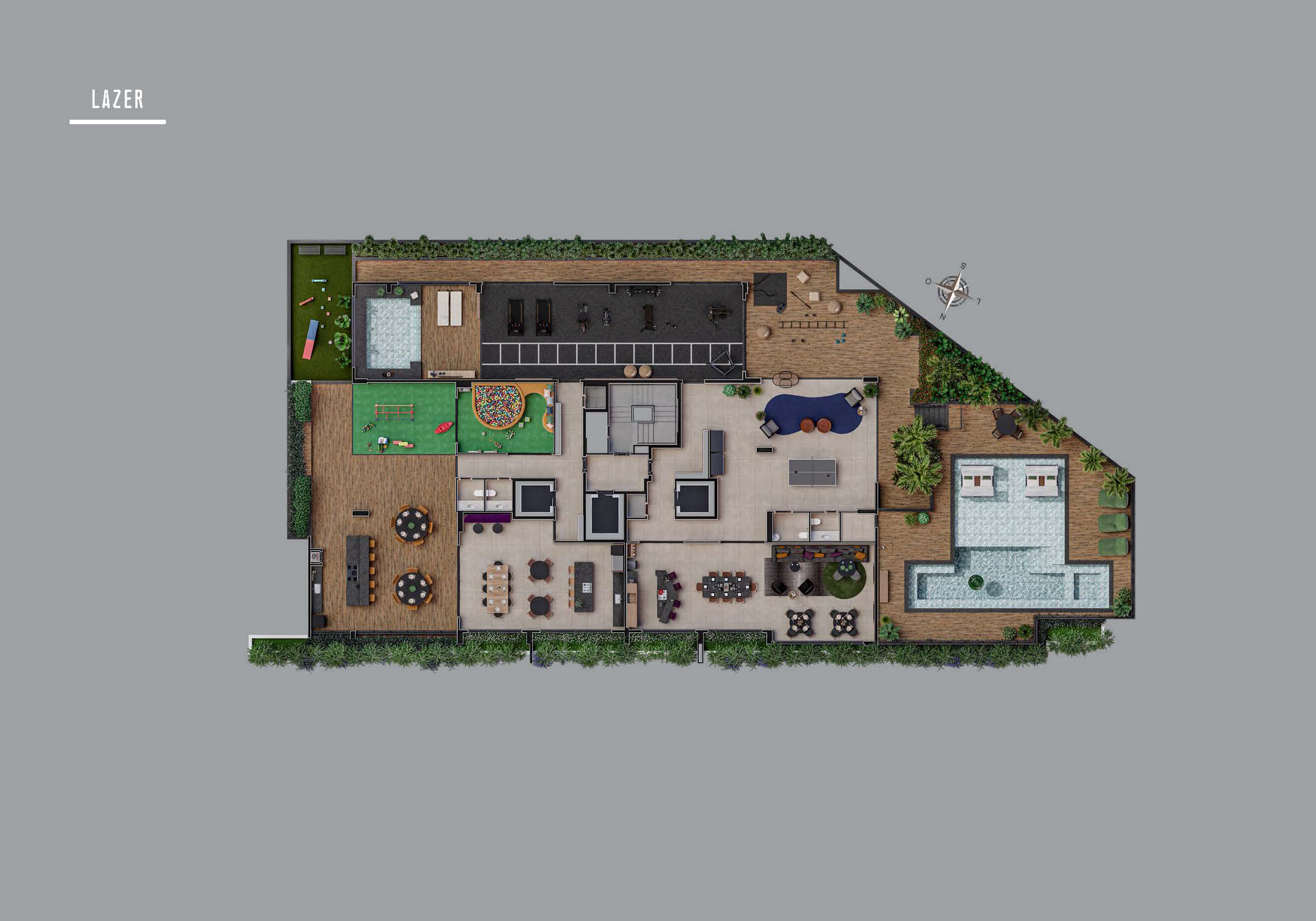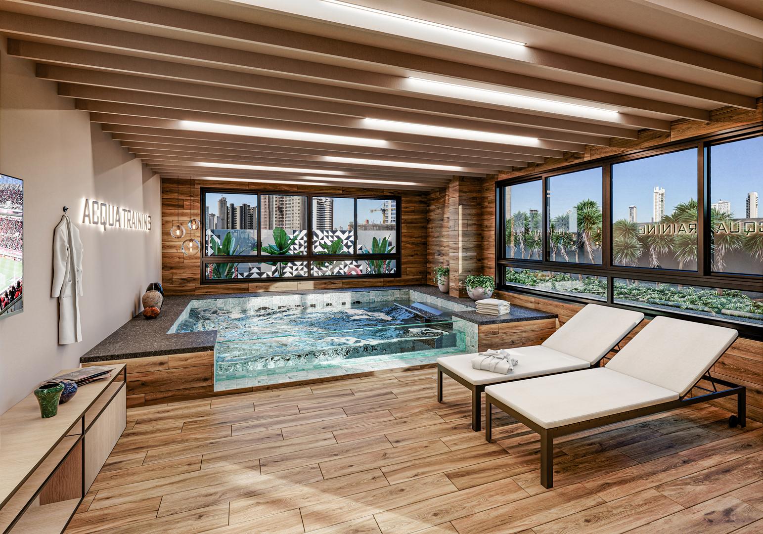 Entre os diferenciais estão a piscina de nado infinito, coworking integrado ao lobby, wine gourmet, fitness indoor e outdoor, espaço de leitura e automação residencial. O conjunto de lazer foi projetado para o estilo de vida moderno.