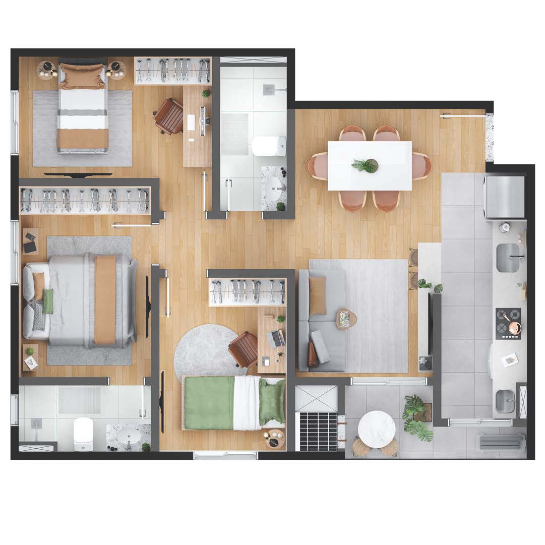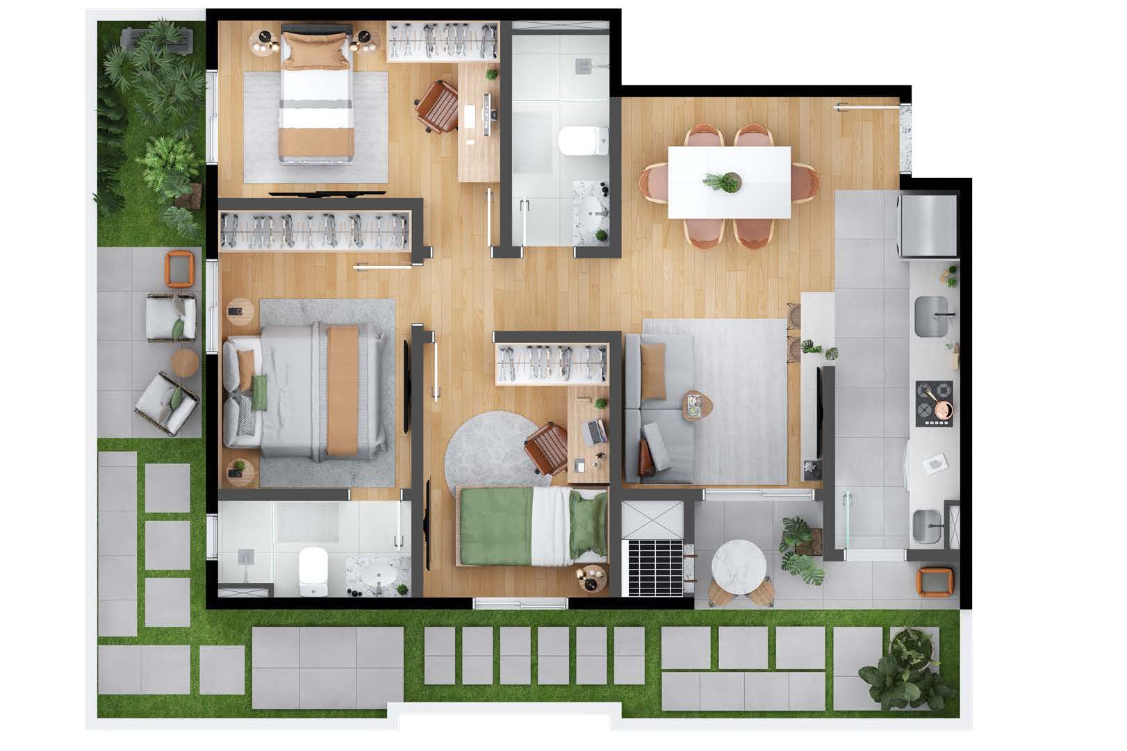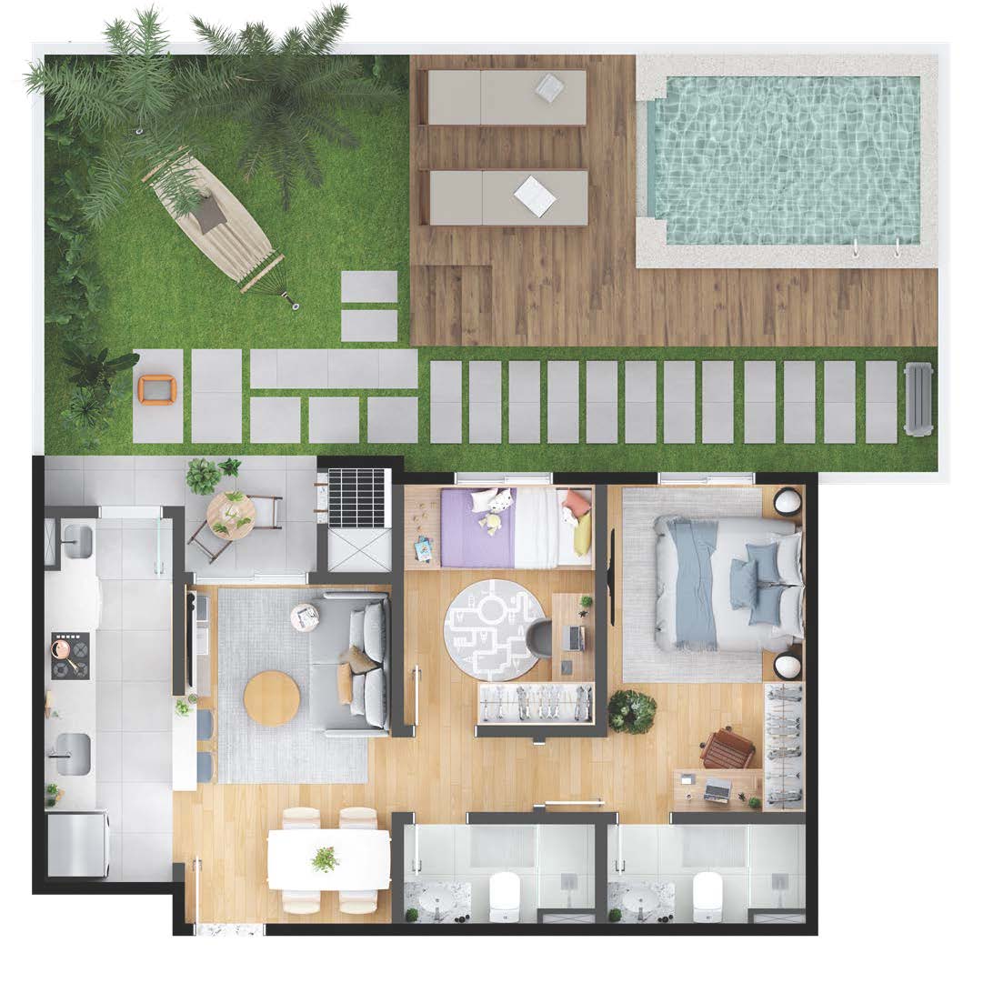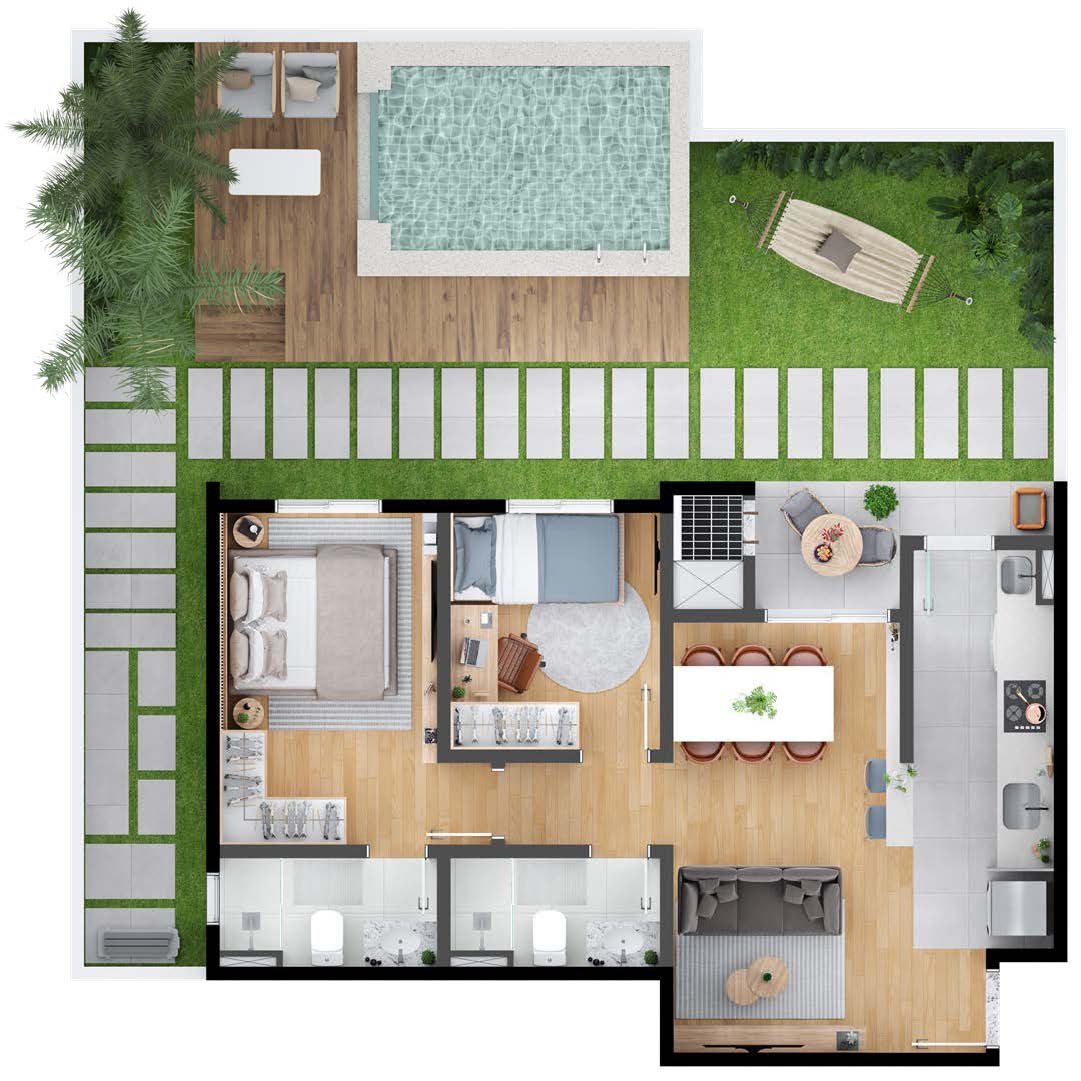 As plantas variam entre apartamentos tipo de 52 m² a 63 m² e gardens de 67 m² a 147 m², com opções de 2 e 3 quartos, todas com suíte e acabamentos de alto padrão.