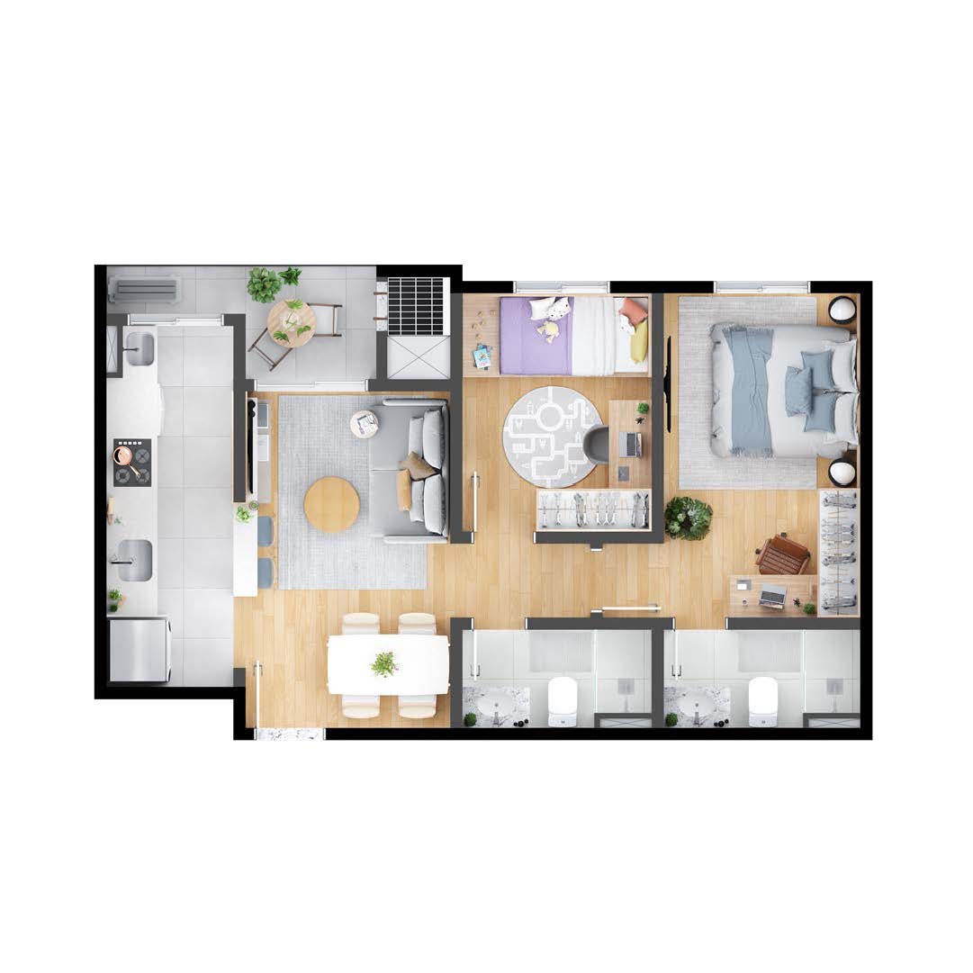 Os apartamentos tipo do MEO Hauer oferecem metragens entre 52 m² e 63 m², com opções de 2 e 3 quartos. Todas as unidades contam com suíte, churrasqueira a carvão na sacada e acabamentos de qualidade, como piso cerâmico retificado, bancadas em granito e infraestrutura para ar-condicionado. Os ambientes são funcionais e bem iluminados, proporcionando conforto e praticidade.