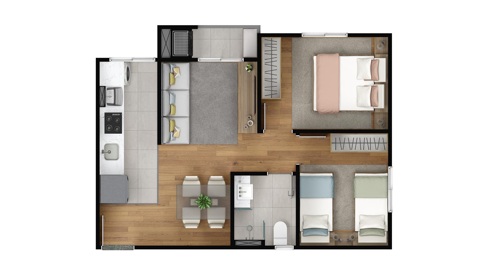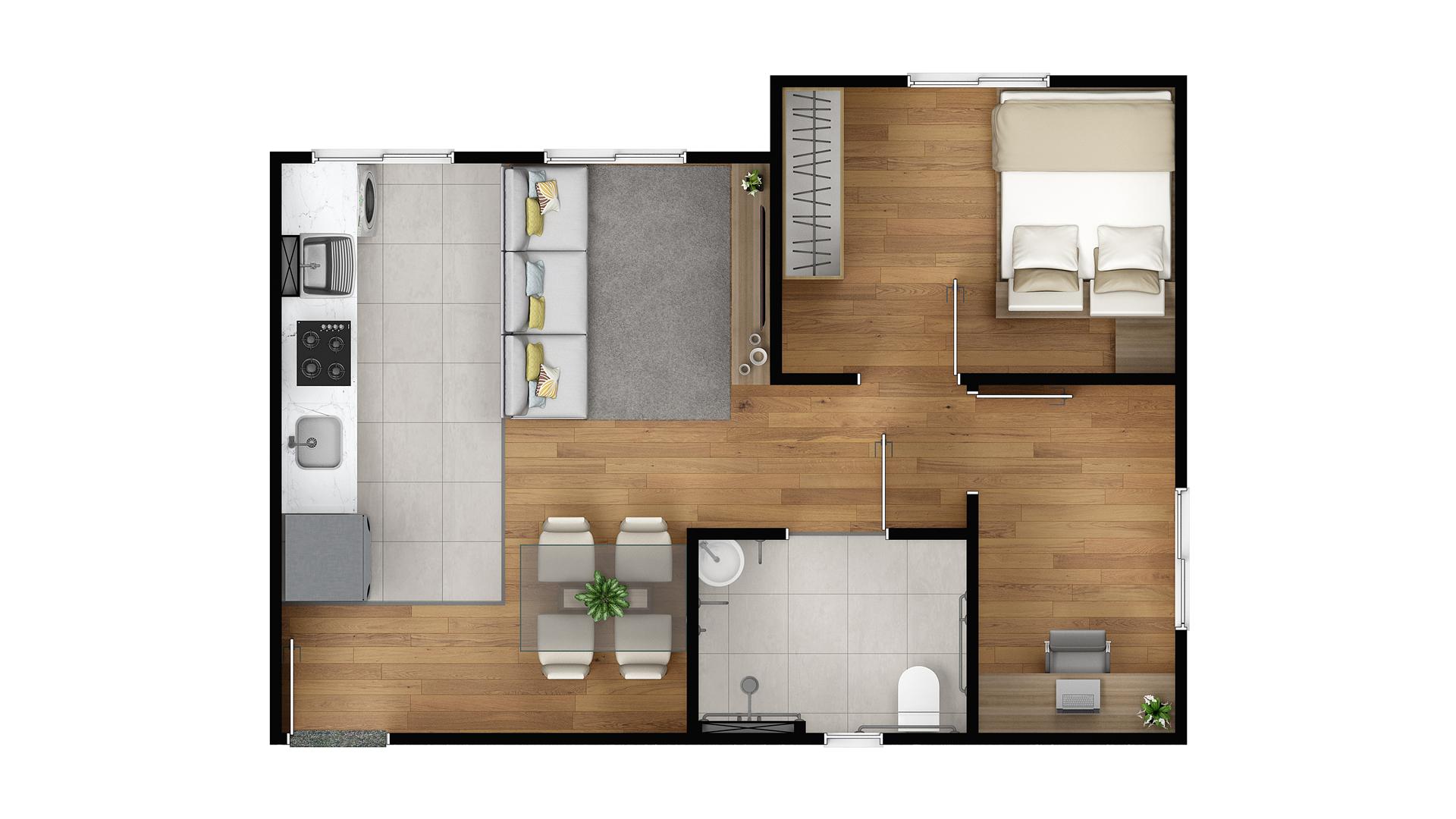 Os apartamentos do Porto Horizonte possuem plantas de 42,56 m² e 40,34 m², com 2 quartos, ambientes ventilados naturalmente e piso cerâmico em todos os espaços. As unidades Tipo 1 incluem sacada com churrasqueira, ampliando o uso da área social. As plantas integram sala, cozinha e jantar, aproveitando melhor a metragem, enquanto as esquadrias em alumínio contribuem para conforto térmico e acústico.