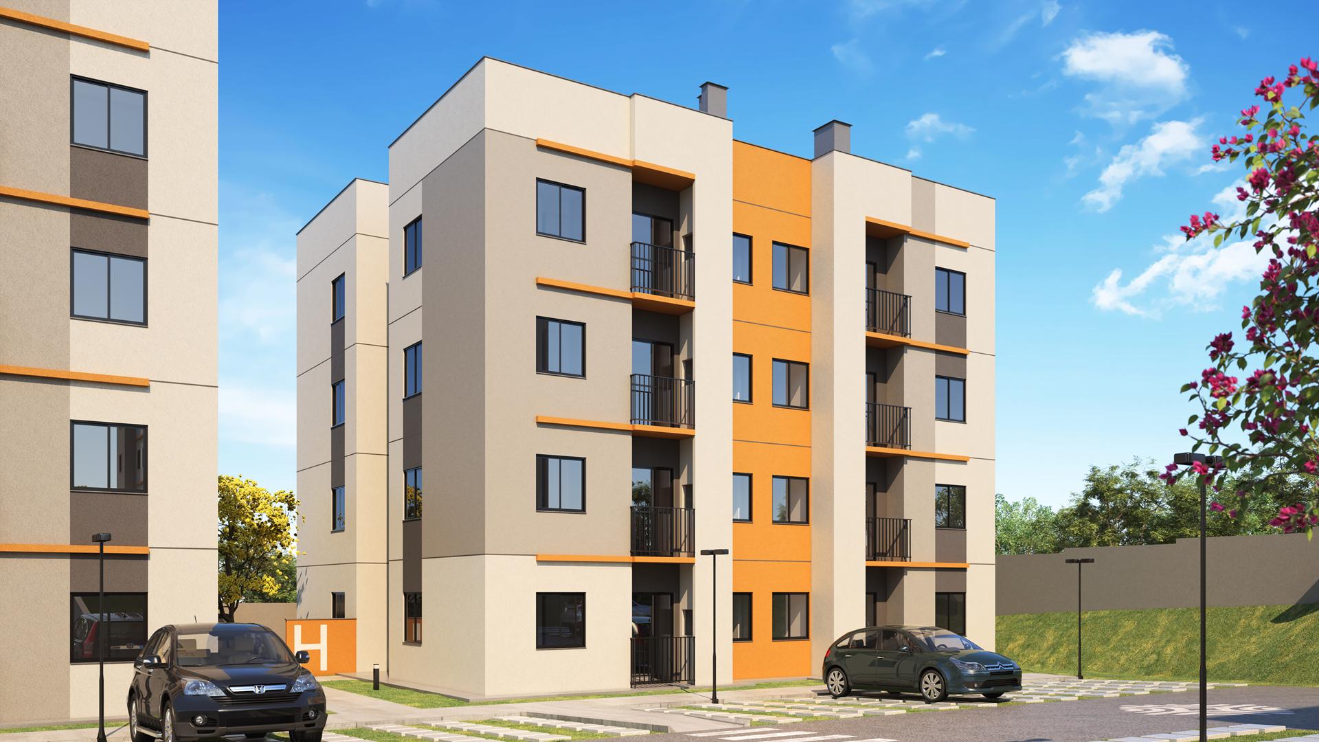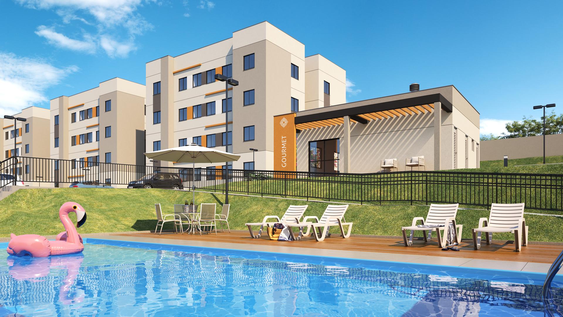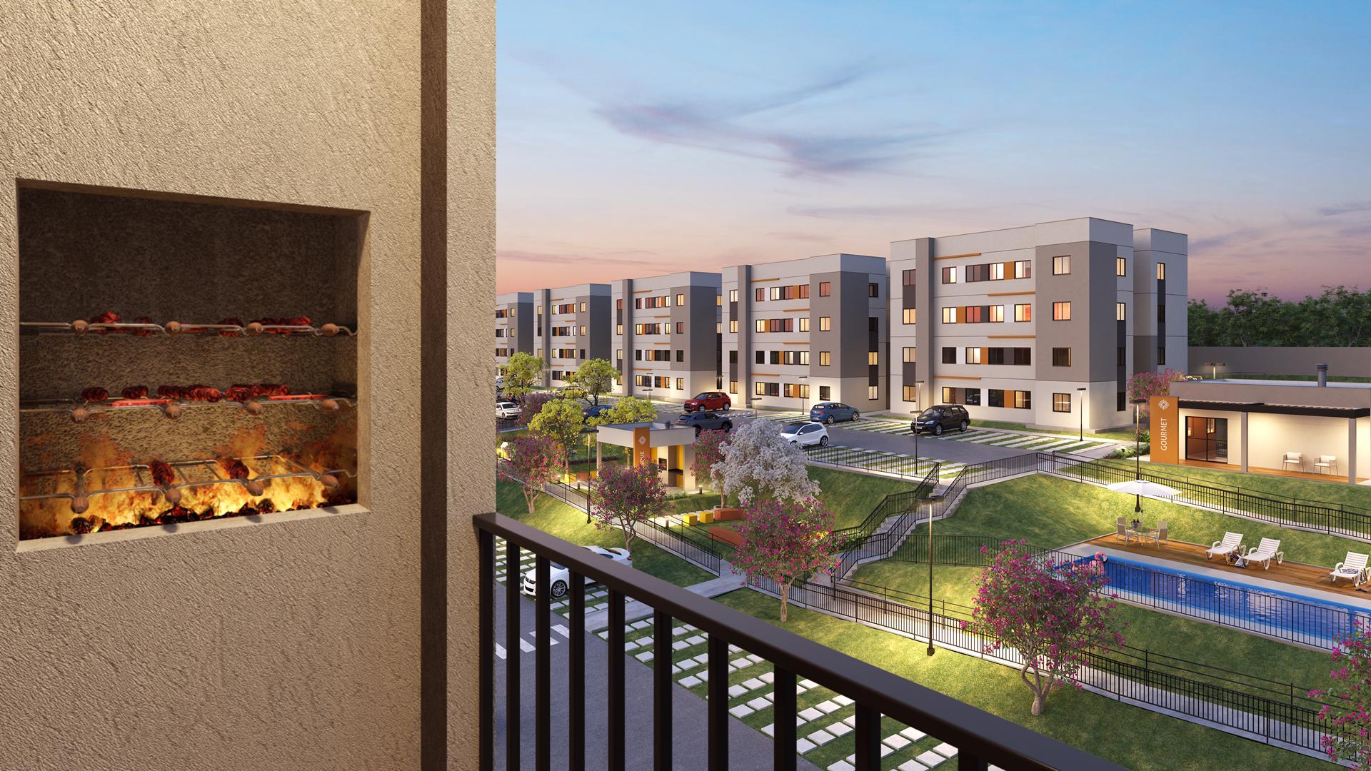 Os apartamentos contam com metragens de 42,56 m² e 40,34 m², ambos com 2 quartos e 1 vaga de estacionamento. As unidades Tipo 1 incluem sacada com churrasqueira, enquanto as Tipo 2 possuem planta compacta e funcional. O condomínio oferece piscina adulto e infantil, salão de festas gourmet, pomar, playground, quadra de areia, quiosques, pet place e espaço zen, acompanhados de áreas comuns entregues equipadas e decoradas.