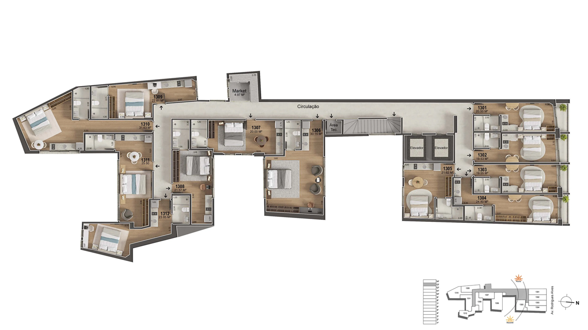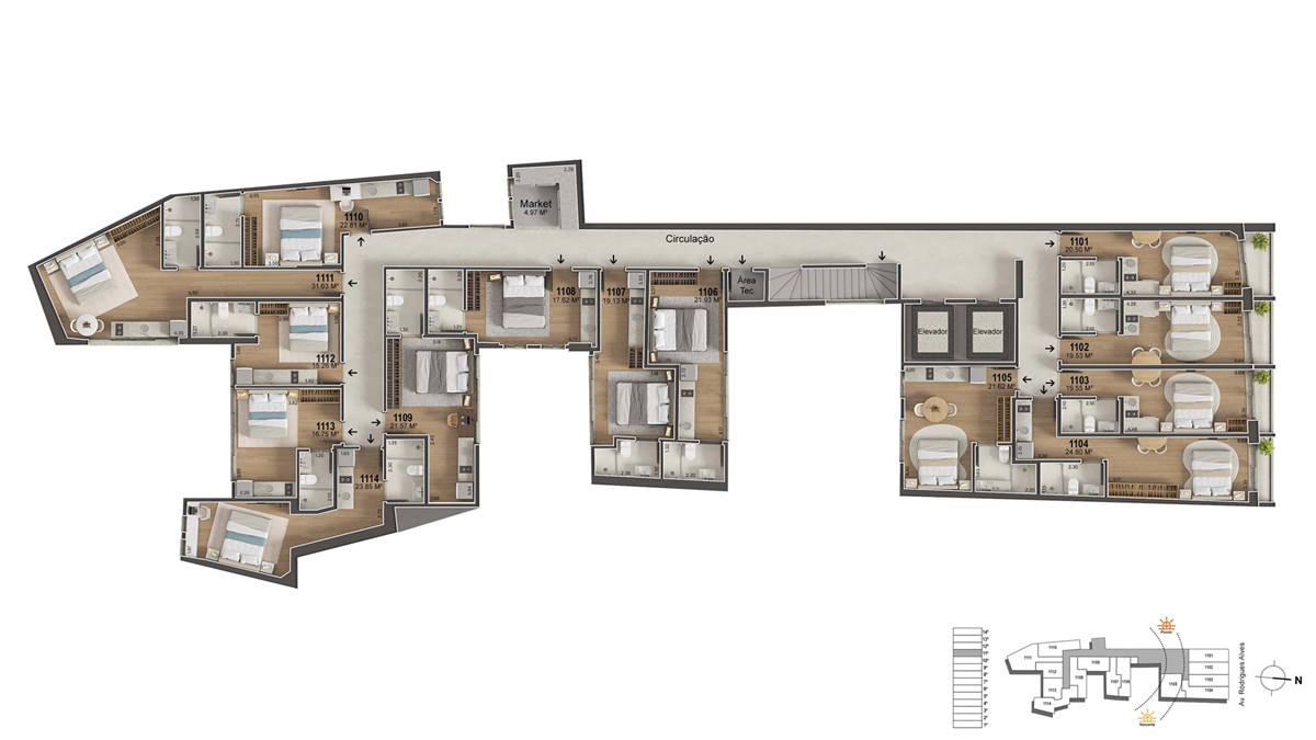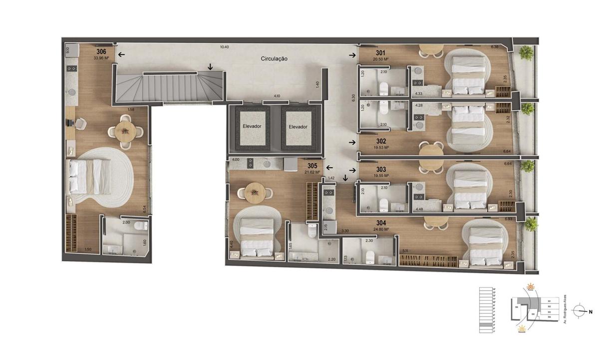 O empreendimento oferece exclusivamente studios compactos, com metragens entre 17 m² e 34 m², pensados para quem busca praticidade e funcionalidade.